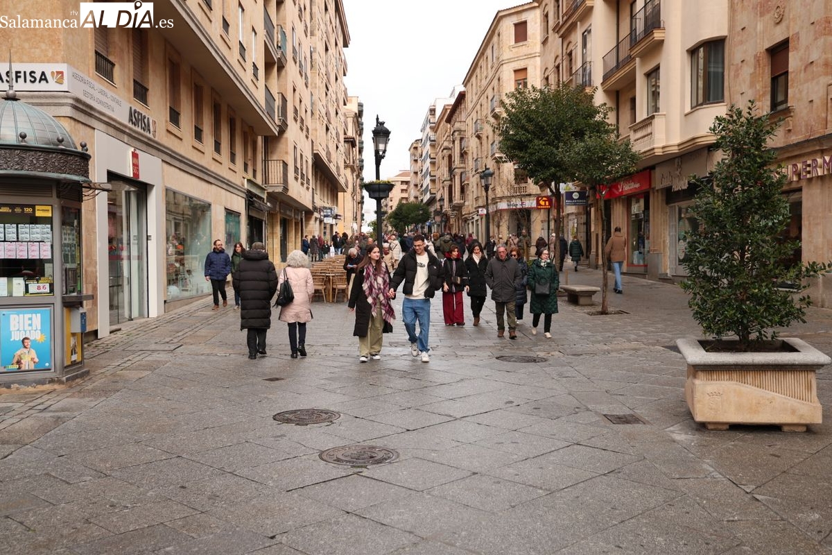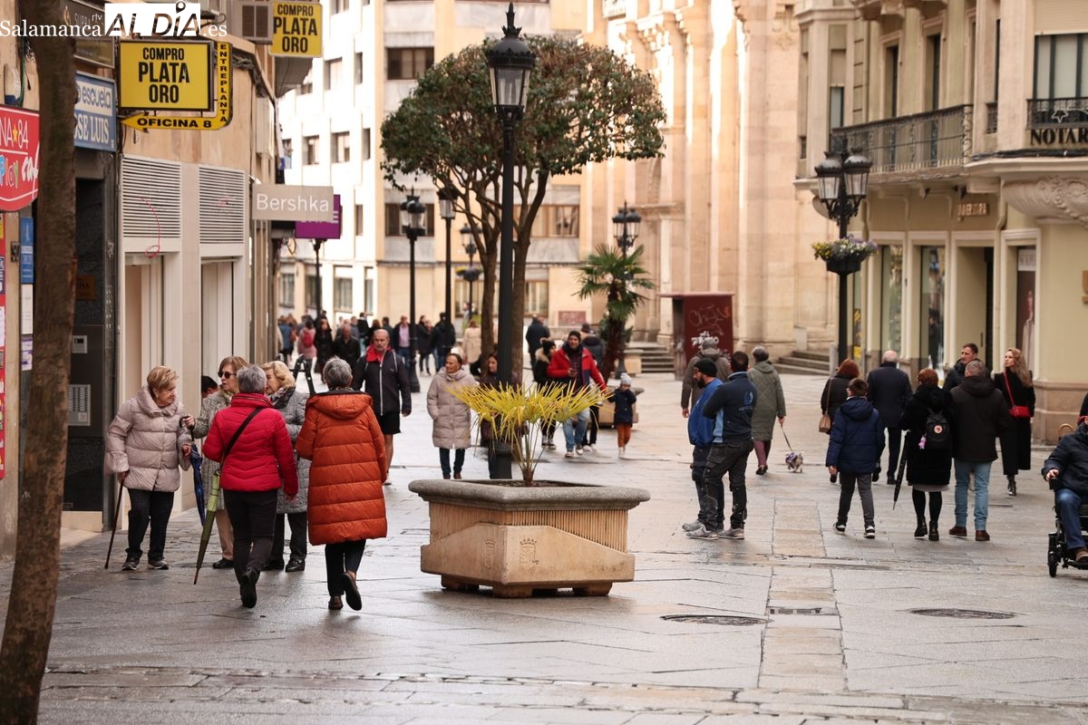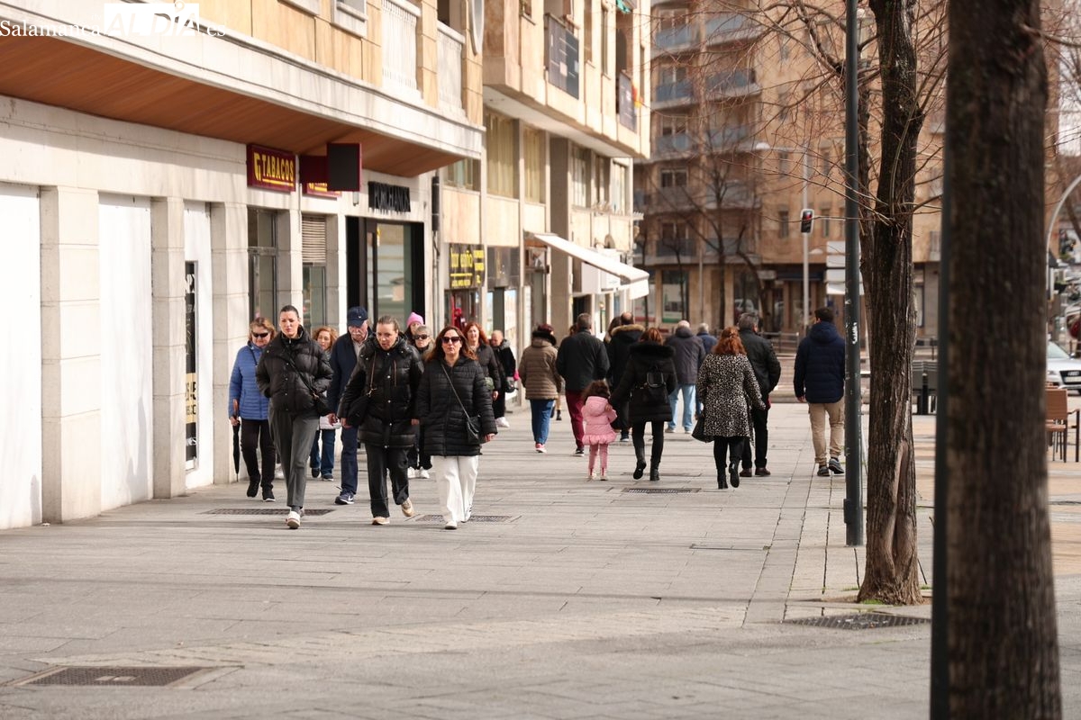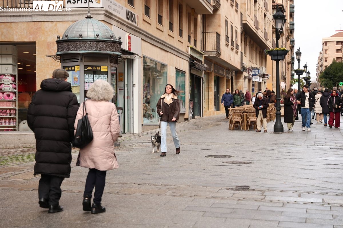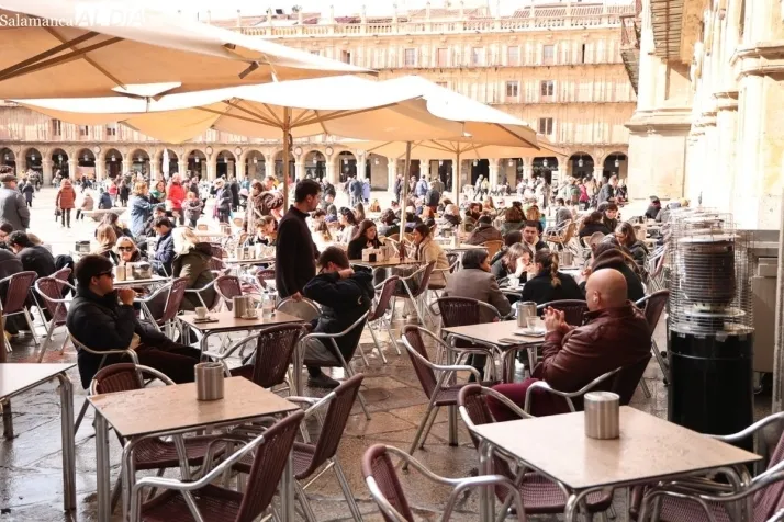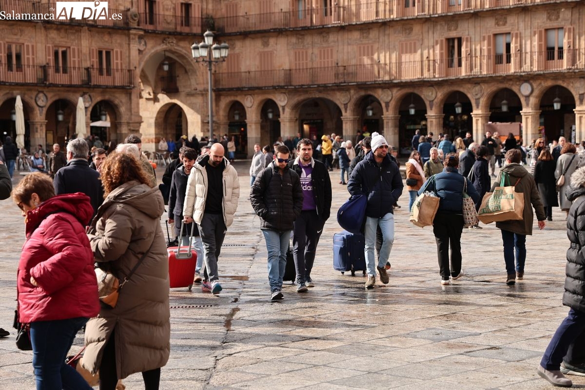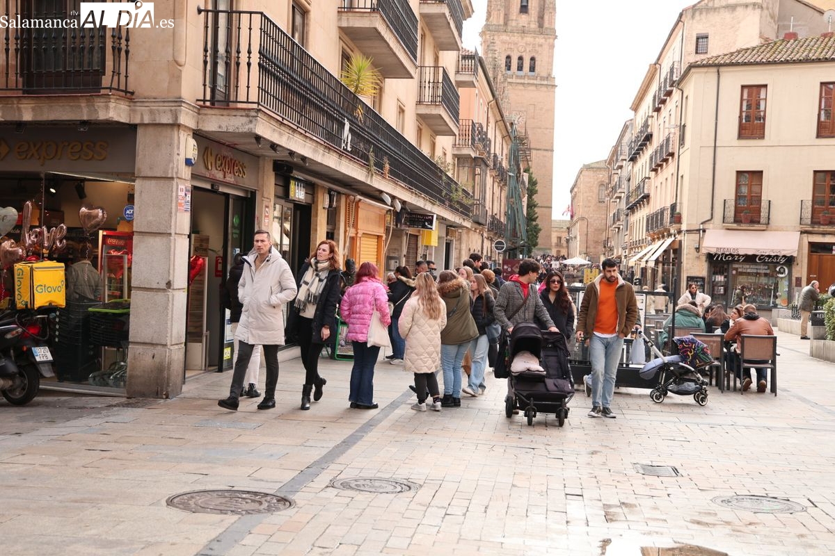 Pese a que el día ha amanecido con lluvia, al mediodía, la mejoría del tiempo, ha invitado a los salmantinos y turistas a pasear por el centro de la ciudad o tomar algo en las terrazas