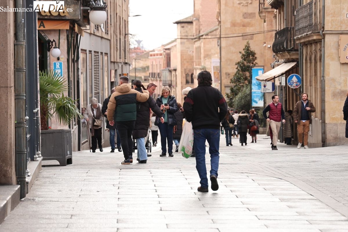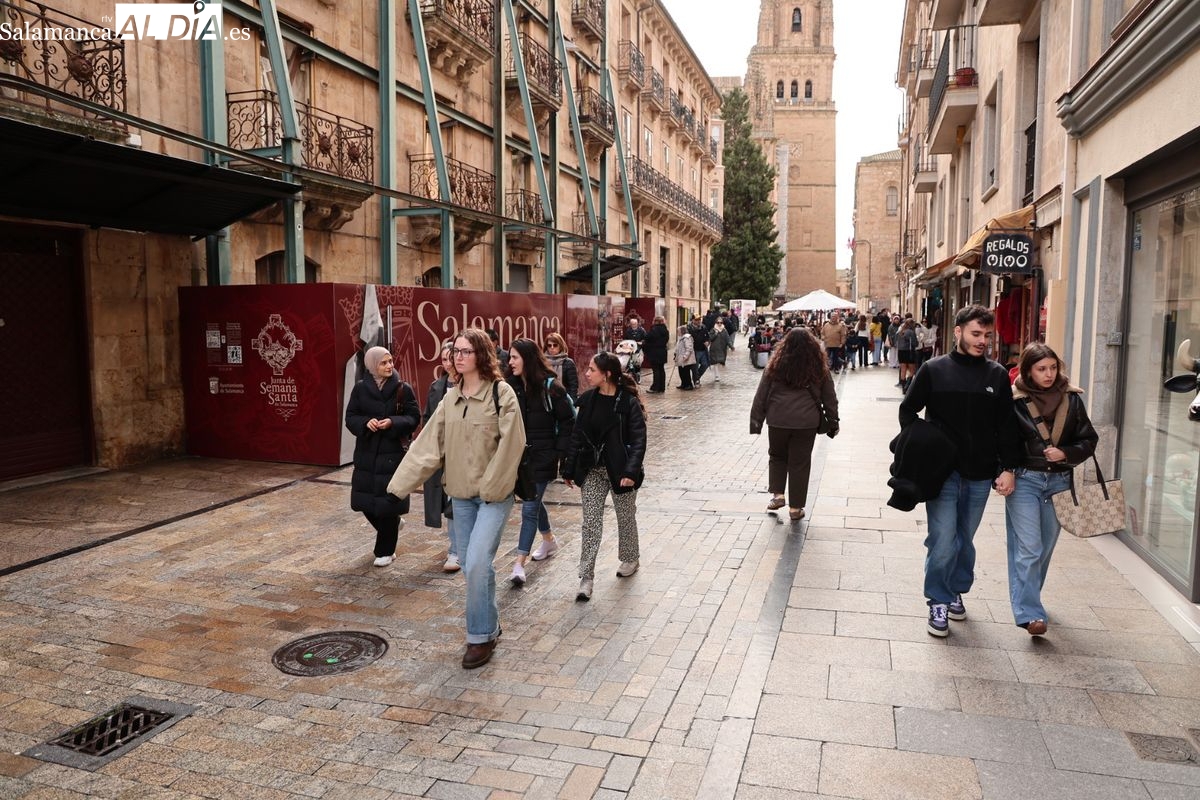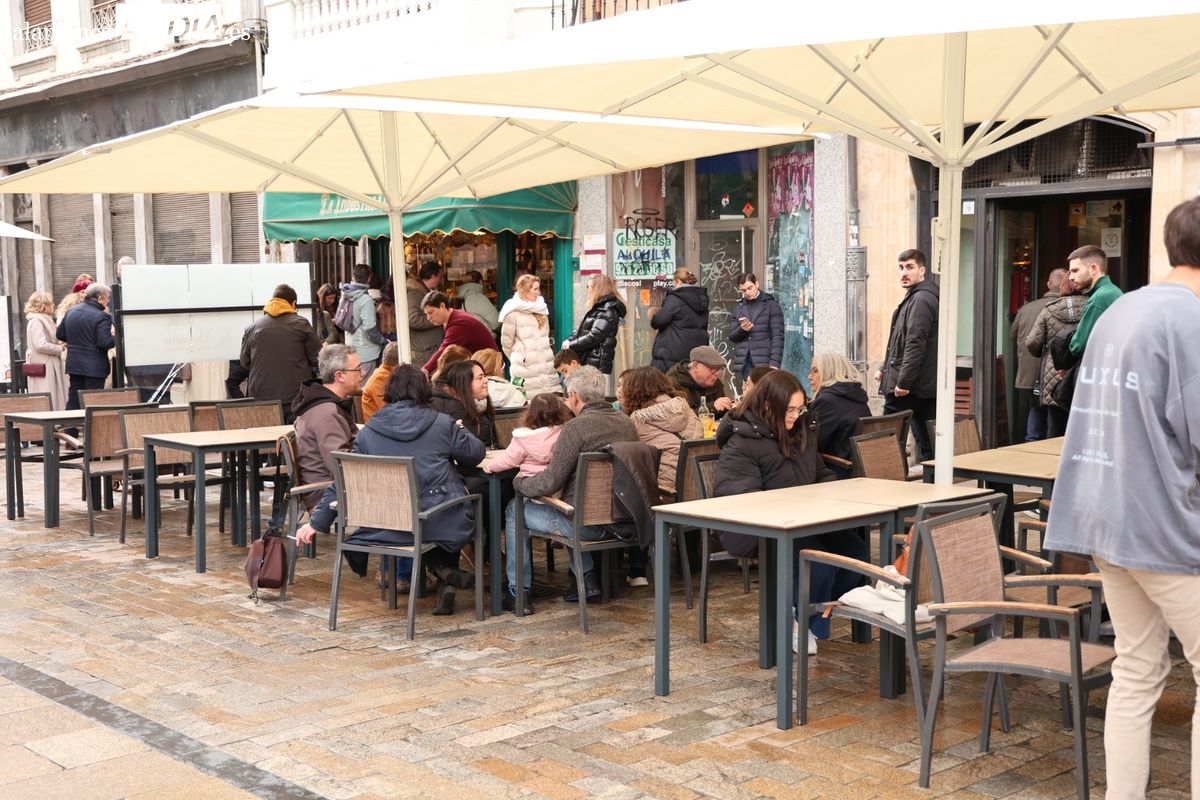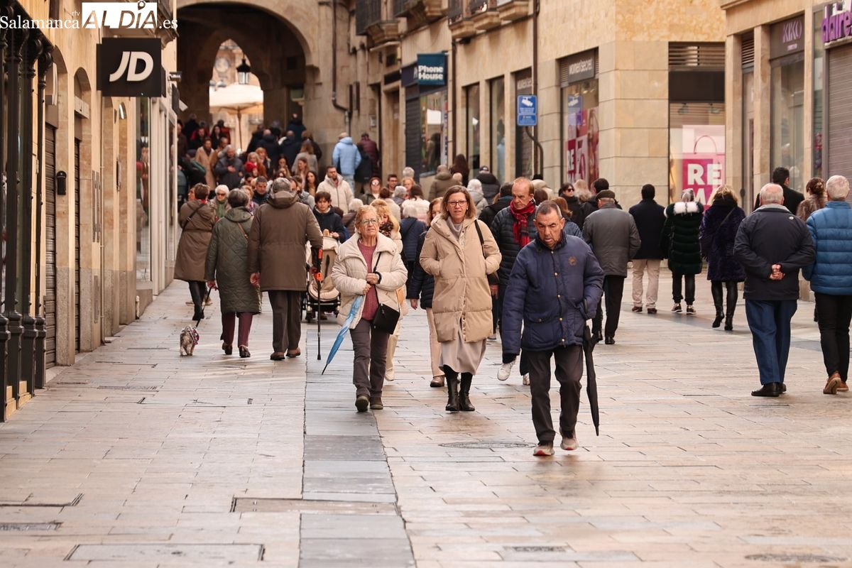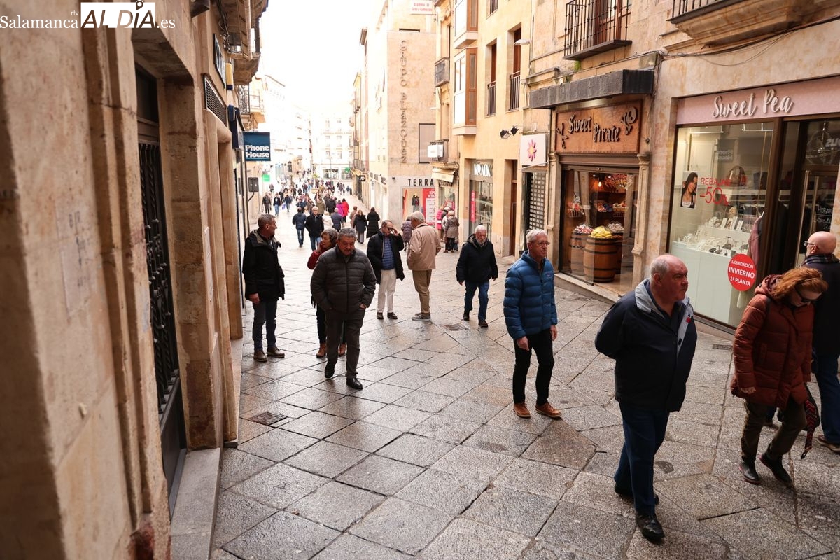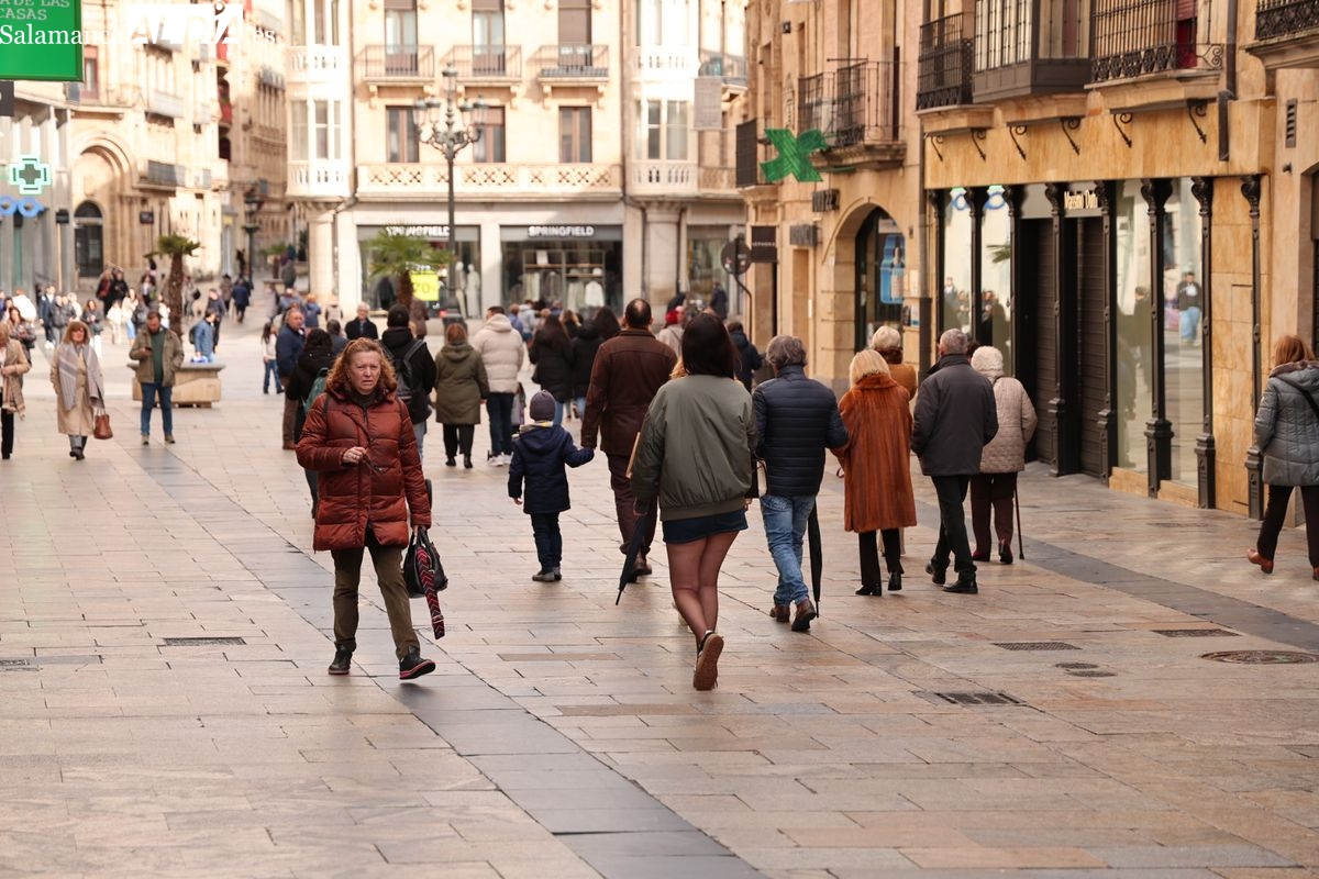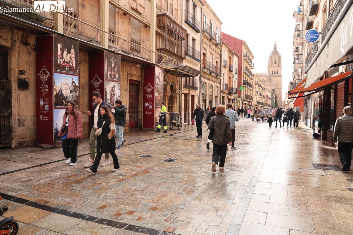 Pese a que el día ha amanecido con lluvia, al mediodía, la mejoría del tiempo, ha invitado a los salmantinos y turistas a pasear por el centro de la ciudad o tomar algo en las terrazas