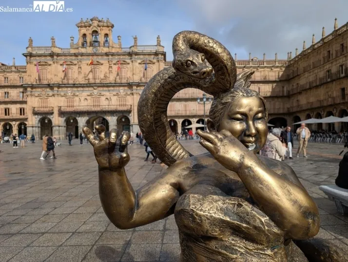 Nuevo intento de ataque a la escultura de Xu Hongfei que se exhibe en la Plaza Mayor de Salamanca con motivo de la celebración del Año Nuevo Chino. Si el pasado día 1 de febrero la obra aparecía sin la lengua de la serpiente, este domingo se ha intentado vanalizar la flauta que toca la mujer esculpida.