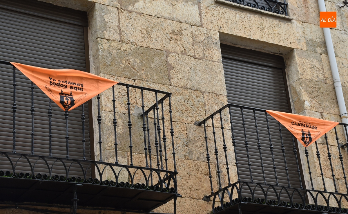 Así, en varios balcones de la ciudad ya se pueden ver unos cuantos pañuelos colgados (por ejemplo en la calle Colegios –al que pertenece una de las imágenes- o en la calle Sancho IV), al igual que en escaparates, como en la Tapicería Miróbriga de la calle Cárcabas.