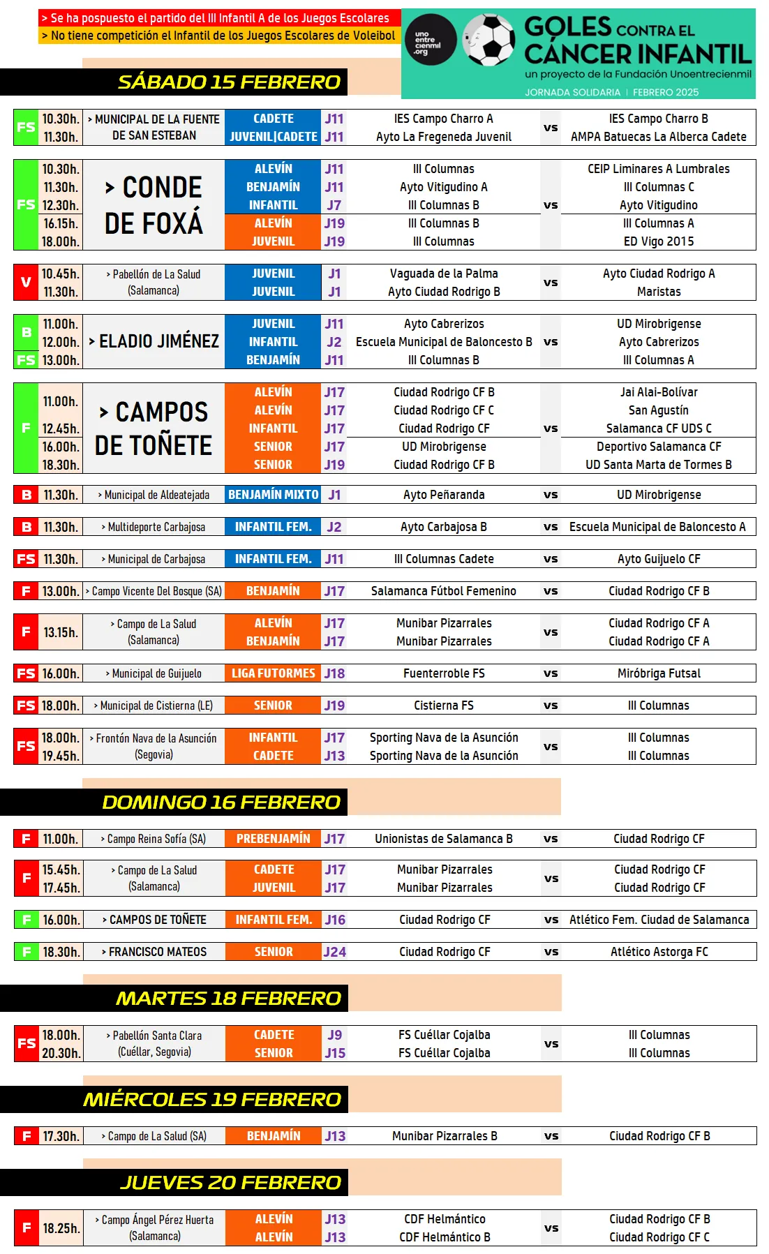 El fin de semana está muy concentrado en la jornada sabatina, con cinco partidos de fútbol sala en Conde de Foxá (entre ellos un nuevo derby Alevín entre los equipos del III Columnas y un encuentro clave para la permanencia del III Juvenil), cinco de fútbol en los Campos de Toñete, y un mix en el Pabellón Eladio Jiménez con dos partidos de baloncesto y uno de fútbol sala de los Juegos Escolares, donde ya han arrancado varias segundas fases.