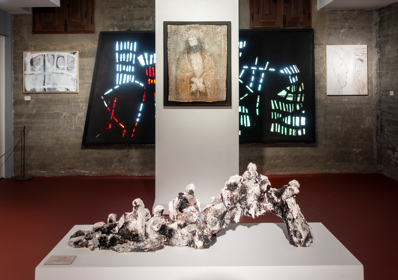 Vicente Molina, antes de ordenarse sacerdote, fue un artista muy activo en la movida de los ochenta, con obra en la Galería Juana Mordó, vanguardista, era un autodidacta entregado al arte pese a que acudía al taller de Venancio Blanco y de Oteiza. El suyo era un trabajo formalista que abandonó ante su vocación religiosa, aunque ante la insistencia para que volviera a ello le puso de nuevo ante los pinceles. Pero su forma de trabajar ya no sería la misma. Utilizaría los recursos más pobres, más precarios, en un intento de mostrar esas tribulaciones que acechan al hombre que precisa de la esperanza. De ahí que su obra sea precisamente un recorrido por la desgracia –persecución, inmigración, guerra, abandono, esa enfermedad que tan bien conoce- que a través de la oración y la contemplación tiene como destino a ese Jesús que concentra la mirada del espectador cuando recorre la sala. Una sala que se reinventa con cada muestra y que siempre sorprende, en este caso con el paso por el viacrucis abstracto y matérico de un artista que usa el soporte como elemento creativo y que mancha de color la totalidad del cuadro, libérrimo y lleno de fuerza con cada brochazo. Para Molina, la vida humana es como el cartón, algo humilde y perecedero, pero la belleza y la esperanza, el sentido de la vida y el descubrimiento son deslumbrantes. De ahí sus insólitas manchas de color que el espectador adivina como imágenes humanas transfiguradas de encuentro y esperanza tras el camino de dolor, el ascesis y la enfermedad. En él la esperanza está siempre presente, y más, como afirma el Papa en su carta, en tiempos de cambio histórico y de incertidumbre en los que debemos mirar a los olvidados, enfermos, inmigrantes, pobres, presos, aquellos a los que dedica su labor pastoral y artística el pintor.