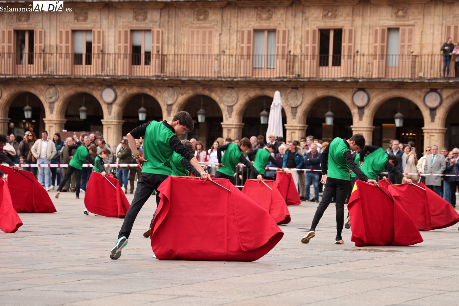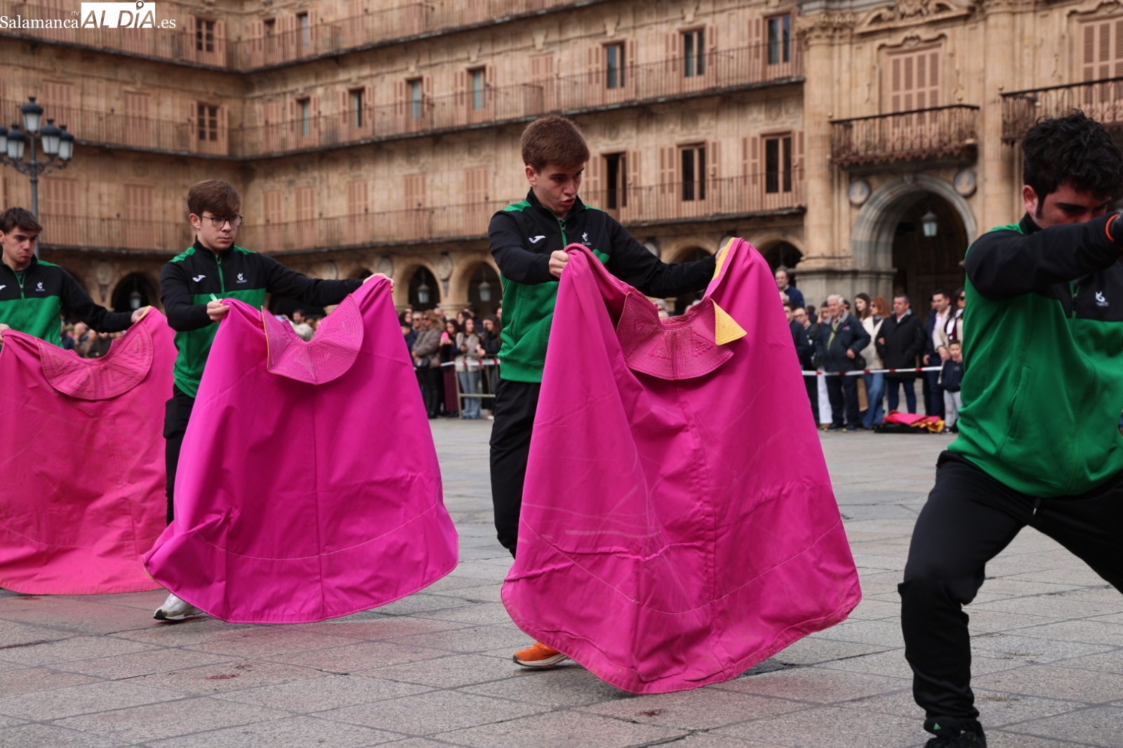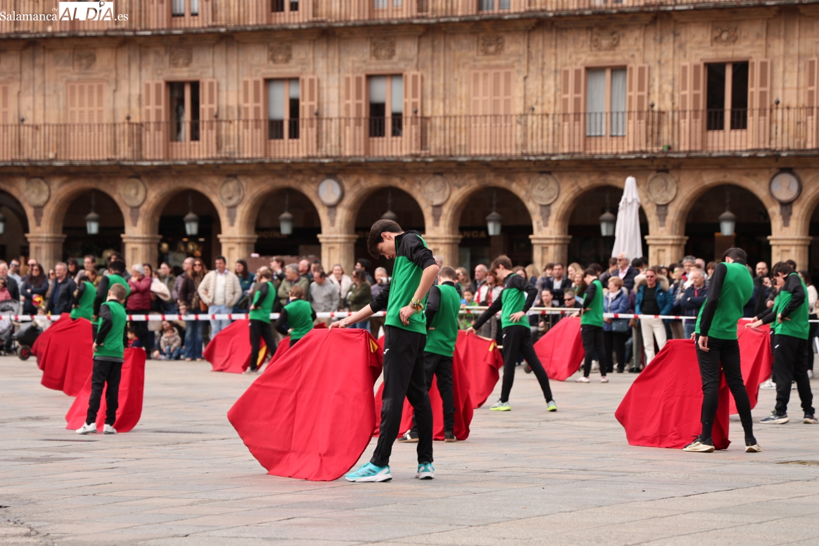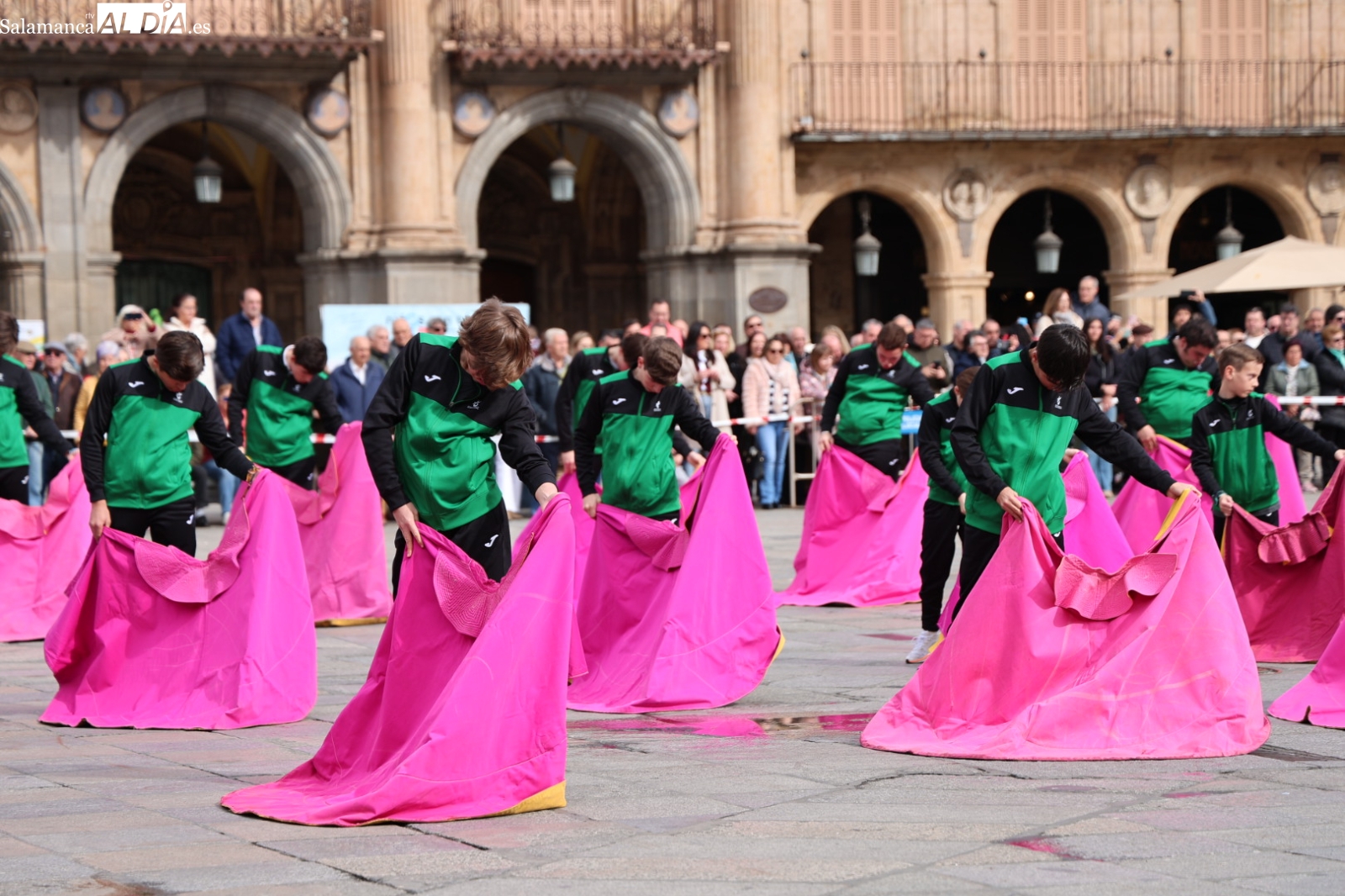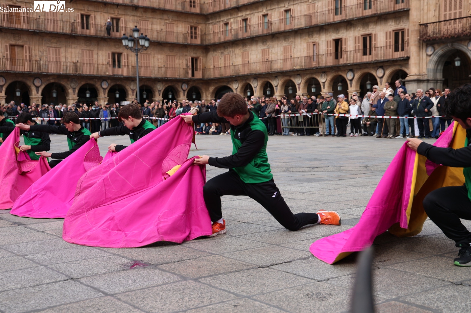 La Plaza Mayor de Salamanca se convirtió en un auténtico ruedo al aire libre en la soleada mañana de este sábado, con los alumnos de la Escuela Taurina de la Diputación ofreciendo una brillante exhibición de toreo de salón para conmemorar el 40º aniversario de la institución. Cientos de espectadores se congregaron en el emblemático ágora salmantino para presenciar el arte y la destreza de las futuras promesas del toreo.