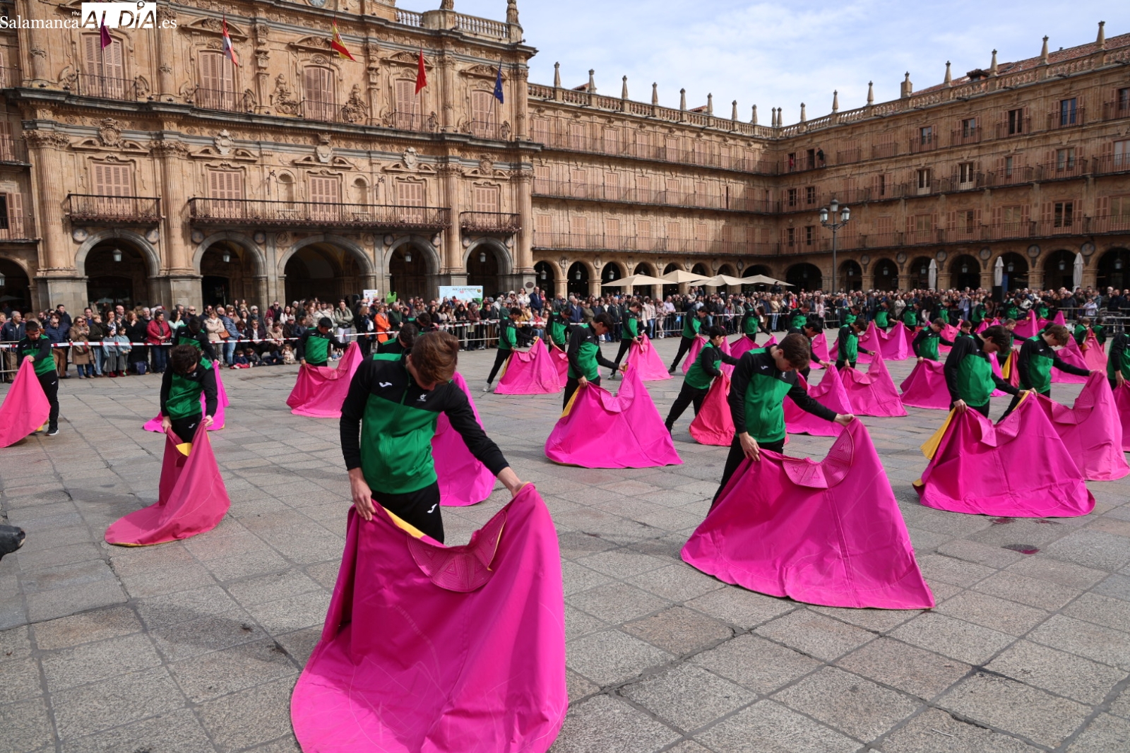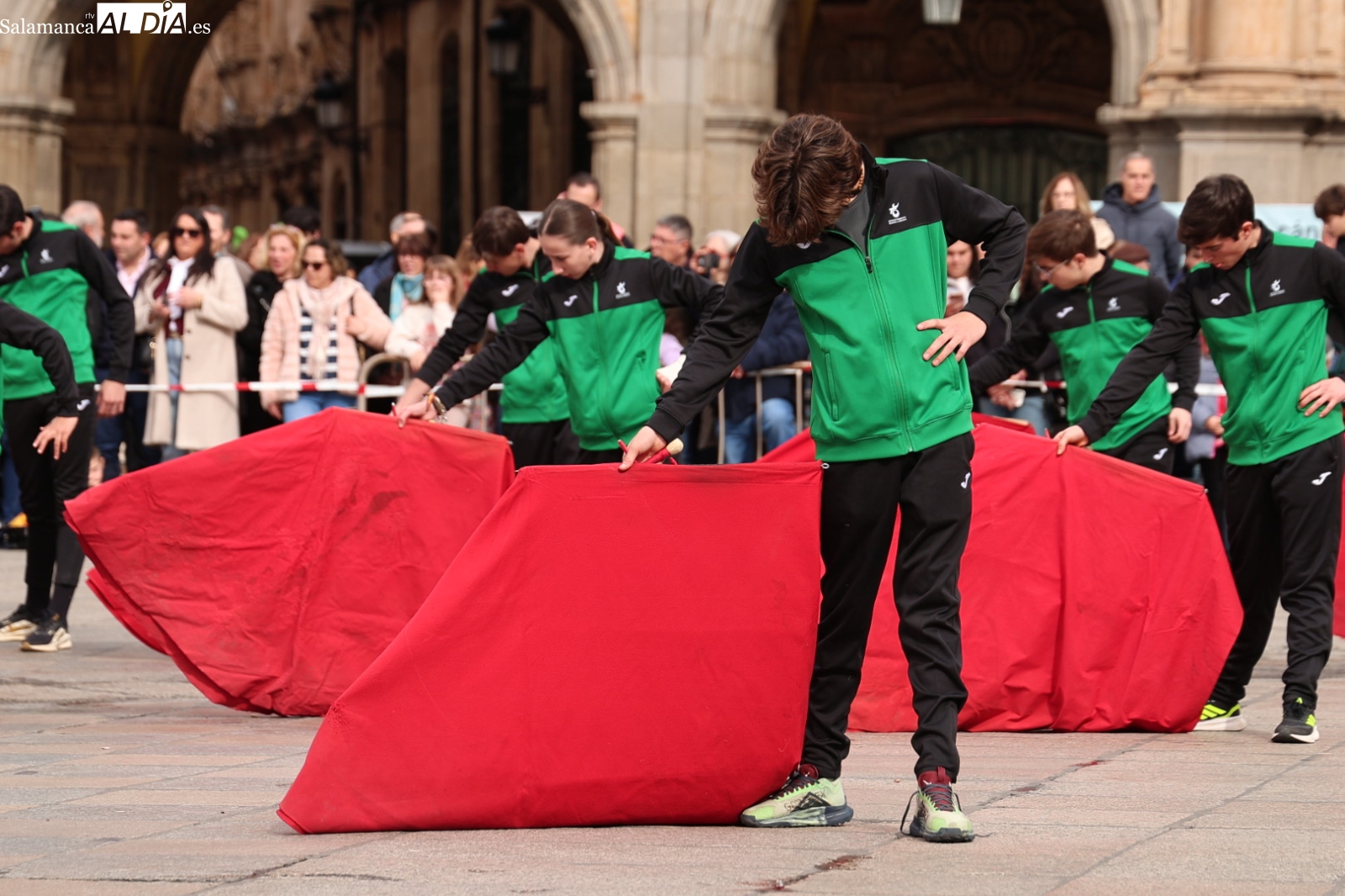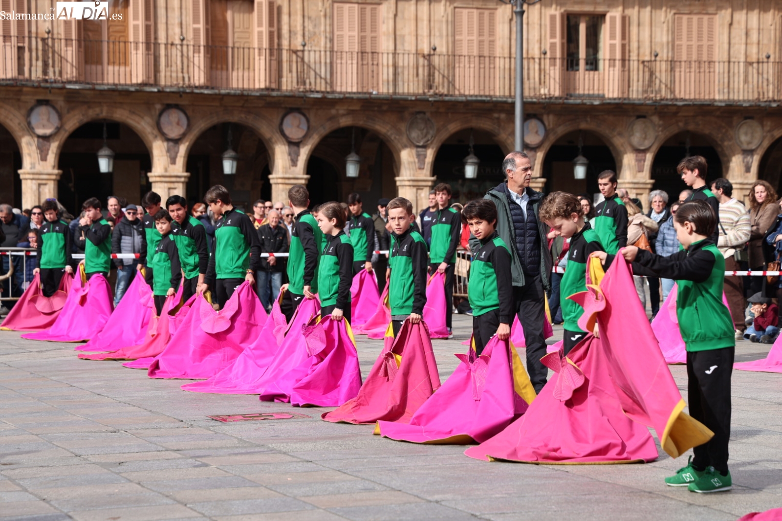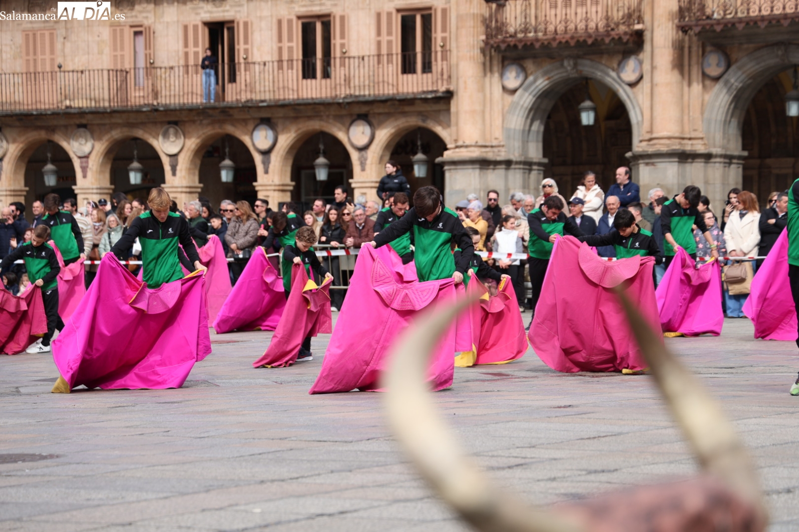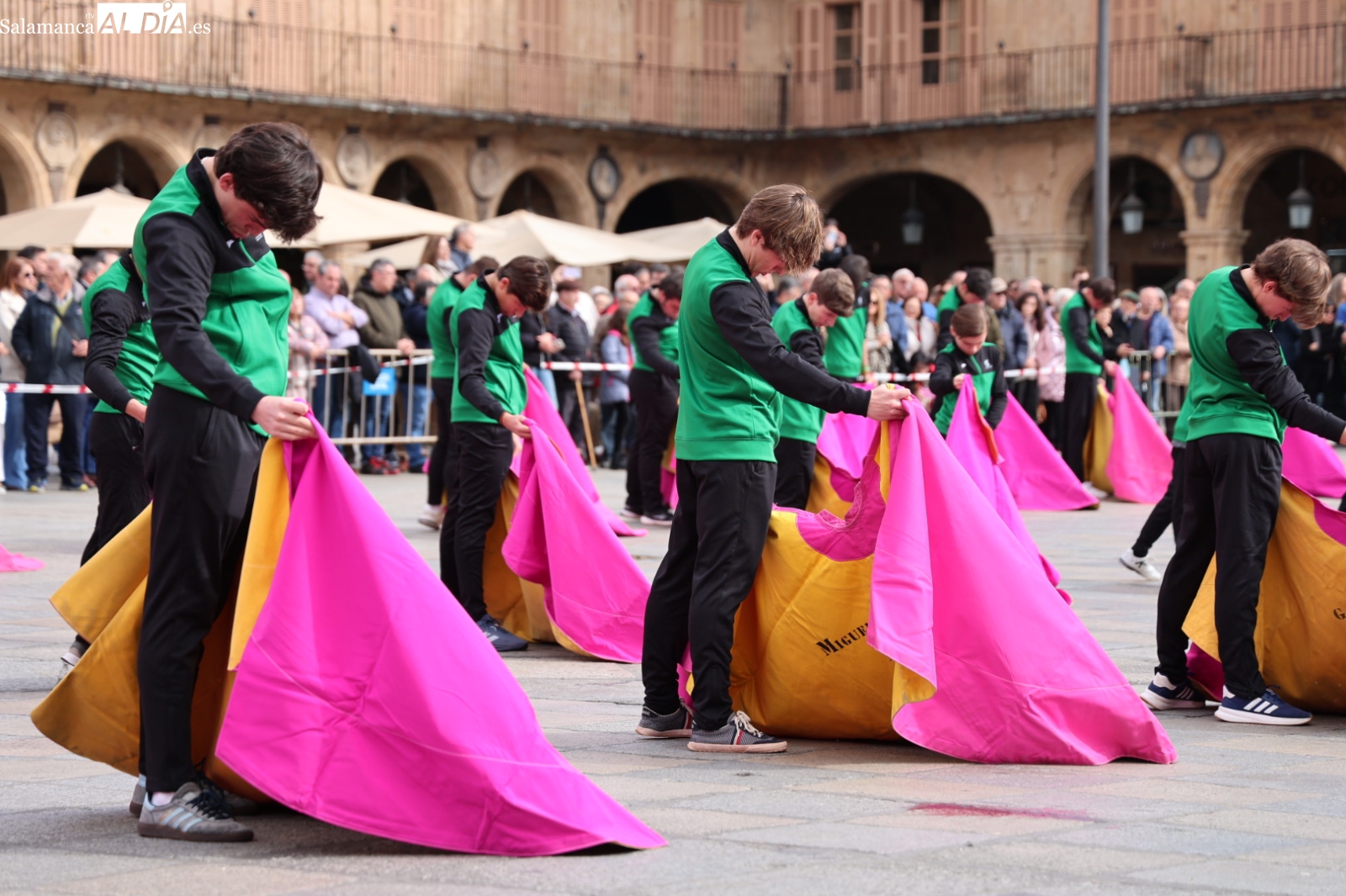 La Plaza Mayor de Salamanca se convirtió en un auténtico ruedo al aire libre en la soleada mañana de este sábado, con los alumnos de la Escuela Taurina de la Diputación ofreciendo una brillante exhibición de toreo de salón para conmemorar el 40º aniversario de la institución. Cientos de espectadores se congregaron en el emblemático ágora salmantino para presenciar el arte y la destreza de las futuras promesas del toreo.