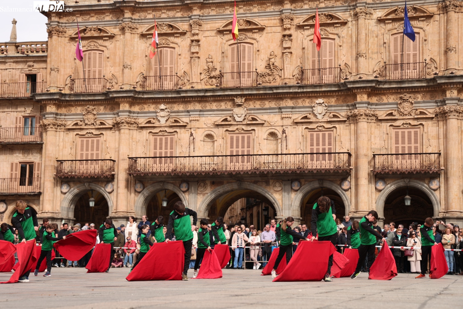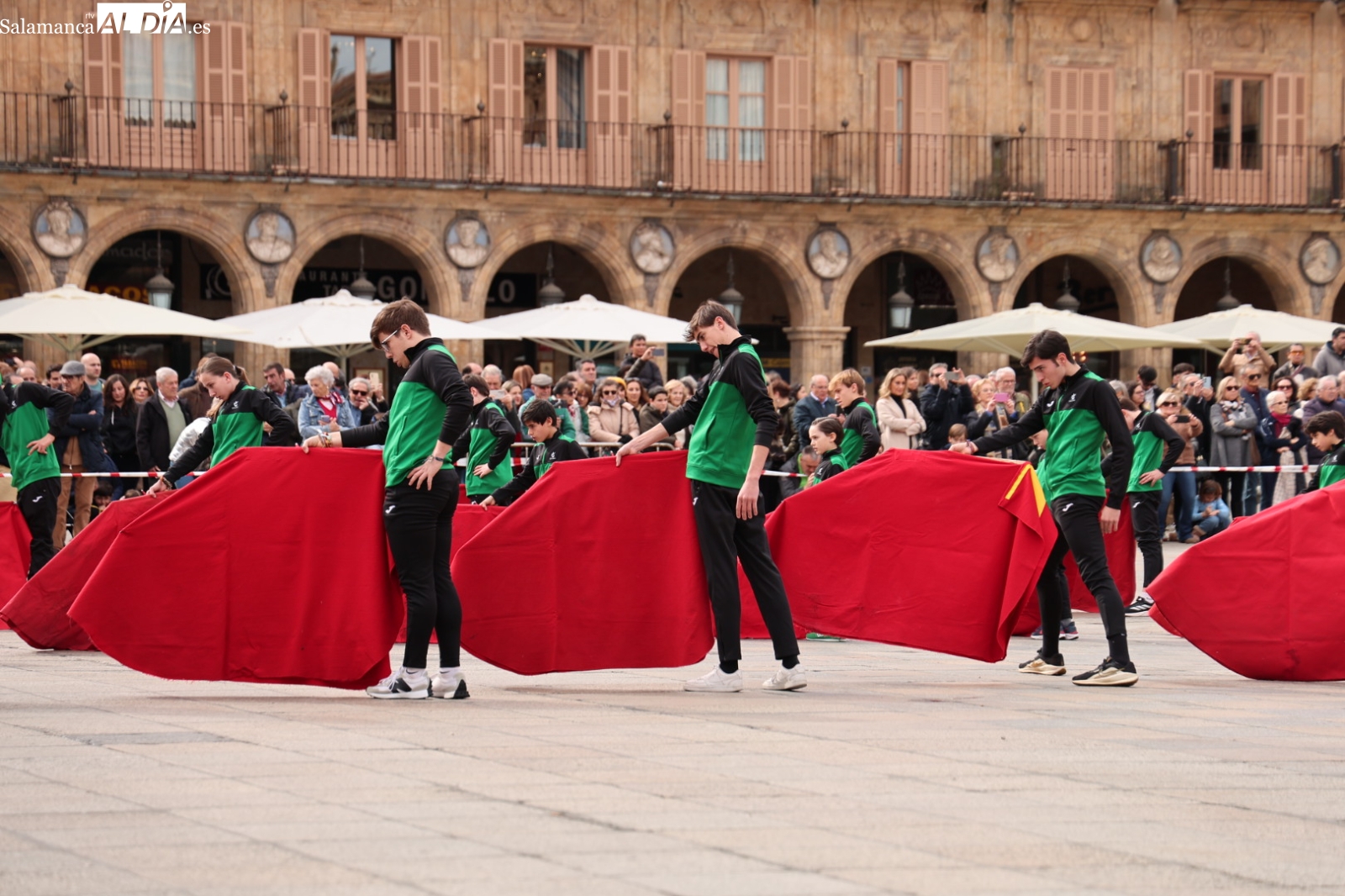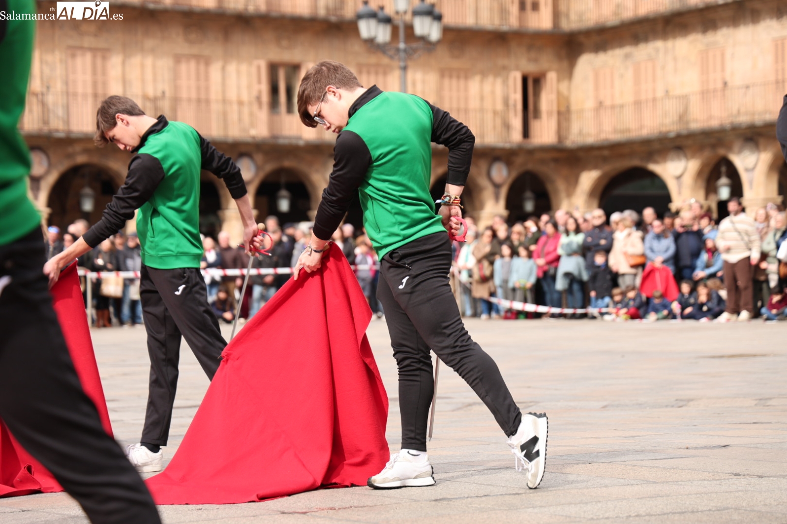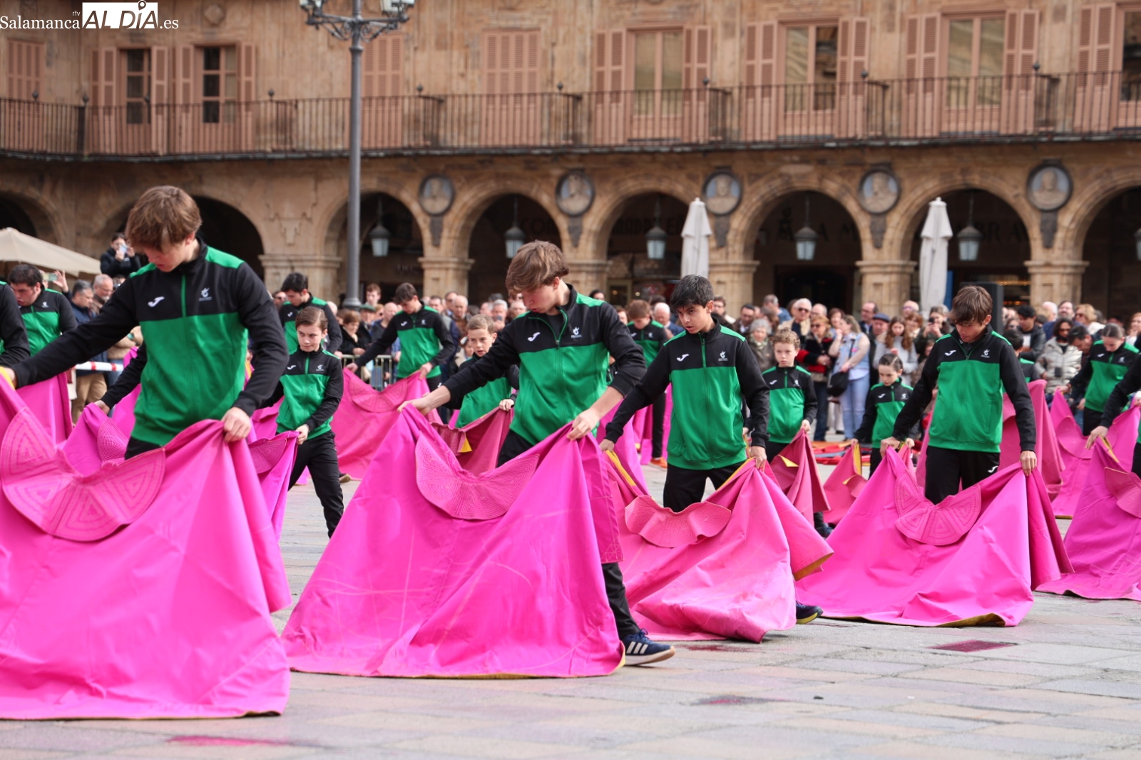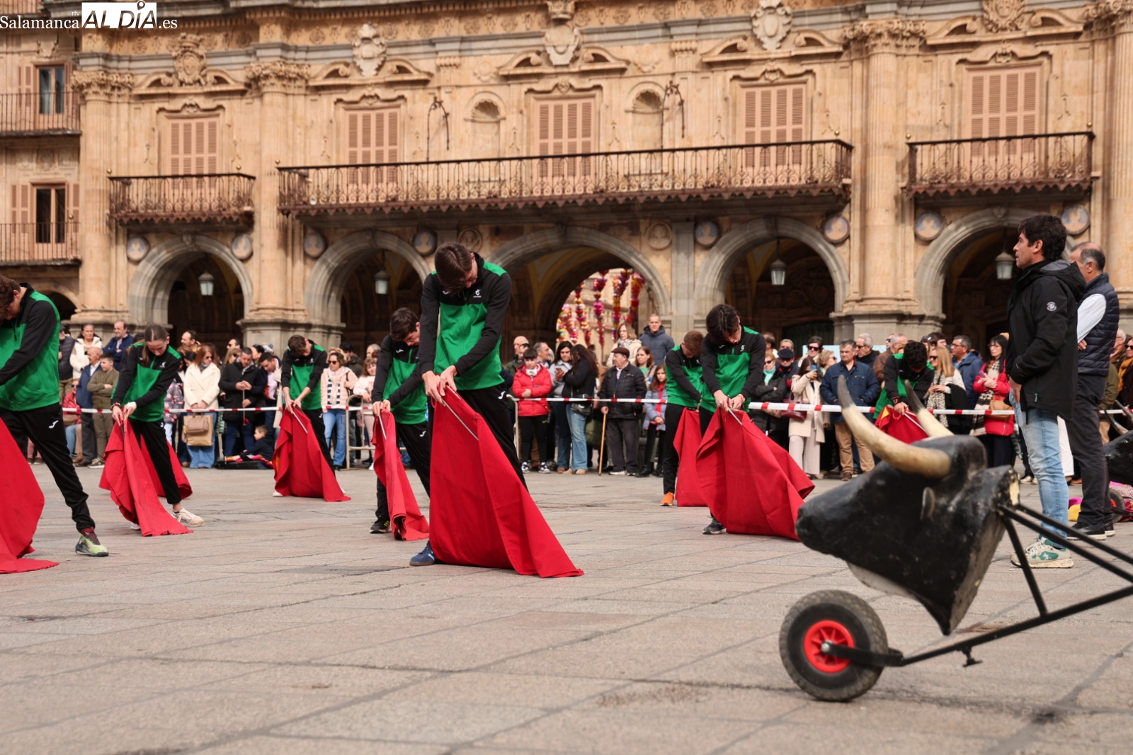 La Plaza Mayor de Salamanca se convirtió en un auténtico ruedo al aire libre en la soleada mañana de este sábado, con los alumnos de la Escuela Taurina de la Diputación ofreciendo una brillante exhibición de toreo de salón para conmemorar el 40º aniversario de la institución. Cientos de espectadores se congregaron en el emblemático ágora salmantino para presenciar el arte y la destreza de las futuras promesas del toreo.