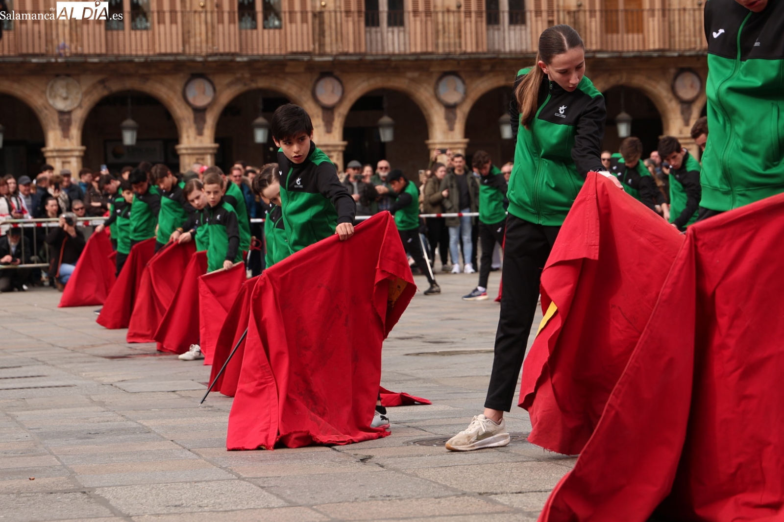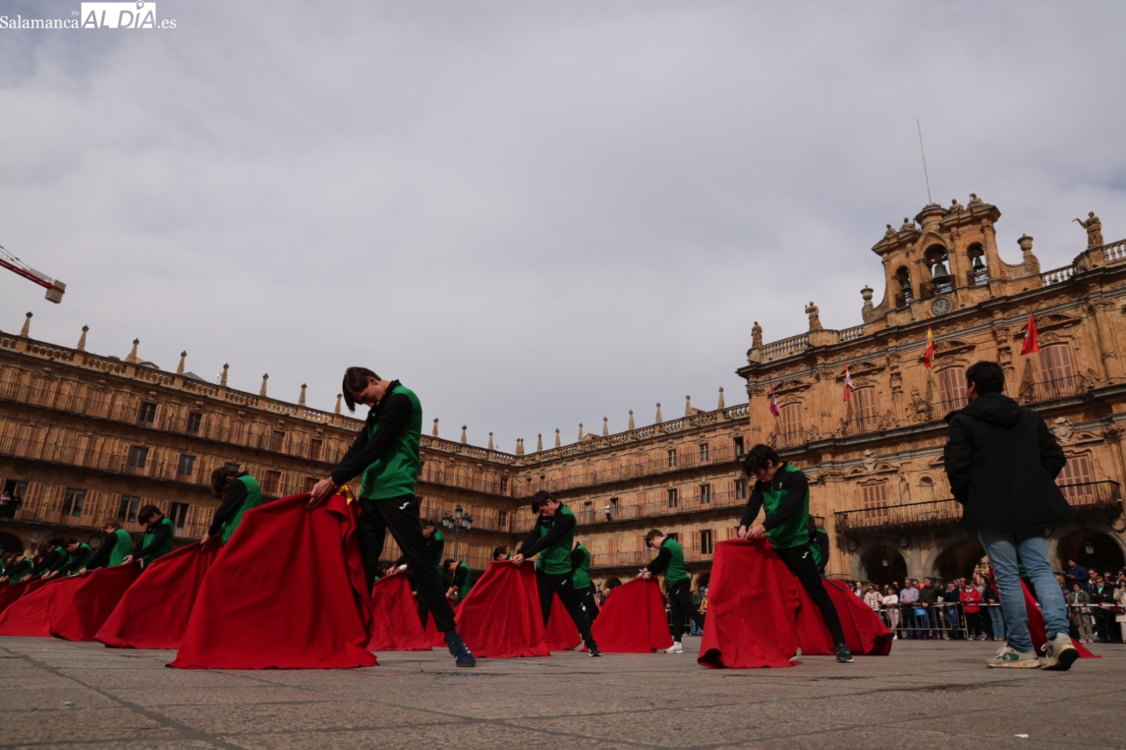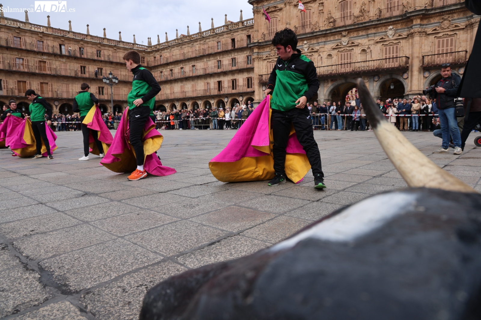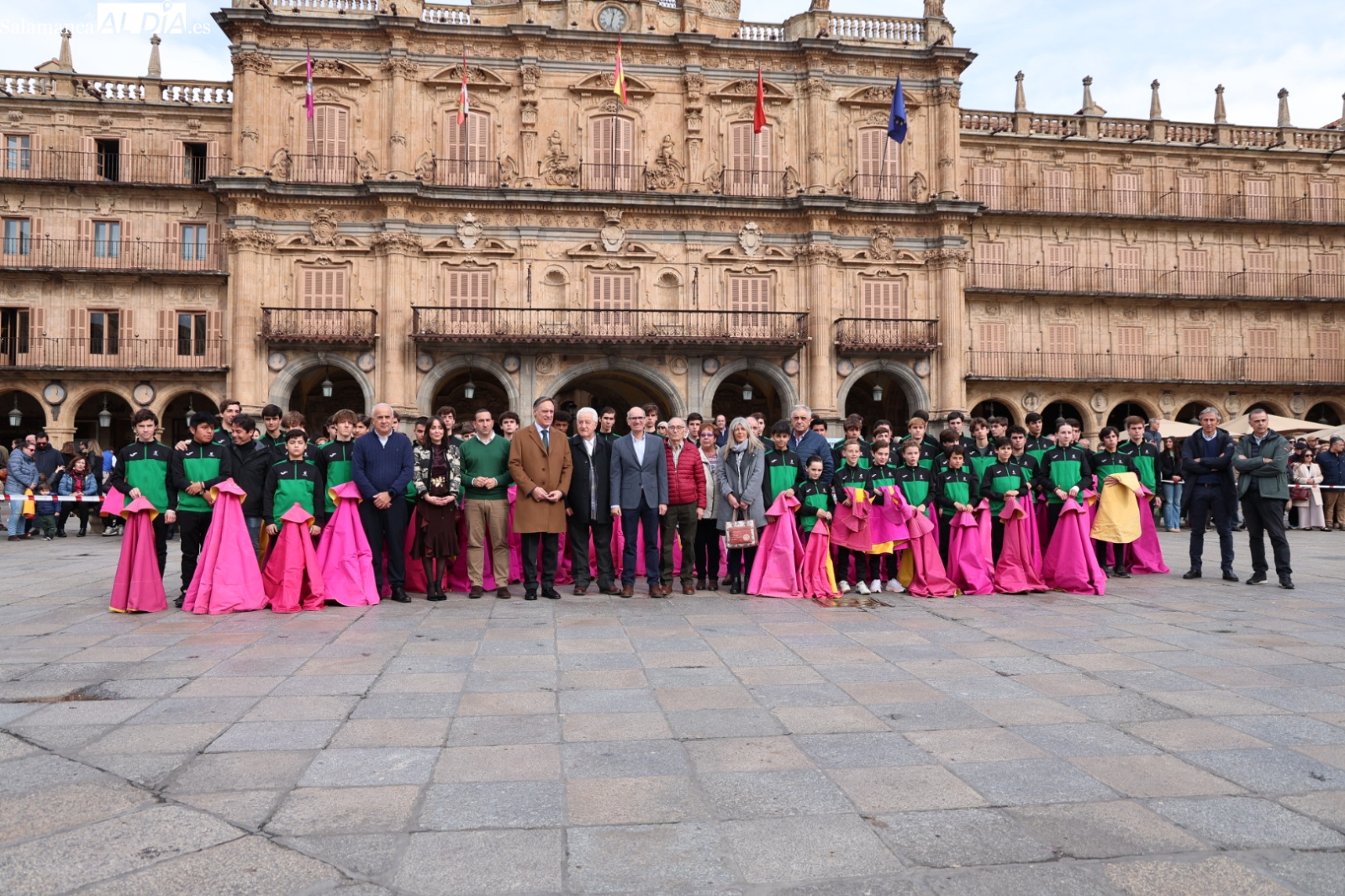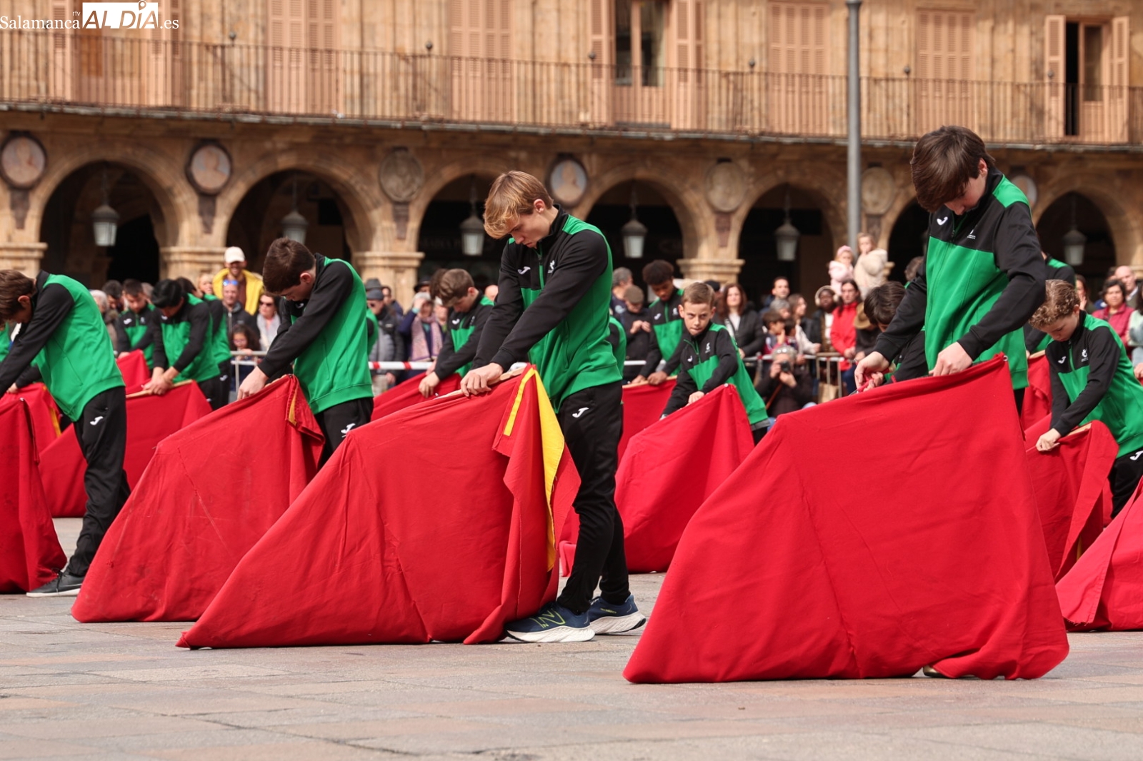 La Plaza Mayor de Salamanca se convirtió en un auténtico ruedo al aire libre en la soleada mañana de este sábado, con los alumnos de la Escuela Taurina de la Diputación ofreciendo una brillante exhibición de toreo de salón para conmemorar el 40º aniversario de la institución. Cientos de espectadores se congregaron en el emblemático ágora salmantino para presenciar el arte y la destreza de las futuras promesas del toreo.