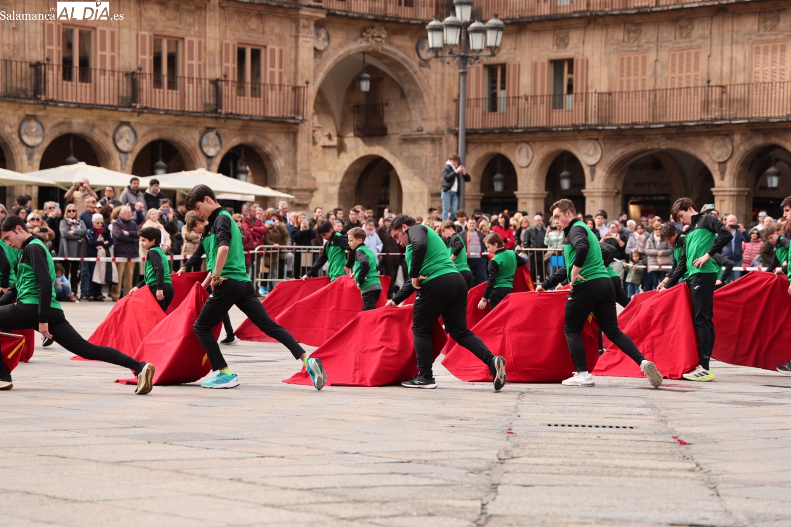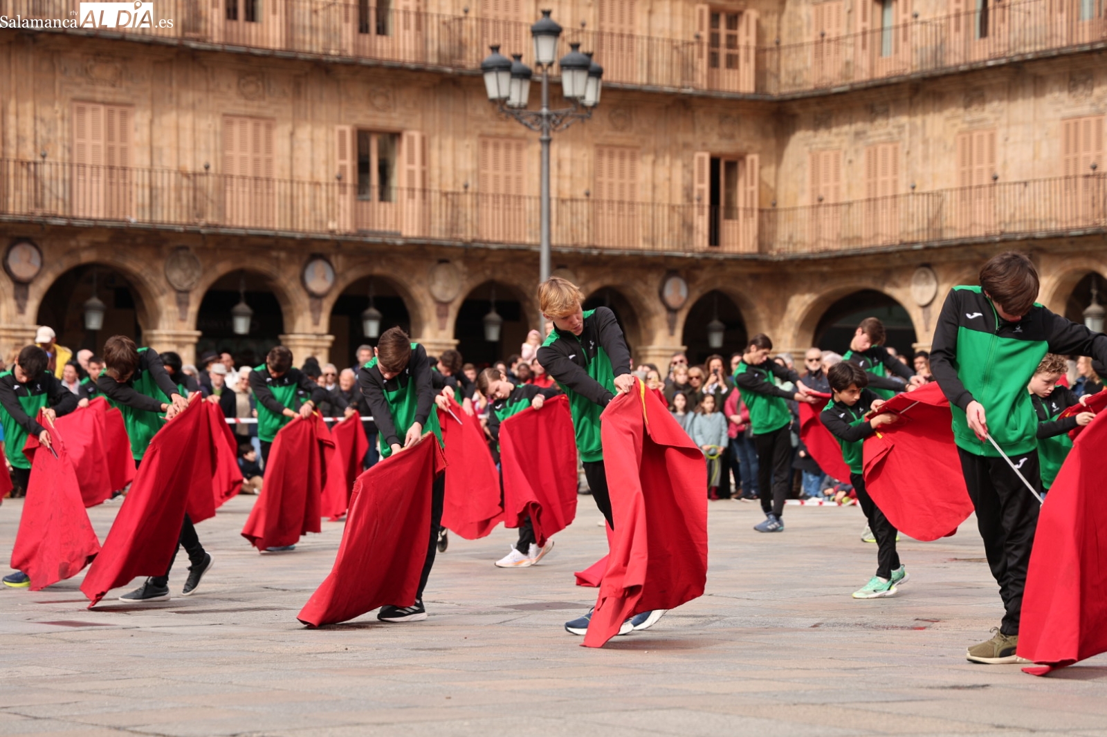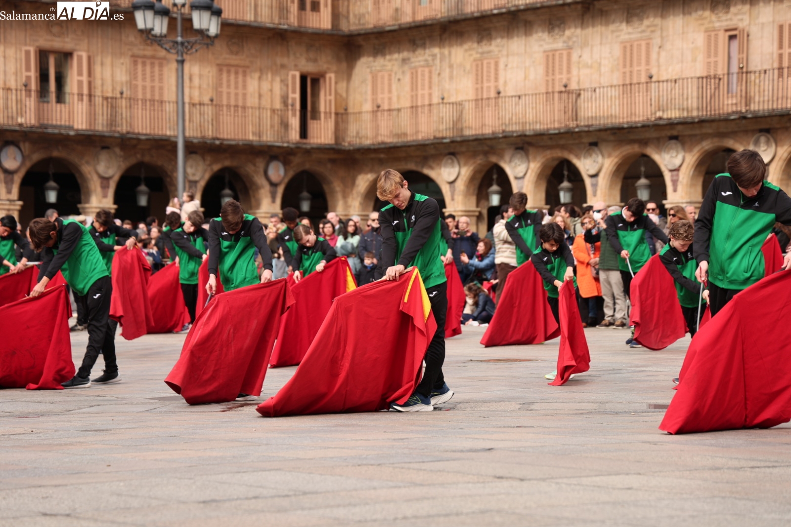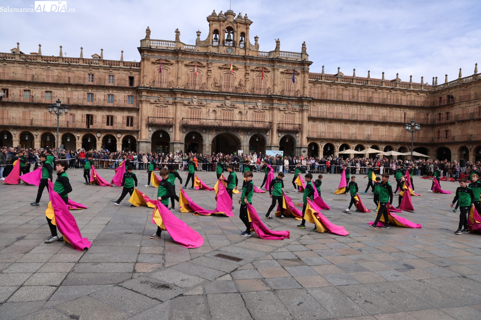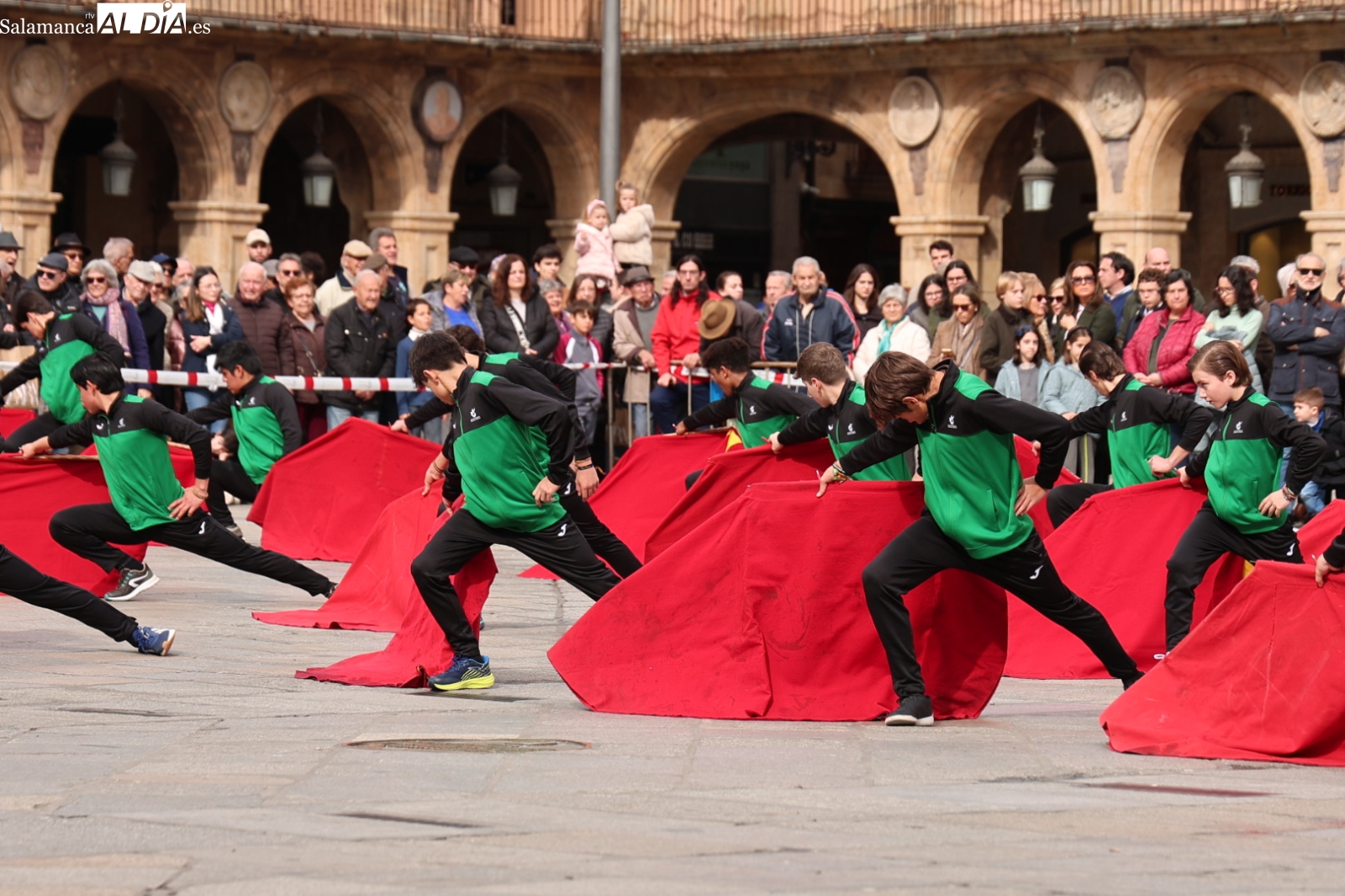 La Plaza Mayor de Salamanca se convirtió en un auténtico ruedo al aire libre en la soleada mañana de este sábado, con los alumnos de la Escuela Taurina de la Diputación ofreciendo una brillante exhibición de toreo de salón para conmemorar el 40º aniversario de la institución. Cientos de espectadores se congregaron en el emblemático ágora salmantino para presenciar el arte y la destreza de las futuras promesas del toreo.