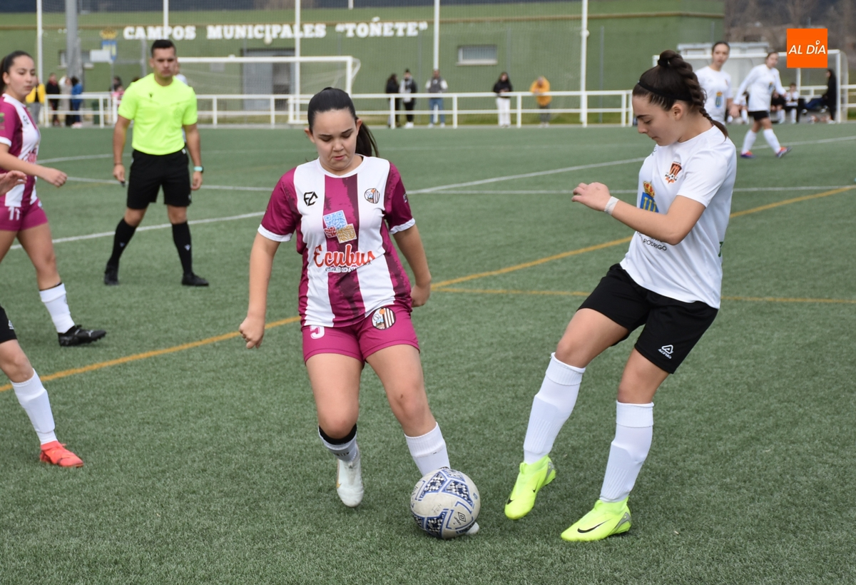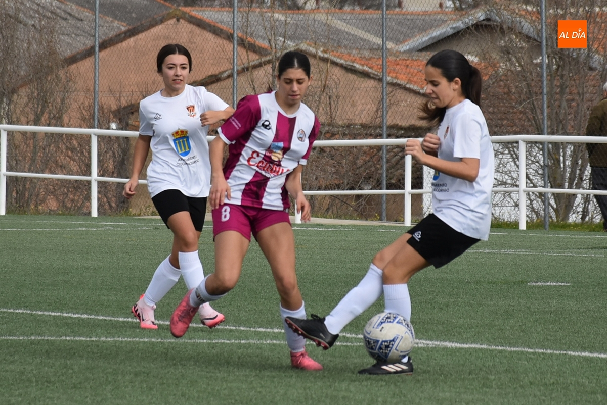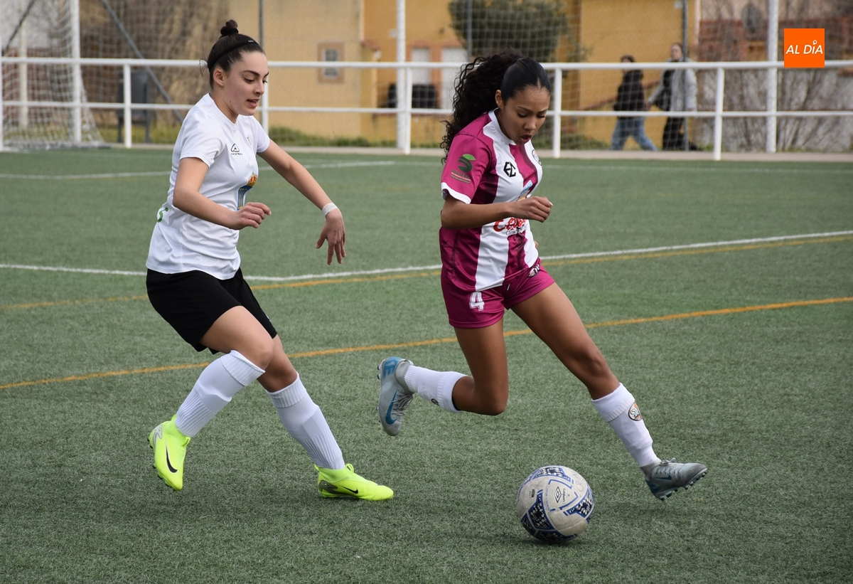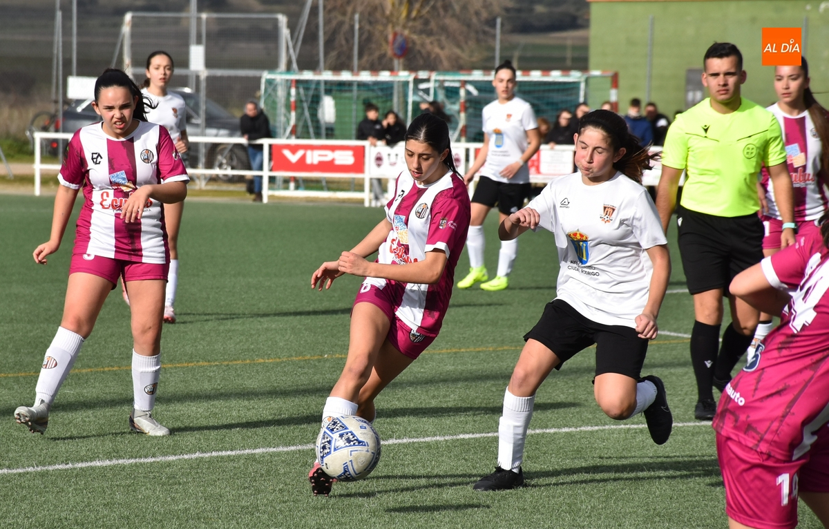 Tras una primera parte parca en ocasiones, el Ciudad Rodrigo apretó el acelerador ofensivo en los últimos minutos, empezando en el 25’ con un remate de primeras de Celia desde la frontal que se fue al lado del palo izquierdo. Apenas un minuto después, la guardameta salió a cortar a tiempo el balón en largo enviado desde atrás hacia Celia, concluyendo este período con una gran ocasión: en un saque de esquina desde la derecha, hubo un gran remate de Noa Martín de primeras, con la mala suerte de que el balón fue justo a donde estaba la guardameta.