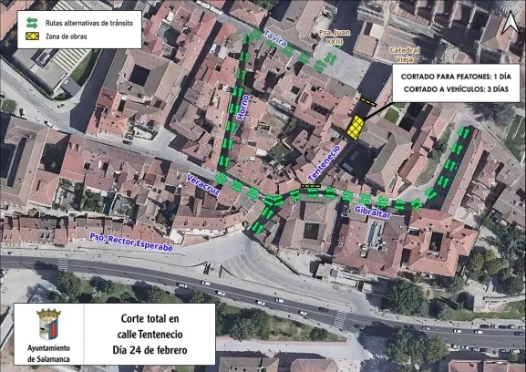 La calle Tentenecio de Salamanca permanecerá cerrada este lunes de manera total debido la realización de trabajos en la red de abastecimiento. En concreto, se realizará una acometida de agua que obligara a desviar el tránsito tanto de vehículos como de peatones.