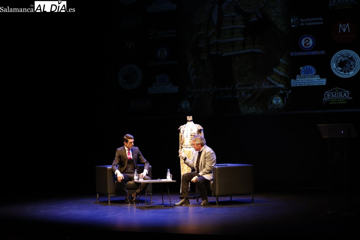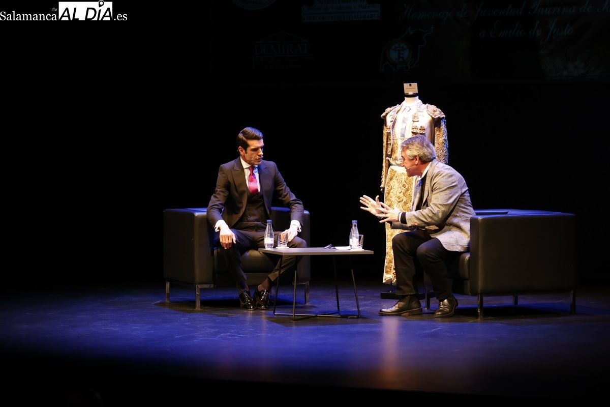 Bajo el título de 'Figura en plenitud', Juventud Taurina de Salamanca rindió honores al torero Emilio de Justo en un acto que generó un excepcional ambiente en el Teatro Liceo. El torero, impecablemente vestido, rebosó torería y verdad en su sincero discurso durante la charla que mantuvo con Juan Bazaga, reconocido periodista extremeño.