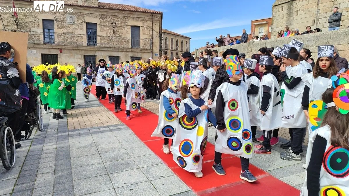 Los alumnos del CEIP Manuel Moreno Blanco vistieron de Carnaval este viernes las calles de Vitigudino con un bullicioso desfile con disfraces con el tema ‘Un cole con arte’. Los alumnos del colegio iniciaban el recorrido pasadas las 12.30 horas por las calles de la localidad bajo la atenta mirada de padres y vecinos que llenaban el recorrido y disfrutaron del desfile que estuvo acompañado por la música de la charanga La Escala 2.0, cortesía de la Asociación de Madres y Padres (AMPA), para llegar a la Plaza de España.