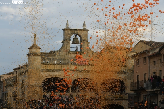 Este año, otras personas les relevaron en esa función en los puntos habituales, como a pie de Plaza (dentro de la zona reservada para los músicos de las charangas), pero a cambio lo lanzaron de forma novedosa desde lo alto de la Casa Consistorial, mientras eran soltados un enorme volumen de globos farinatos para simbolizar el estallido festivo de Ciudad Rodrigo.