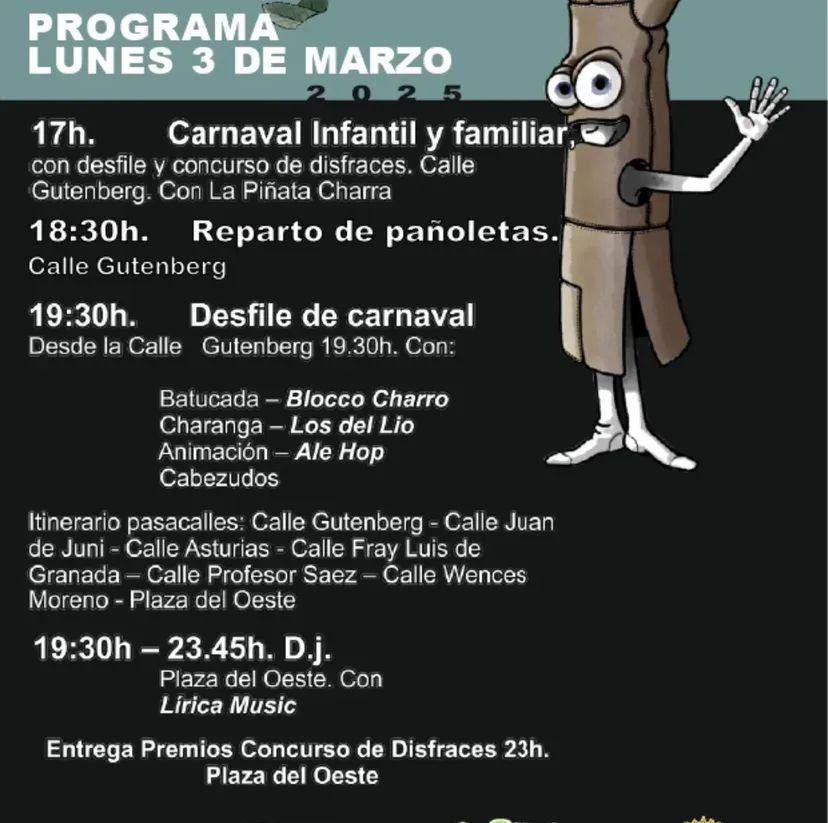 ZOES organiza un año más su tradicional Carnaval en el barrio del Oeste. Será el lunes 3 de marzo a partir de las 19:30 h en la calle Gutenberg. Habrá un concurso de disfraces, con inscripción previa. Será a las 17:00h. Posteriormente, a las 18:30h se realizará el reparto de pañeletas y una hora después comenzará el desfile de carnaval que recorrerá diferentes calles del barrio.