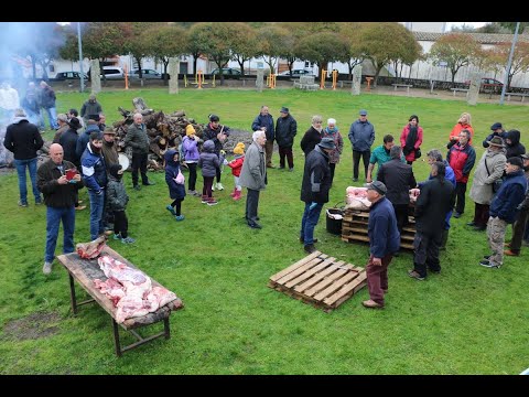 Al mismo tiempo recibían a la protagonista de buena parte de la mañana, una cochina de unos 250 kilos de peso y de la que Balta y Carlos, con un grupo de colaboradores, daban cuenta una vez chamuscada con butano.