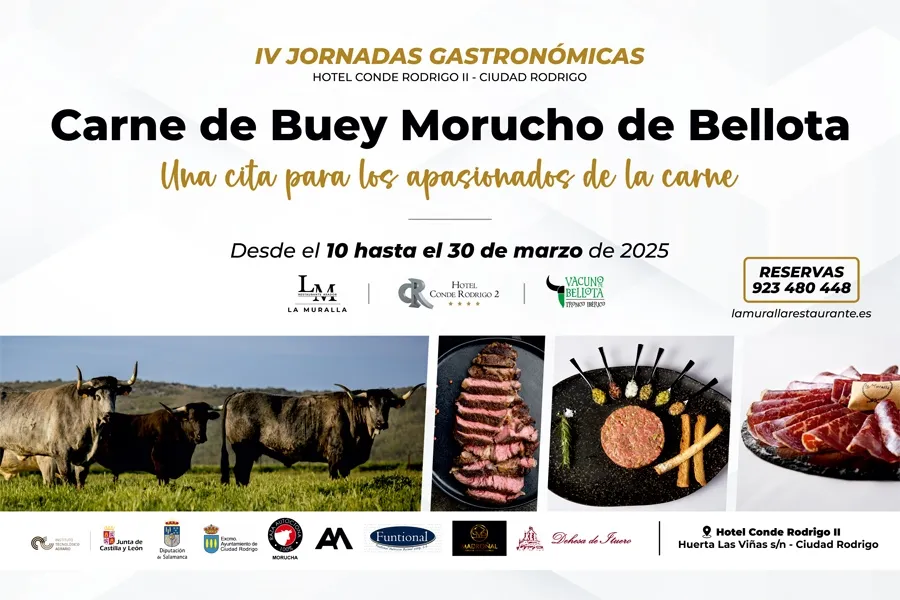 Por cuarto año consecutivo el Restaurante la Muralla de Ciudad Rodrigo organiza sus IV Jornadas dedicadas a la carne del Buey Morucho de Bellota para los apasionados a este tipo de delicatesen. Se celebrarán del 10 al 30 de marzo apostando por una oferta km 0 que brinde la máxima calidad a los clientes y garantice la sostenibilidad de la dehesa salmantina.
