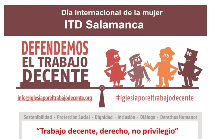 Cáritas Salamanca, como parte de la plataforma ‘Iglesia por el Trabajo Decente’ (ITD), ha participado en las actividades con motivo del Día Internacional de la Mujer, para visibilizar la importancia del trabajo humano, así como reivindicar el trabajo decente desde nuestras organizaciones. Con la eucaristía y el manifiesto, hemos invitado a todos los presentes en la Iglesia de Fátima, en el barrio Garrido, a renovar el compromiso con la justicia social para que ninguna mujer sea invisible y erradicar la precariedad laboral de todas.