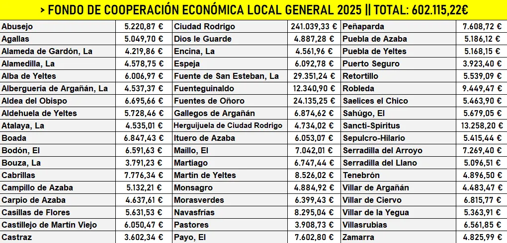 El conjunto de 54 municipios de la comarca de Ciudad Rodrigo recibirá durante este 2025 un total de 602.115,22€ procedentes del denominado Fondo de Cooperación Económica Local General (FCELG) de la Consejería de Presidencia de la Junta de Castilla y León, según se ha dado a conocer en los últimos días. El dinero que llegará a cada municipio depende de su volumen poblacional, variando también sus posibles destinos.