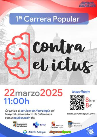La I Carrera Popular Contra el Ictus llega este fin de semana a Salamanca, dado que se recorrerá por las calles de nuestra ciudad el sábado 22 de marzo a partir de las 11:00 horas con salida en la Facultad de Medicina bajo un recorrido de 8 km y 8 euros de inscripción.