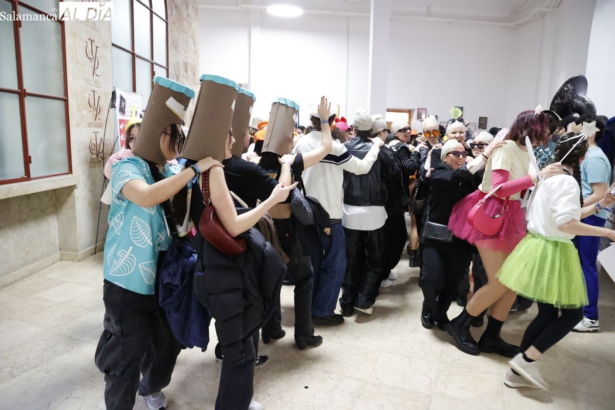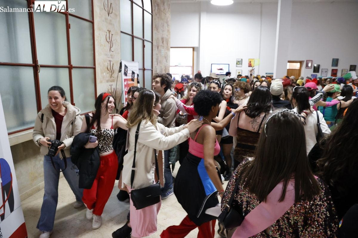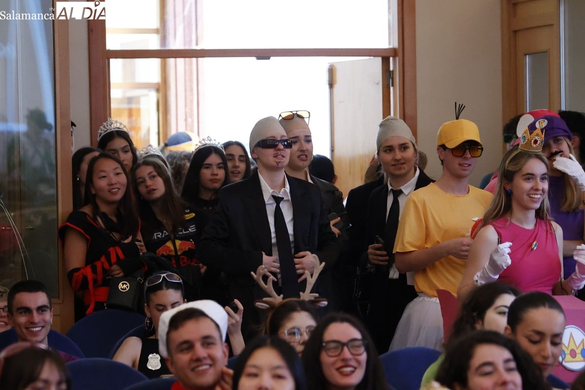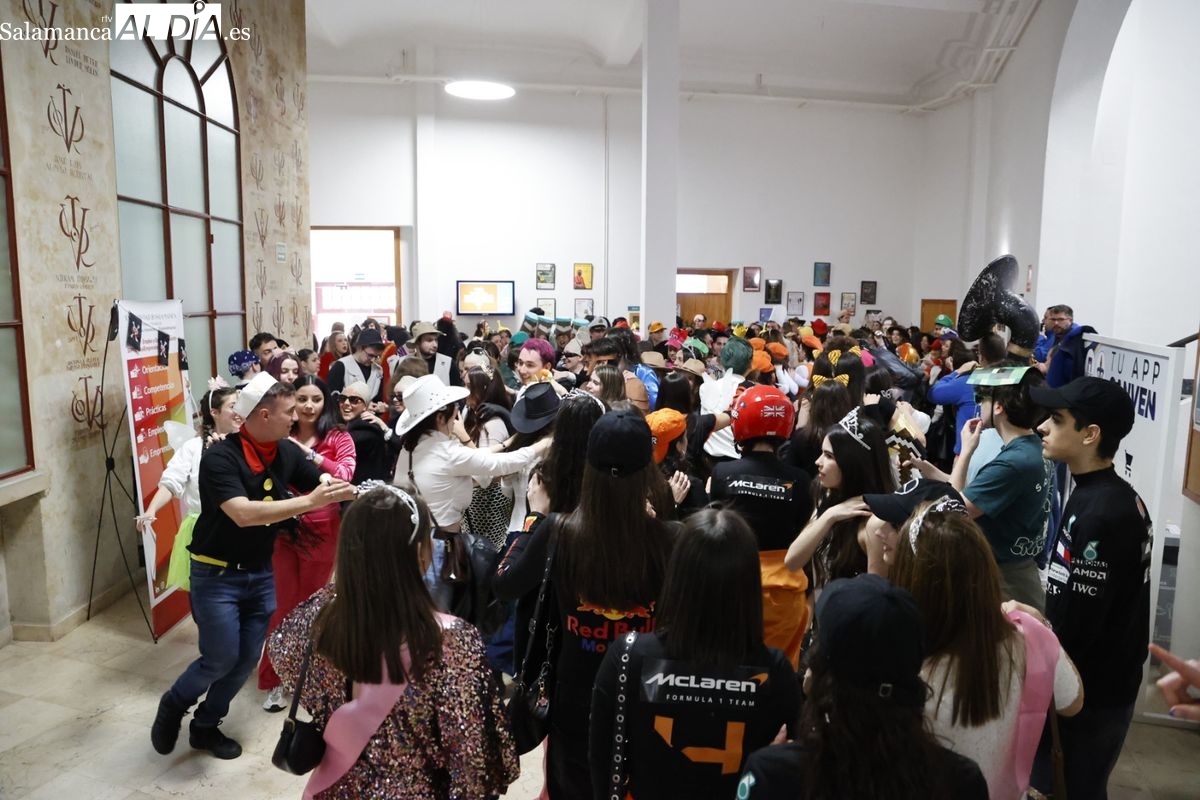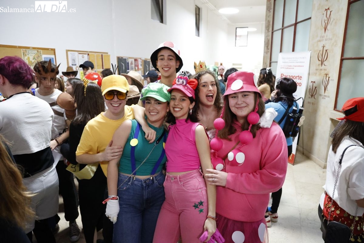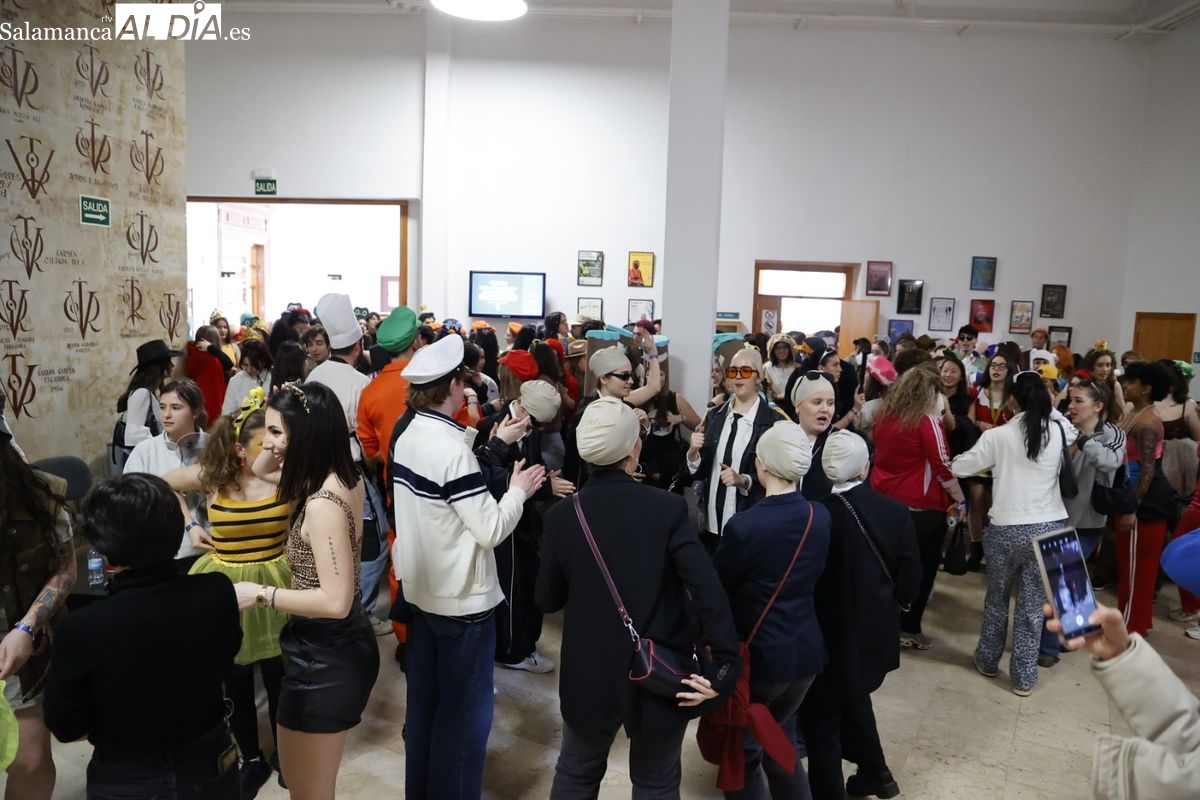 Disfraces y buen ambiente en las fiestas de Traducción y Documentación de la Universidad de Salamanca. El sol ha aparecido dejando atrás la lluvia de primeras horas de la mañana y ha permitido a los universitarios disfrutar de su día grande.