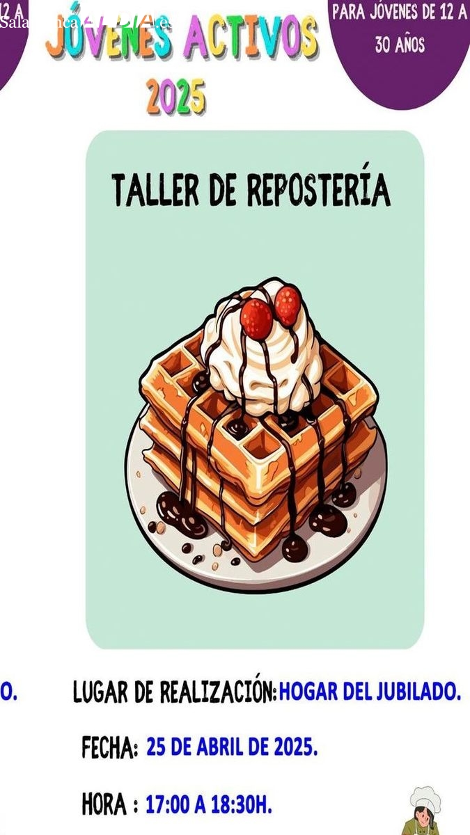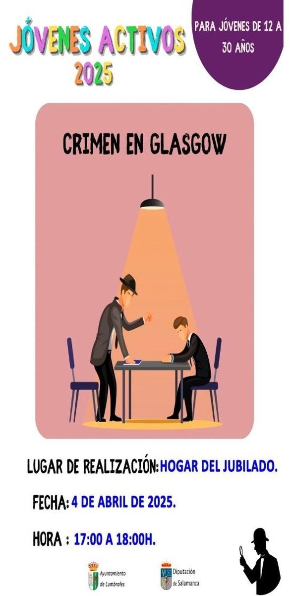Así, dentro del programa provincial Jóvenes Activos, se desarrollará el taller Crimen en Glasgow (día 4 de abril, en el hogar del jubilado), la sesión de Scape Room Los Simpson (11 de abril, hogar del jubilado) y un taller de repostería (día 25 abril, en el hogar del jubilado). El plazo de inscripción para asistir a estas actividades está abierto hasta el día 2 de abril. El programa jóvenes activos es una iniciativa de la Diputación de Salamanca que ofrece a los ayuntamientos talleres gratuitos para fomentar la participación de jóvenes entre 12 y 30 años.