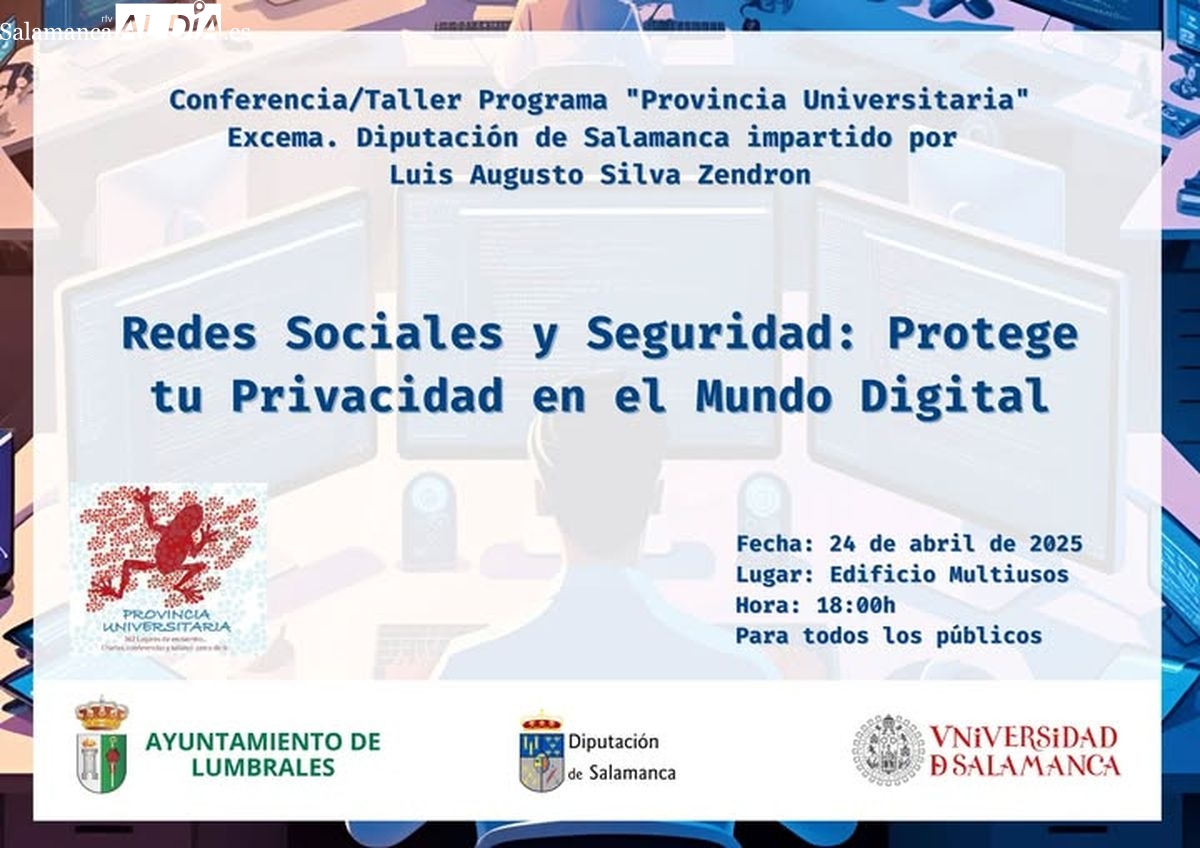 El Ayuntamiento de Lumbrales ha solicitado otra conferencia/taller de este programa provincial. 'Redes sociales y seguridad: protege tu privacidad en el Mundo Digital' taller que impartirá Luis Augusto Silva Zendrón, profesor de la USAL, el dia 24 de abril, a las 18,00 horas en la biblioteca municipal.