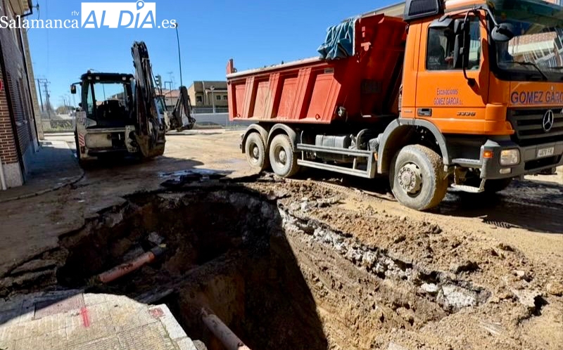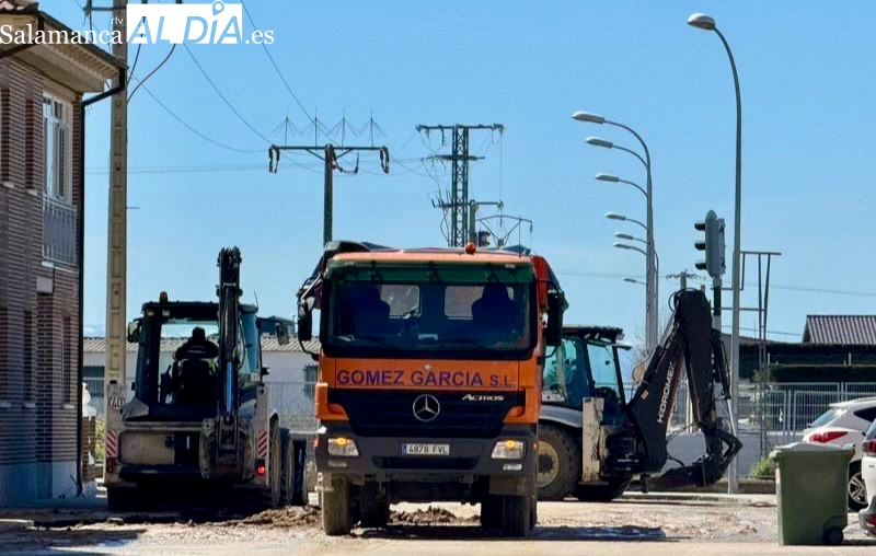 Trabajadores del Ayuntamiento de Peñaranda y maquinaria pesada trabajan desde primeras horas de la mañana de este lunes en la reparación de una complicada avería en la red de suministro de agua a su paso por los accesos a la Travesía de Chamberí.