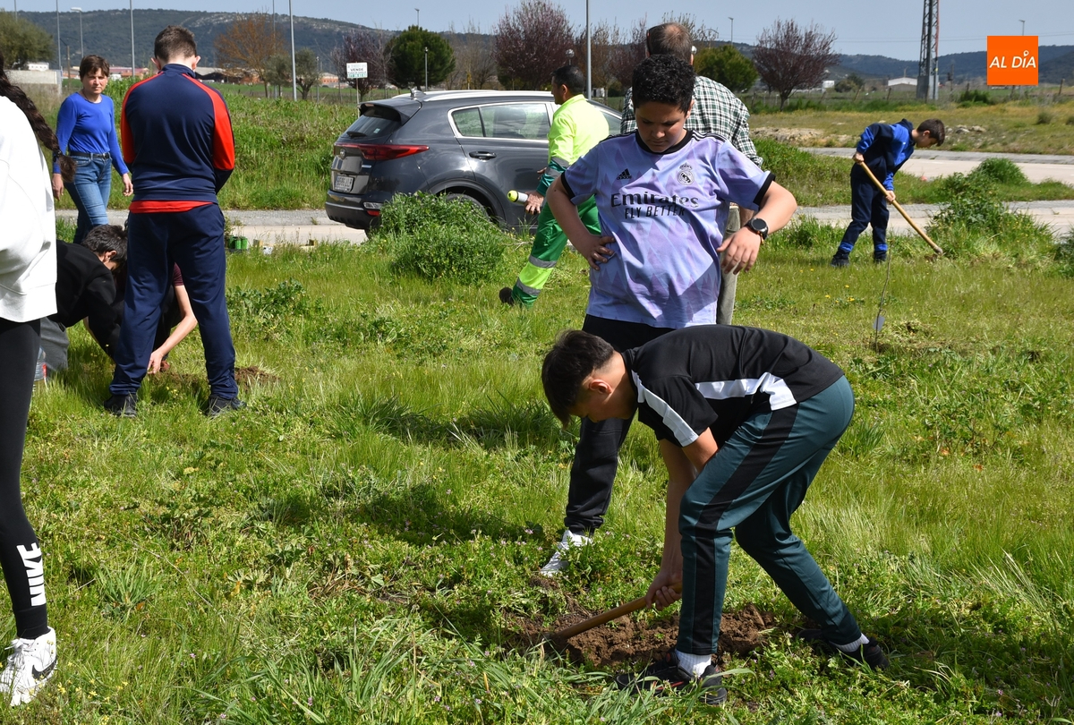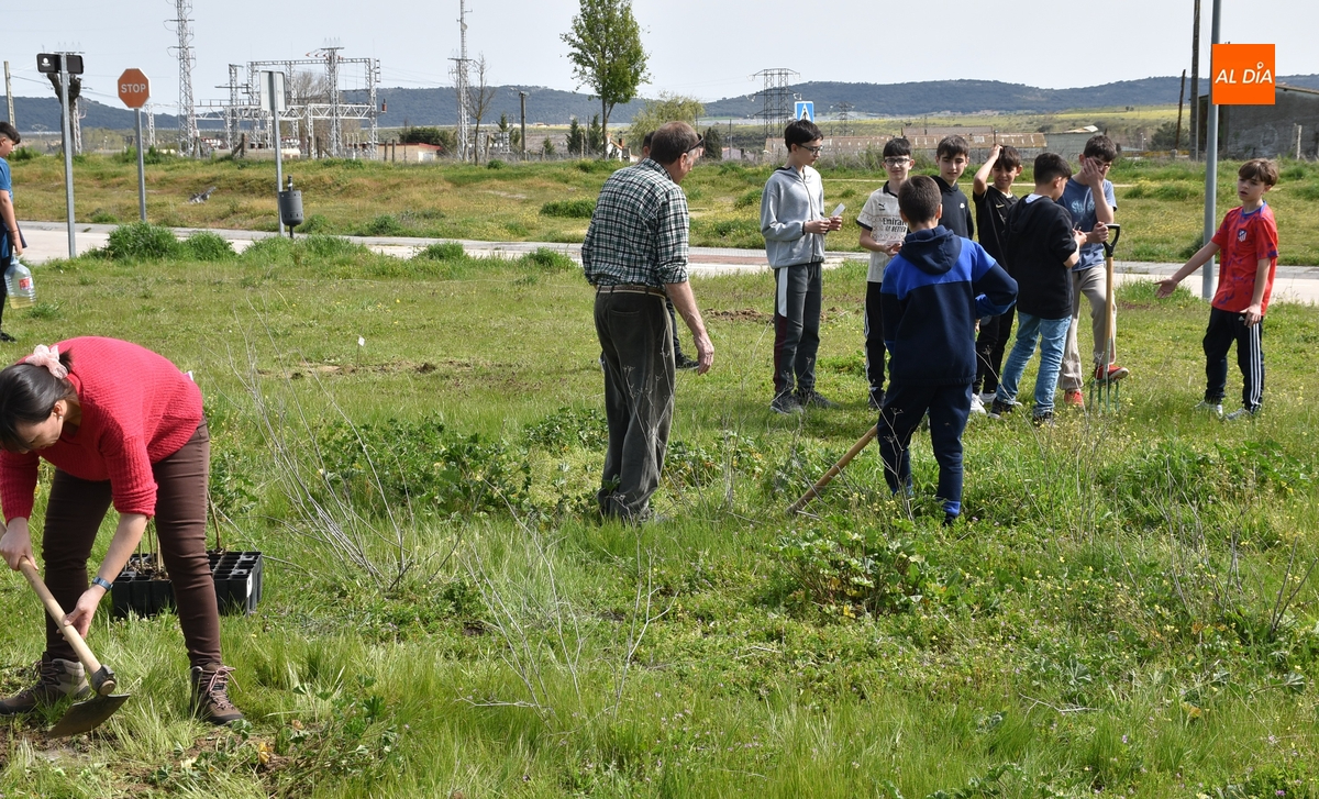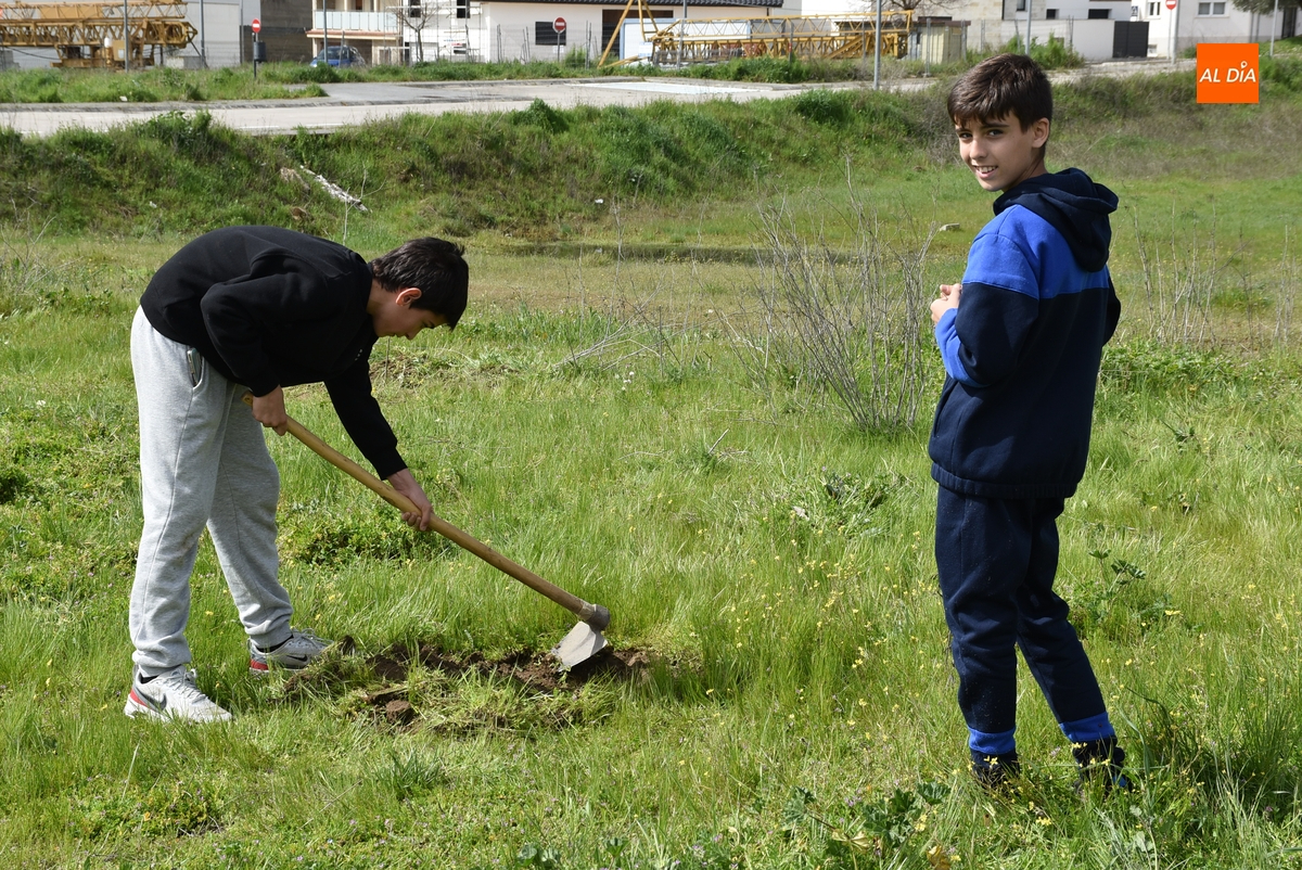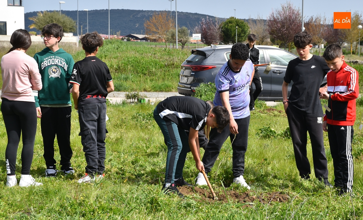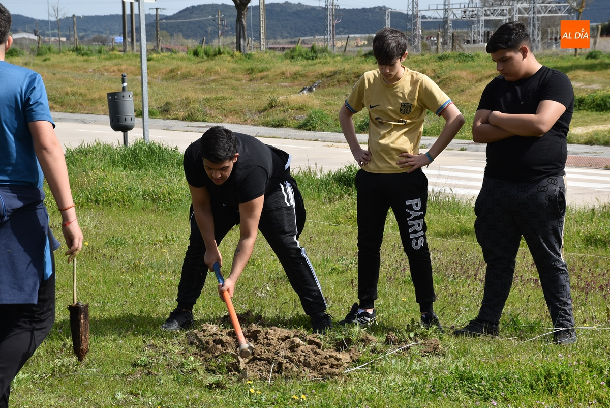 Los alumnos de 1º de la ESO del IES Tierra de Ciudad Rodrigo se acercaron en la mañana del martes en varios turnos hasta la calle Juan Pablo I de Ciudad Rodrigo (en el área de la nueva residencia de Asprodes y del Parque de Bomberos) para plantar en una parcela sin uso un total de 90 plantones de árboles, en el marco de un proyecto educativo del IES.