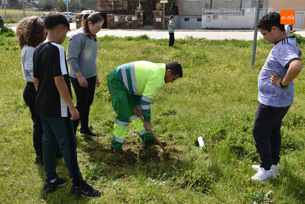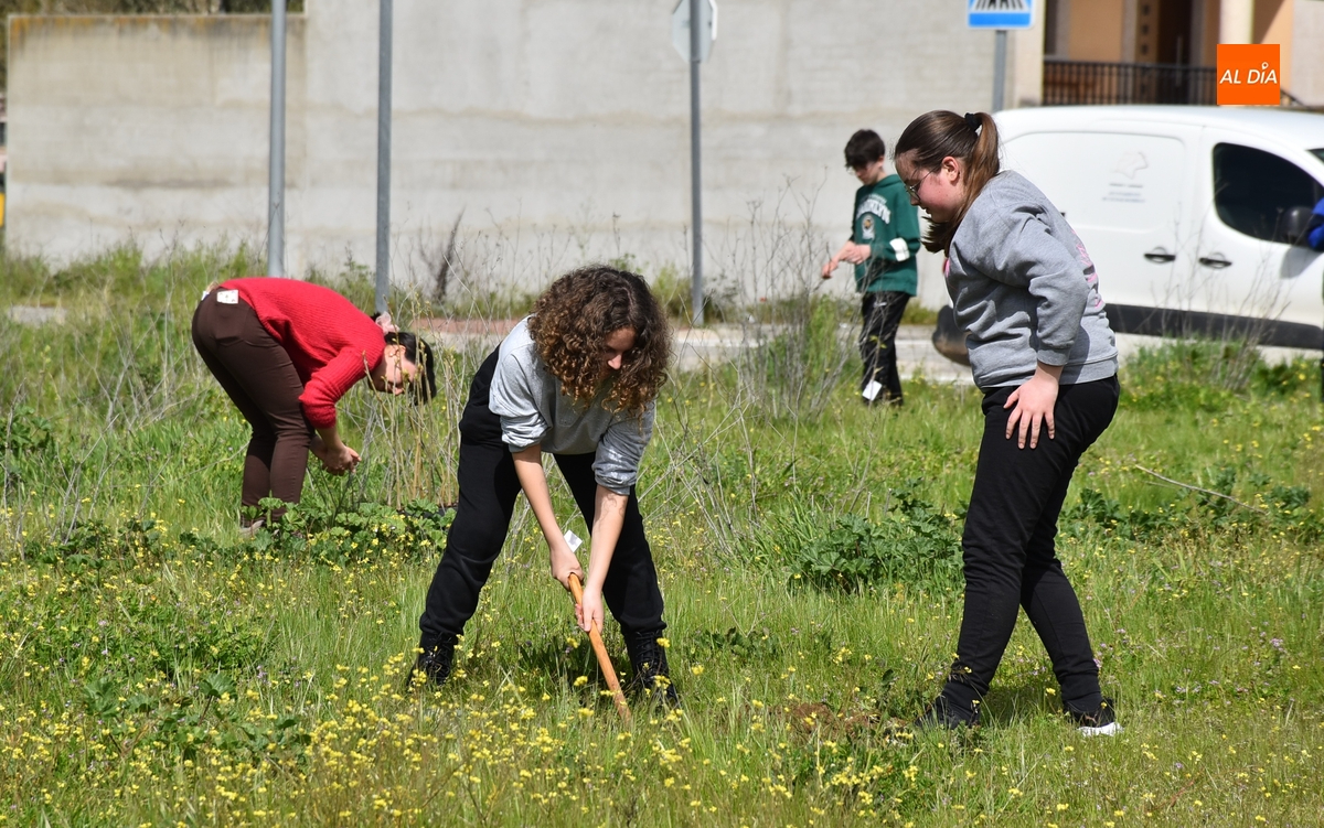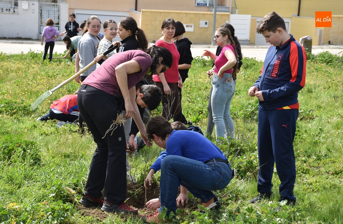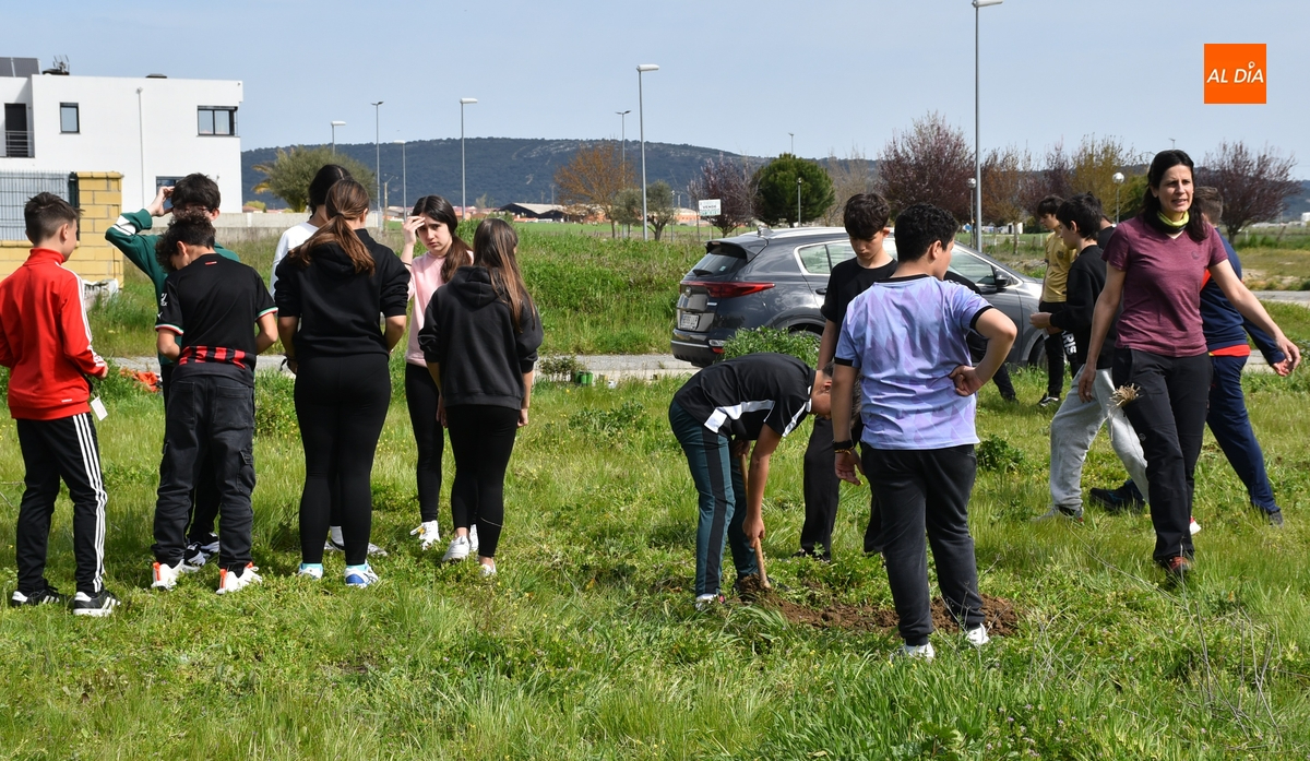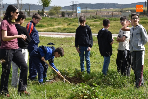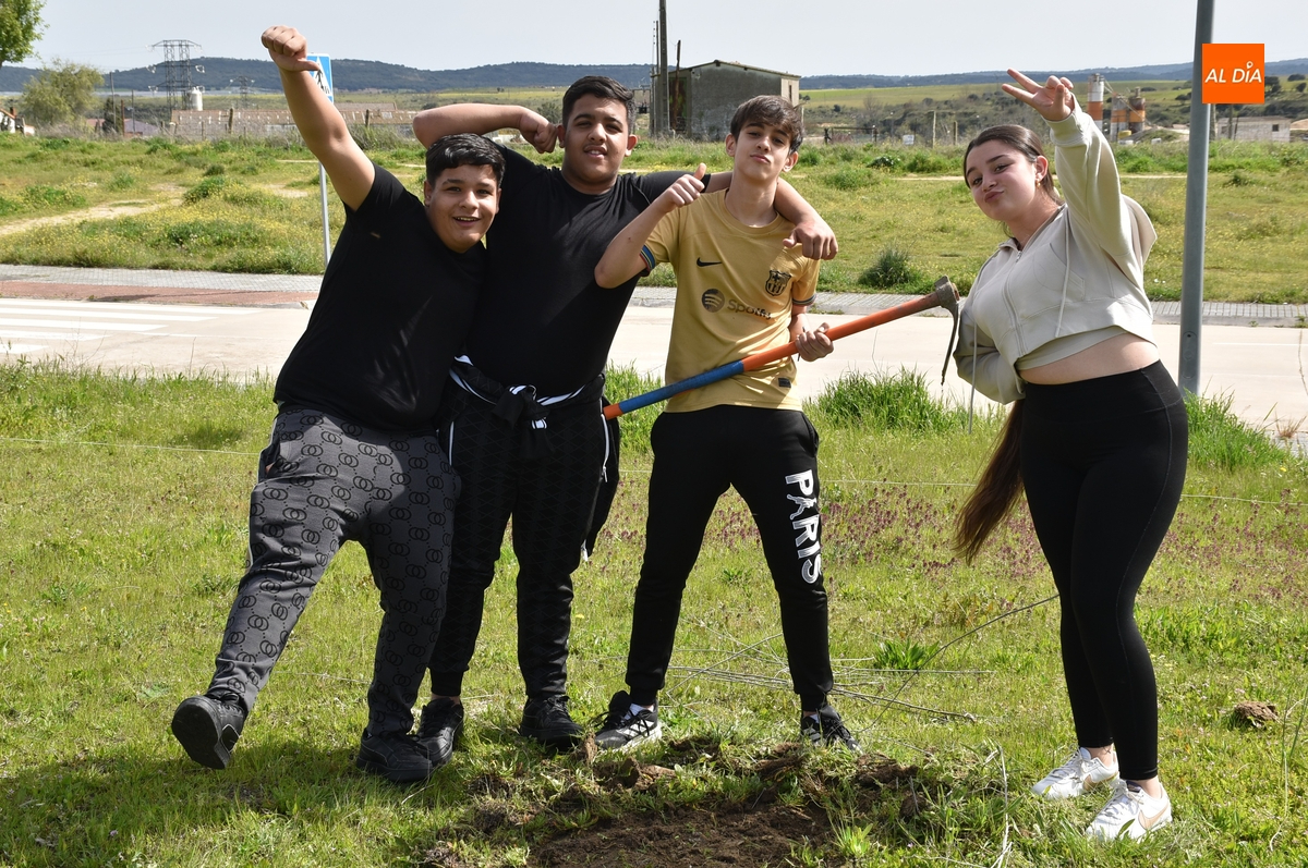 Los alumnos de 1º de la ESO del IES Tierra de Ciudad Rodrigo se acercaron en la mañana del martes en varios turnos hasta la calle Juan Pablo I de Ciudad Rodrigo (en el área de la nueva residencia de Asprodes y del Parque de Bomberos) para plantar en una parcela sin uso un total de 90 plantones de árboles, en el marco de un proyecto educativo del IES.