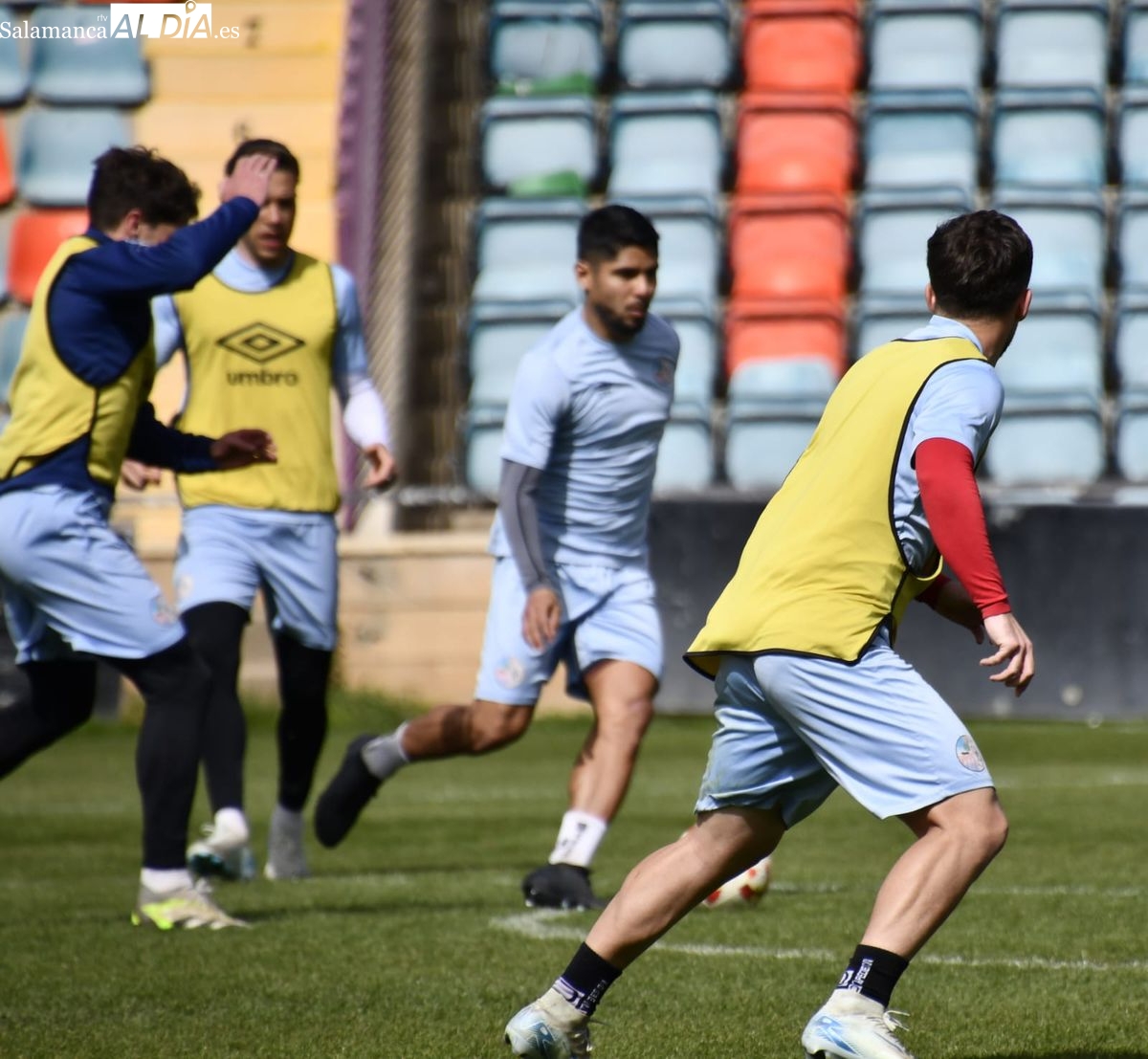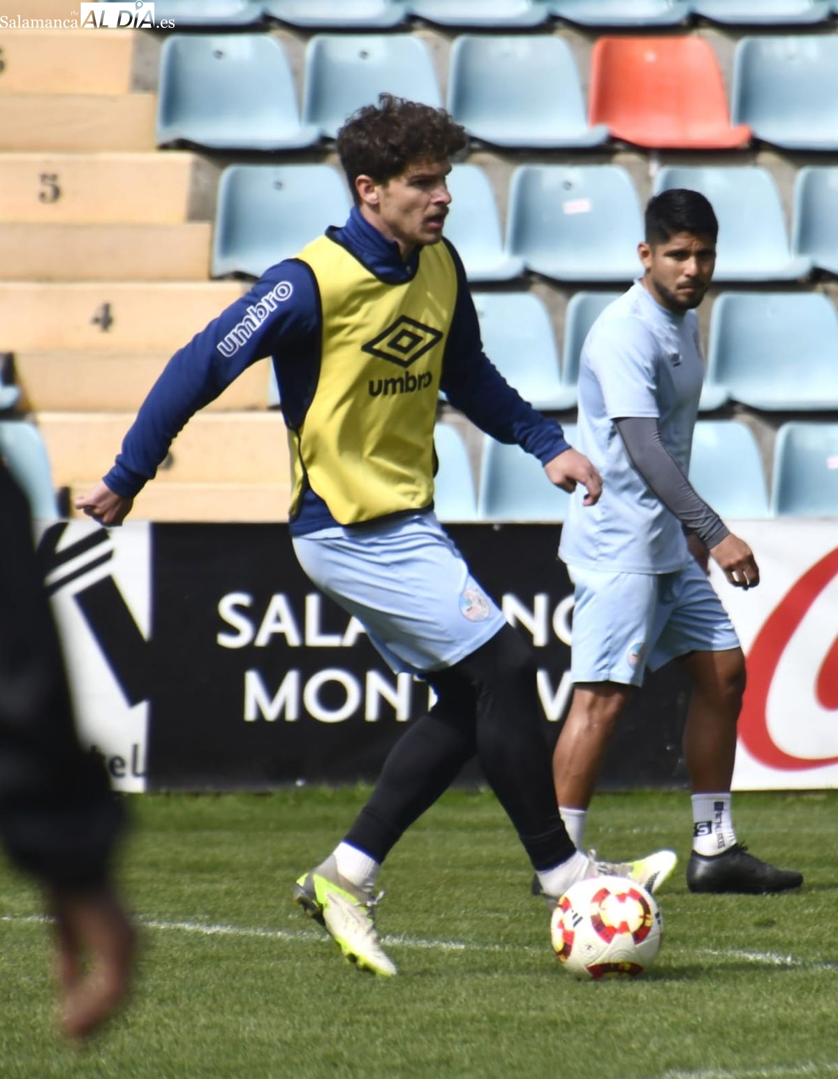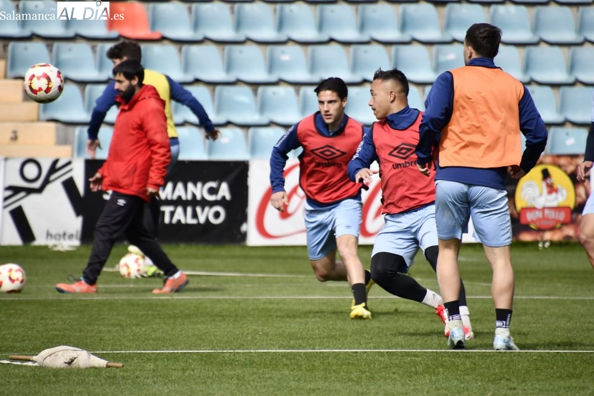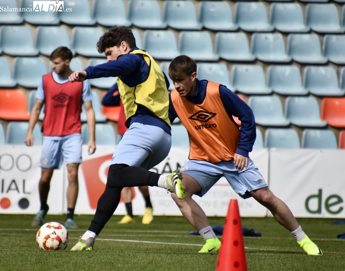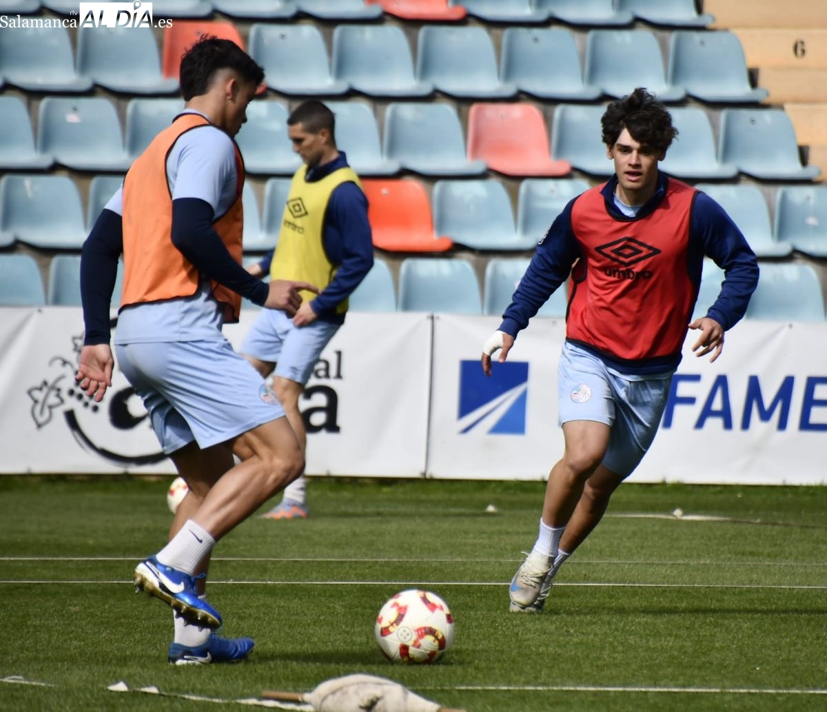 Óscar Lorenzo y Jon Villanueva, lesionados en el encuentro del fin de semana, han sido los únicos ausentes este martes. La sesión de entrenamiento del Salamanca UDS ha incluído tareas en espacios reducidos y varios partidillos con limitación de toques para el equipo poseedor del balón.