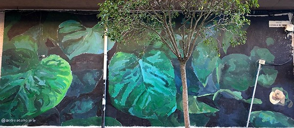 La artista ha buscado transmitir la conexión entre la naturaleza y la mujer, dando un aspecto y un color con las tonalidades verdes de los árboles y las plantas, en contraposición con el gris del hormigón de los edificios.