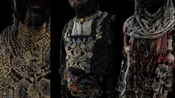 La artista genera una experiencia visual inmersiva y poética, donde los tejidos, las joyas y los gestos ancestrales emergen como símbolos vivos de identidad, saberes y memoria colectiva