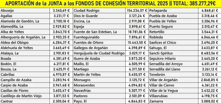 El Boletín Oficial de Castilla y León recoge en su edición de este miércoles las cantidades concedidas por la Consejería de la Presidencia de la Junta a cada uno de los 54 municipios de la comarca de Ciudad Rodrigo (así como al resto de localidades de la región) en el marco de los denominados Fondos de Cohesión Territorial 2025, cuyo objetivo es permitir la mejora de los servicios públicos de los municipios mediante la realización de inversiones.