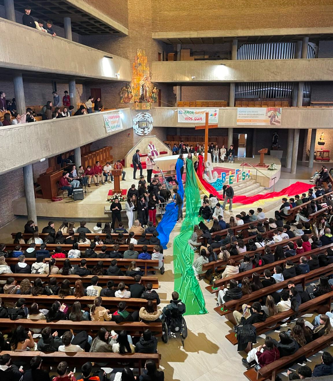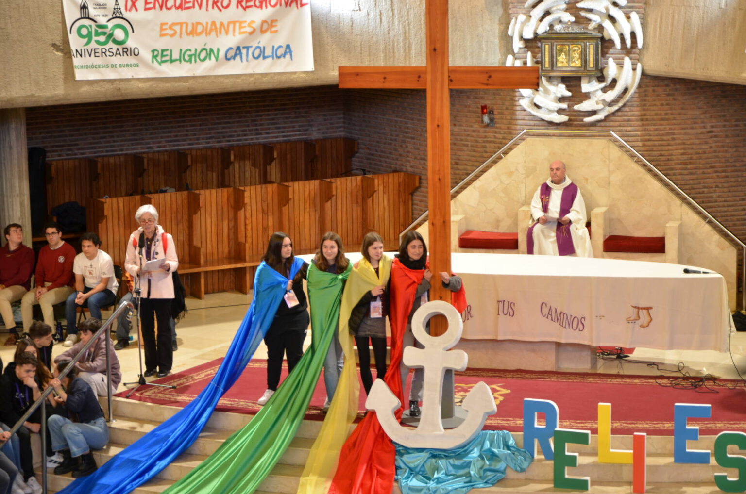 Posteriormente, asistieron a un acto religioso en la Iglesia de Nuestra Señora del Carmen que fue presidido por el Vicario de Pastoral de Burgos, José Luis Lastra, durante el cual varios jóvenes dieron testimonio de su fe. A su conclusión, hubo una comida conjunta, y a modo de sobremesa, un acto festivo en la sala Andén 56 con DJ Cristrax y el grupo burgalés de danza urbana H3B. Como cierre, el Vicario General de la Archidiócesis de Burgos, Carlos Izquierdo Yusta, animó a los alumnos a ser “testigos de esperanza”.