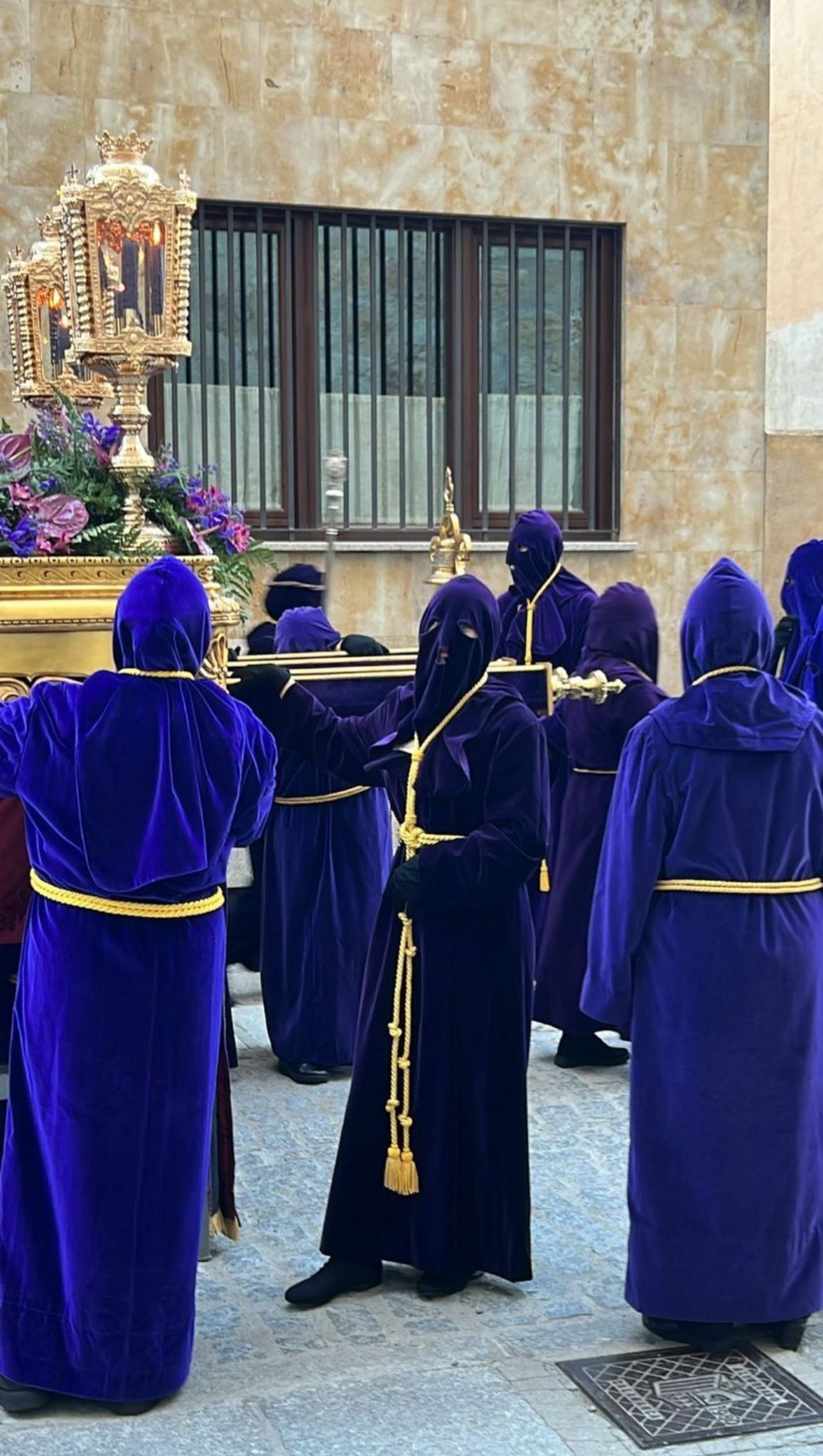 El sentimiento que las une a esta tradición tiene una larga historia. Pilar cuenta que todo comenzó en su adolescencia. “Me llamaban la atención todas las imágenes y pasos de la Semana Santa de Salamanca, pero en especial la emoción que sentí cuando una tarde entré en la iglesia de San Pablo y lo vi allí en su camarín por primera vez. No se puede explicar con palabras, me sobrecogió y ese día supe que yo sería hermana de esa congregación, y ese mismo año, el Viernes de Dolores, me hice congregante”, explica.