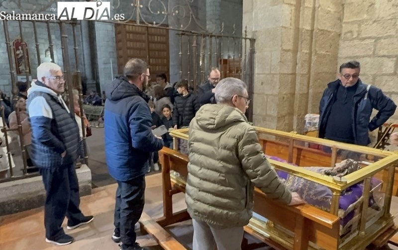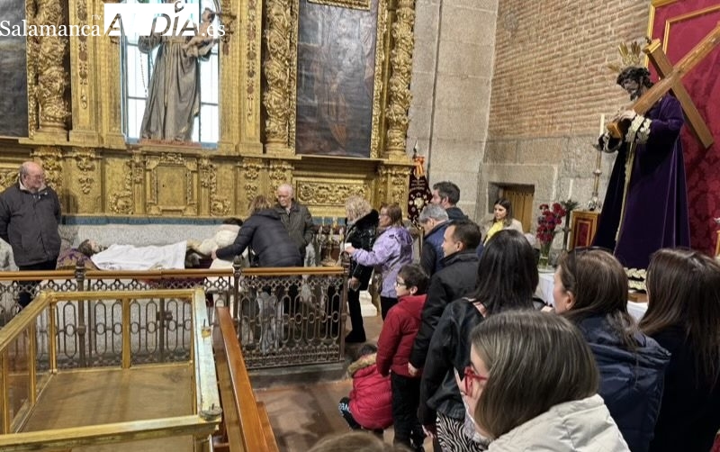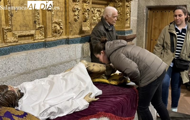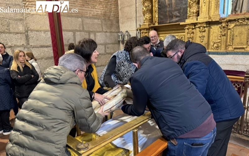 El Santo Cristo también ha vivido otra novedad, ya que desde hoy estrena túnica blanca bordada, prenda con la que ha sido vestido, mientras los devotos preparaban los pañuelos y las peticiones para el masivo besapiés con el que concluía esta esperada cita en la previa de la Semana Santa peñarandina.