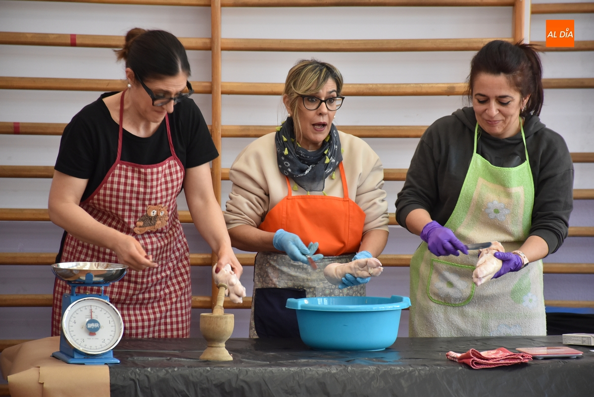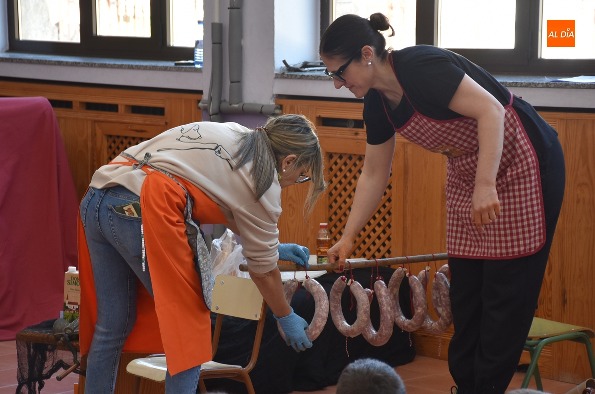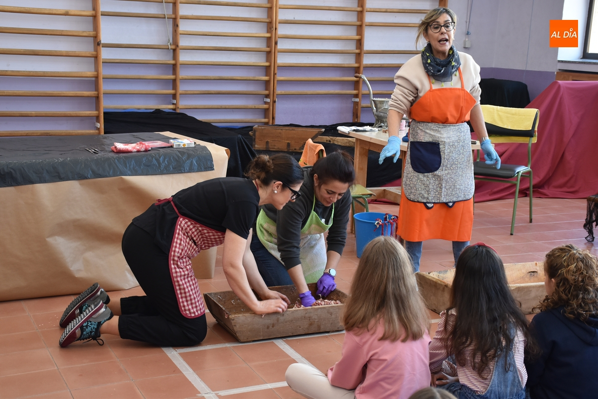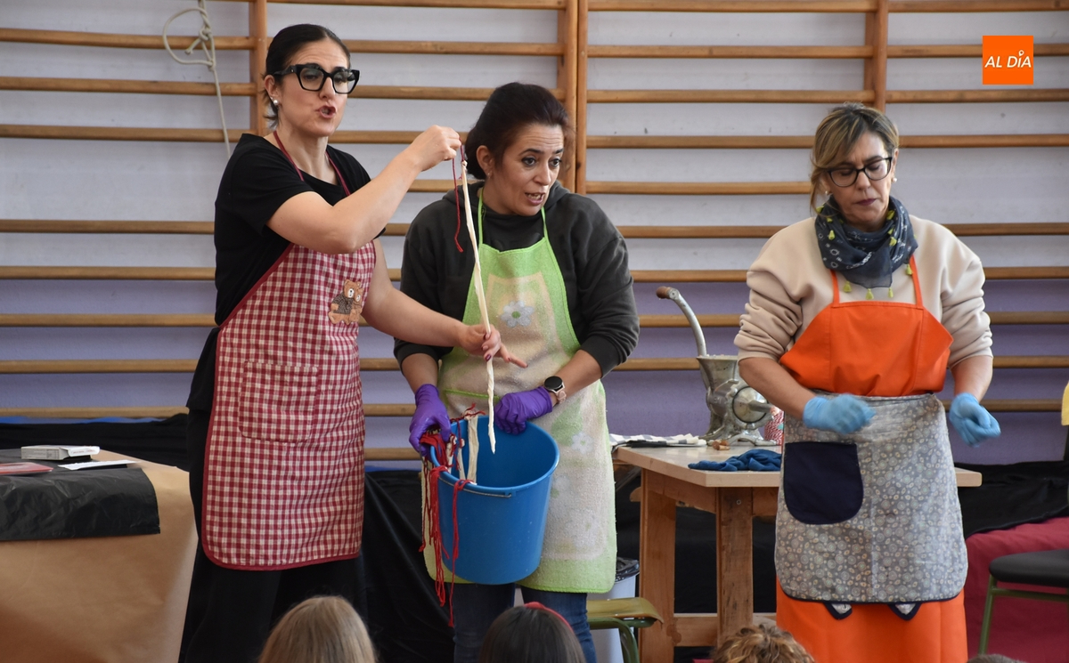Esas tres profesoras se ataviaron de mondongueras para recrear ante los alumnos de todos los niveles (en varias sesiones) la matanza tradicional, llevando a cabo en vivo varias de las tareas, como la limpieza de las pezuñas y las tripas, el amasado de la carne (explicando sus ingredientes) y su posterior enfusado, hasta acabar colgando varios chorizos y salchichones en unos varales.