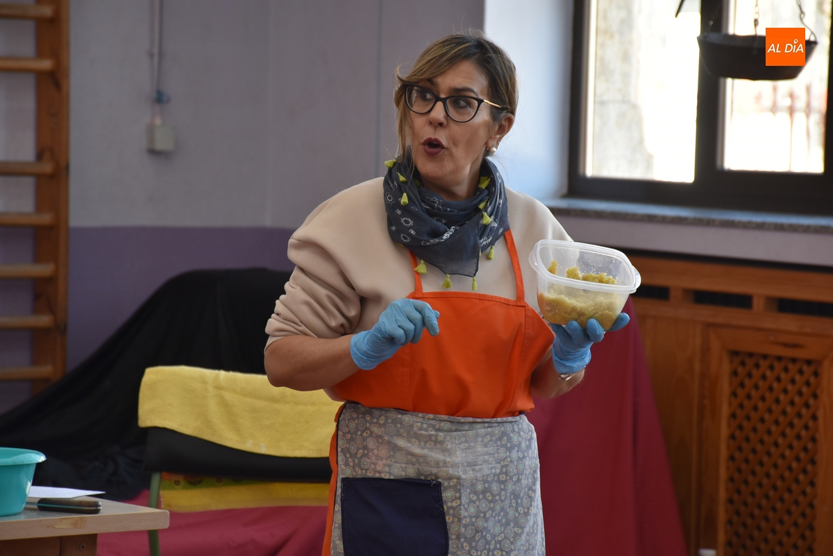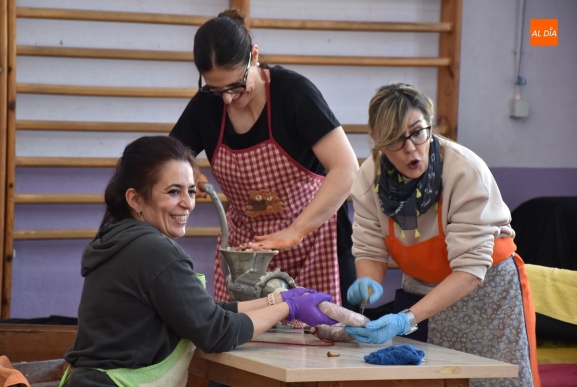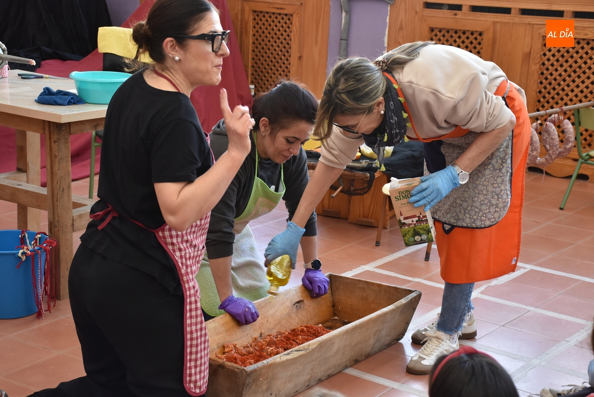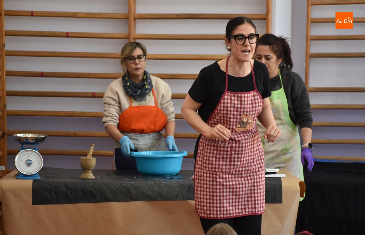 Esas tres profesoras se ataviaron de mondongueras para recrear ante los alumnos de todos los niveles (en varias sesiones) la matanza tradicional, llevando a cabo en vivo varias de las tareas, como la limpieza de las pezuñas y las tripas, el amasado de la carne (explicando sus ingredientes) y su posterior enfusado, hasta acabar colgando varios chorizos y salchichones en unos varales.