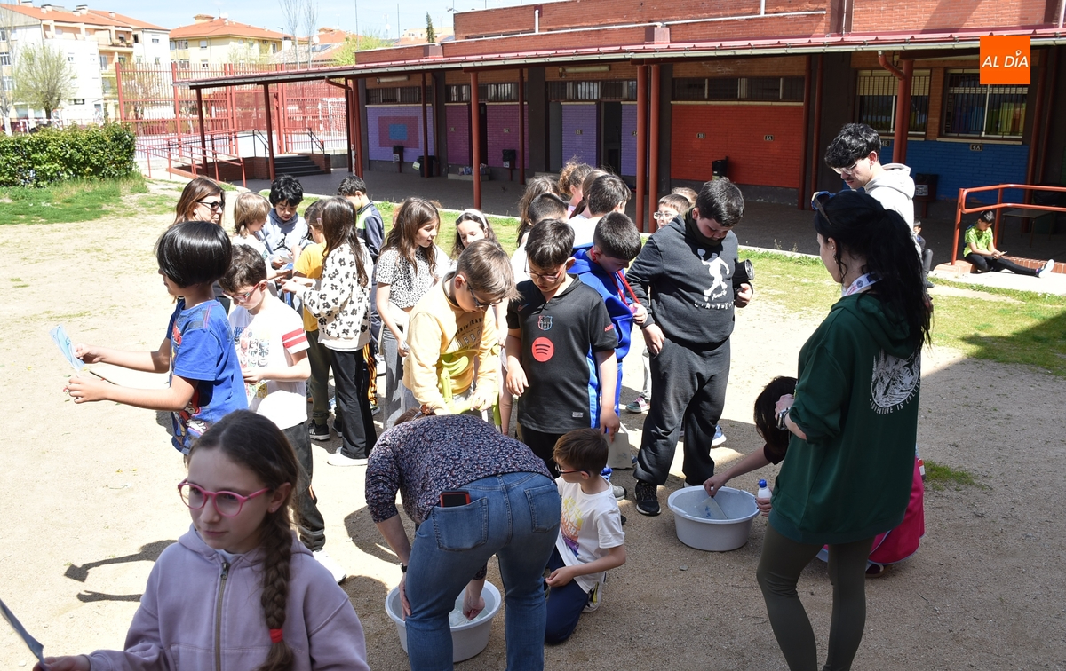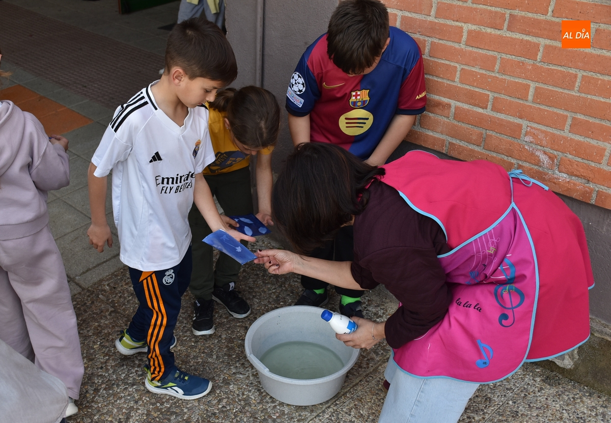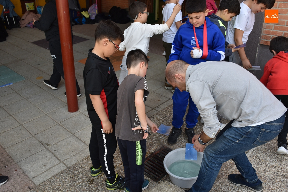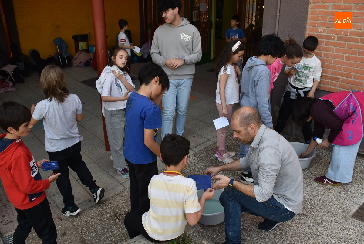 De la mano de la Filmoteca de Castilla y León, la actividad que llevaron a cabo en la mañana del martes los alumnos de 3º y 4º de Primaria (este miércoles la desarrollarán el resto de grupos de Primaria) fue un taller de impresión de fotos al sol, con la vieja técnica de la cianotipia, que fue inventada hace más de 200 años, con el objetivo inicial de hacer como ‘fotocopias’.