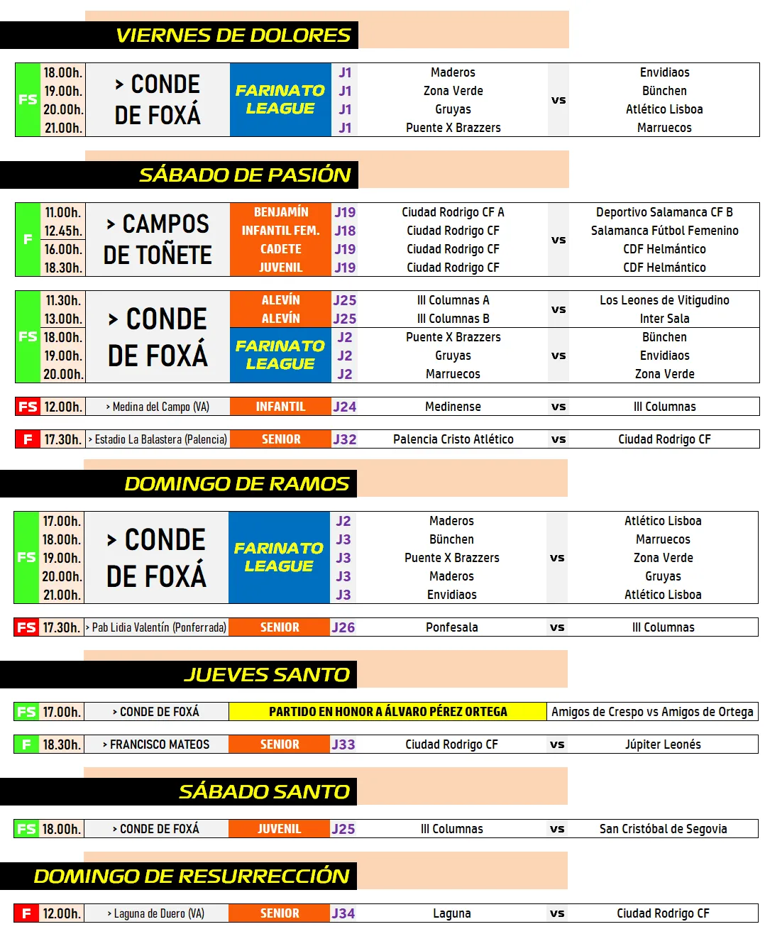 La Semana Santa trae este año una potente /AD, comenzando este mismo viernes con el arranque en Conde de Foxá de la 3ª Farinato League de Fútbol Sala, que este año irá hasta el Martes Santo: la fase de grupos se prolongará hasta el Domingo de Ramos, el Lunes Santo se jugarán las semifinales y el Martes Santo la final.