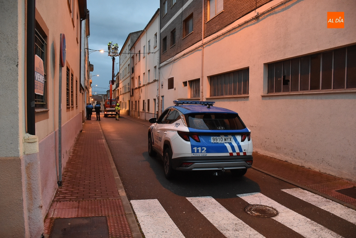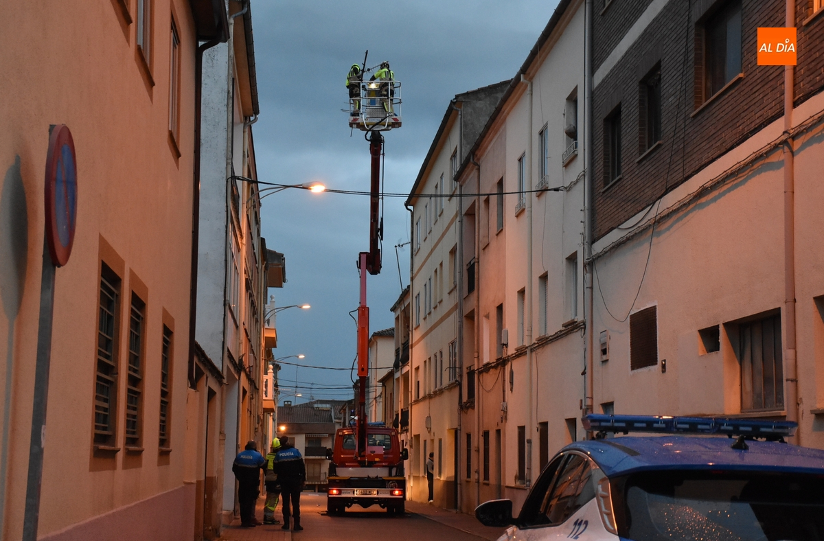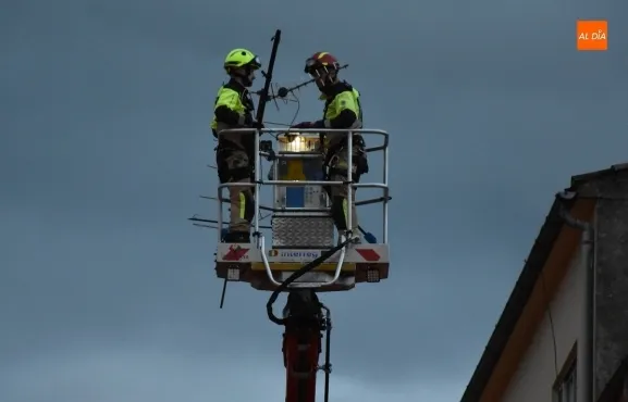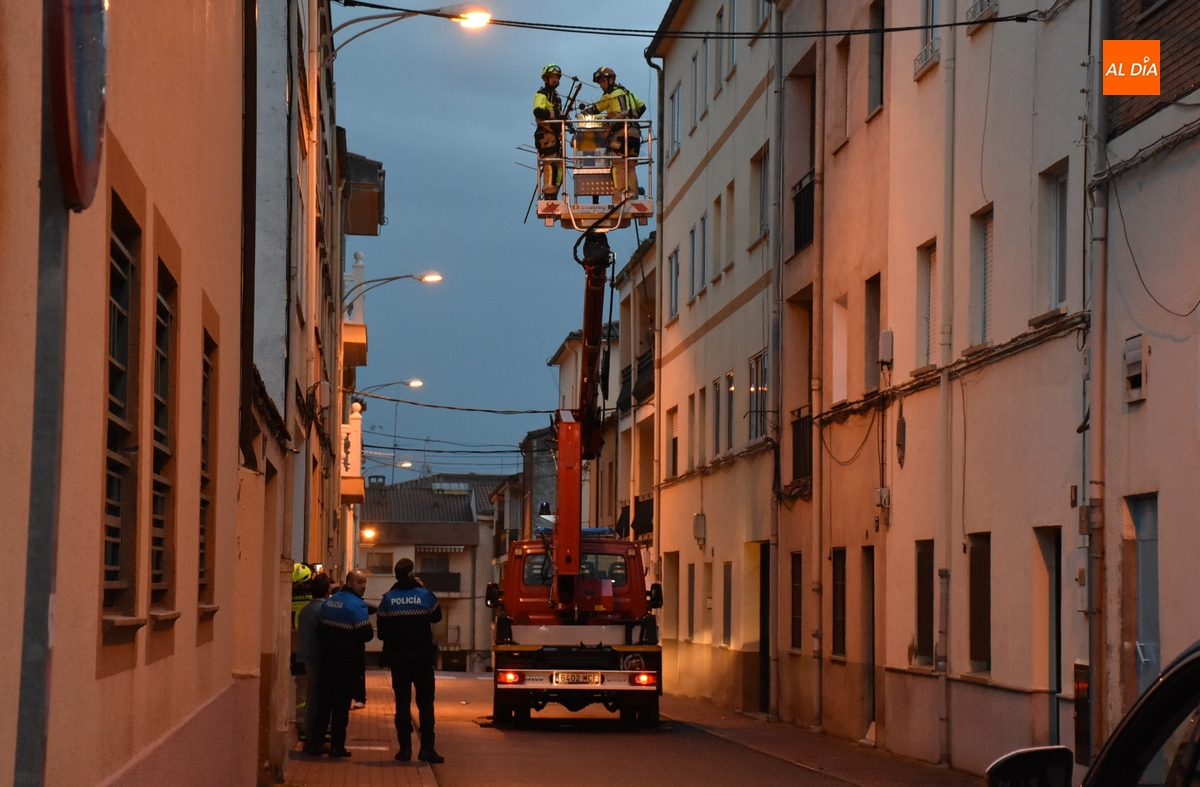 Coincidiendo con el anochecer, los Bomberos tuvieron que movilizarse en la jornada del viernes ante el serio riesgo que entrañaba una antena de televisión en lo alto de un inmueble en la calle San Marcial de Ciudad Rodrigo, en el barrio de Santa Ana.