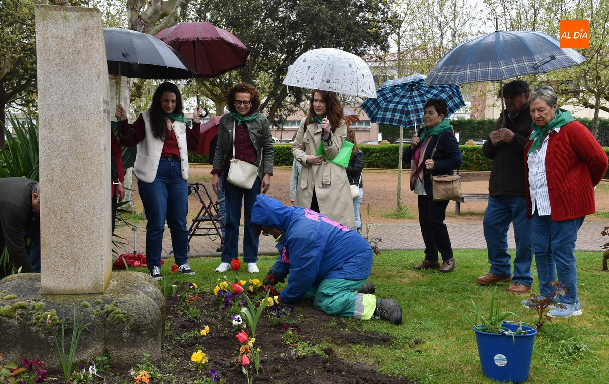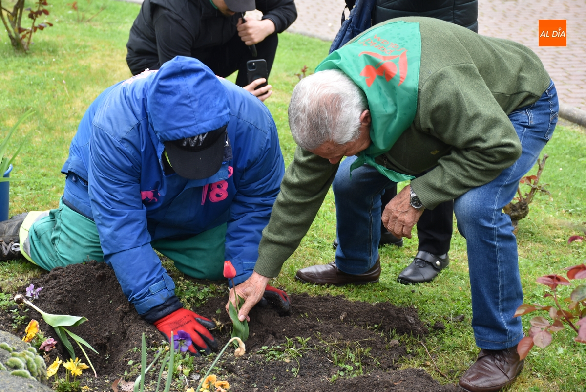 Con la colaboración de un jardinero municipal, se abrieron una serie de huecos en el entorno del monolito existente en recuerdo de las víctimas del coronavirus, en los cuales posteriormente los propios afectados por el Parkinson fueron introduciendo los tulipanes.