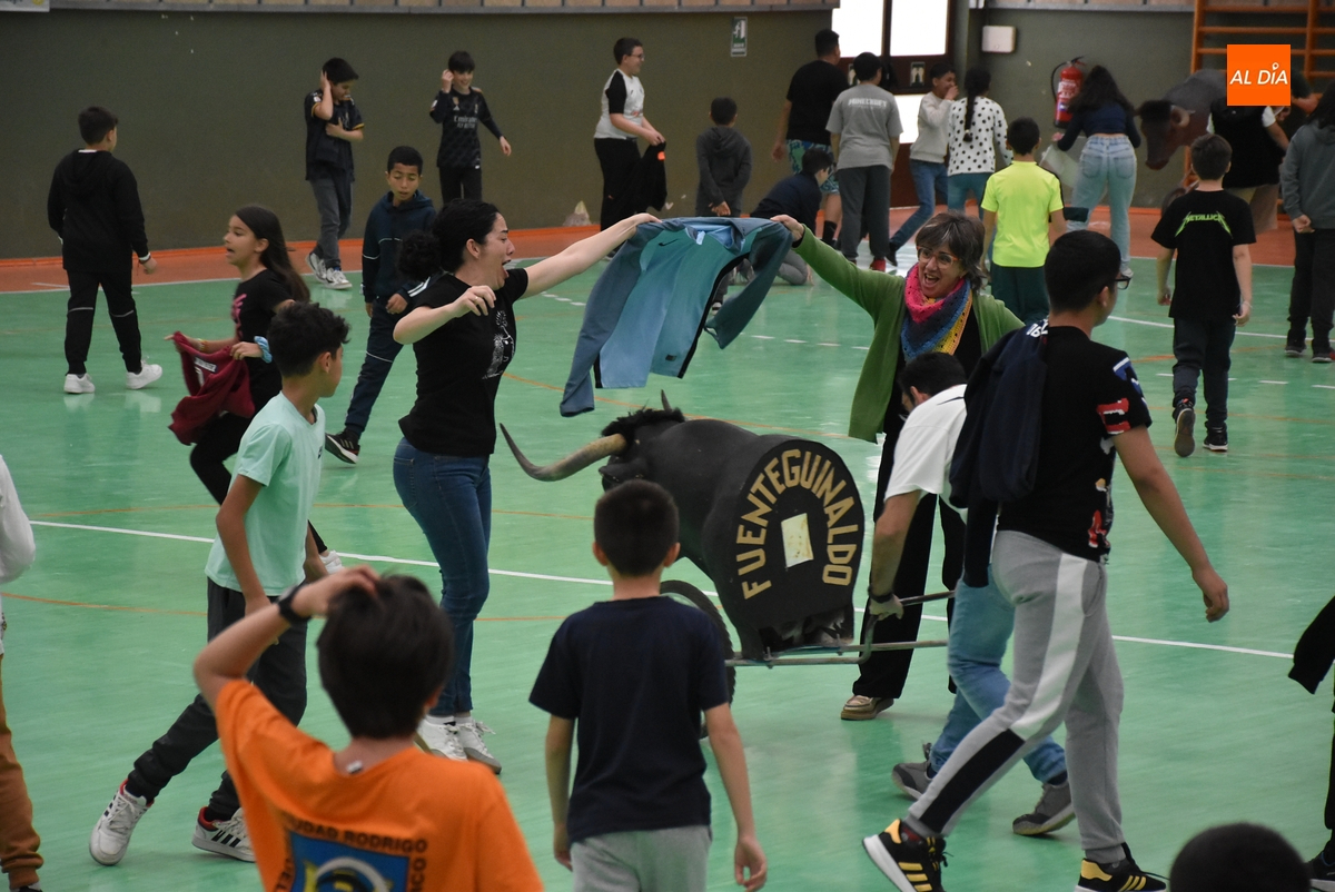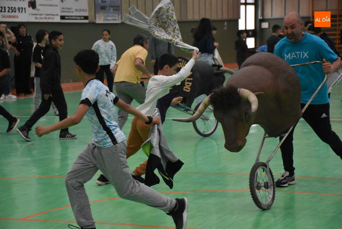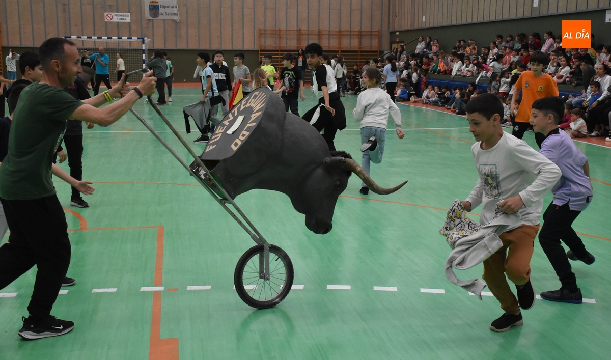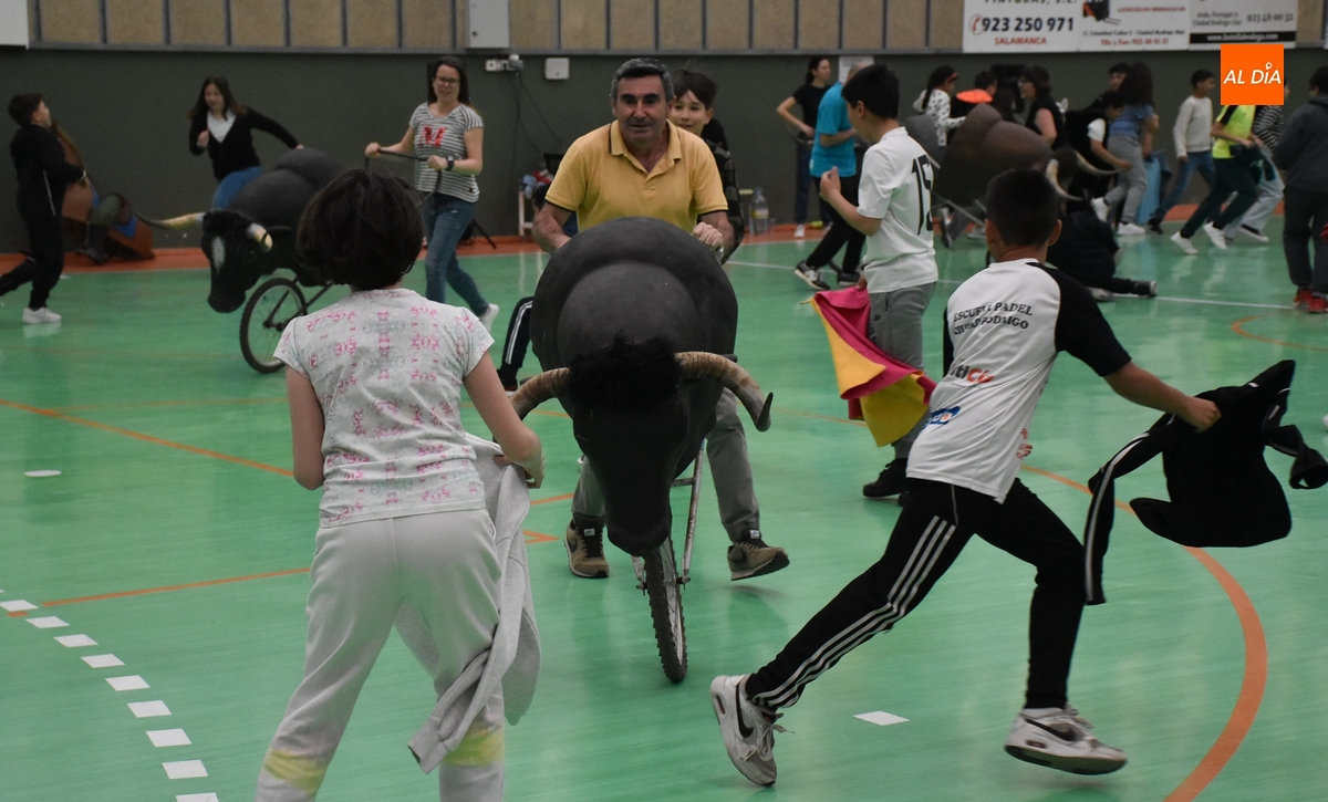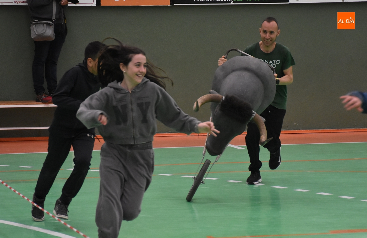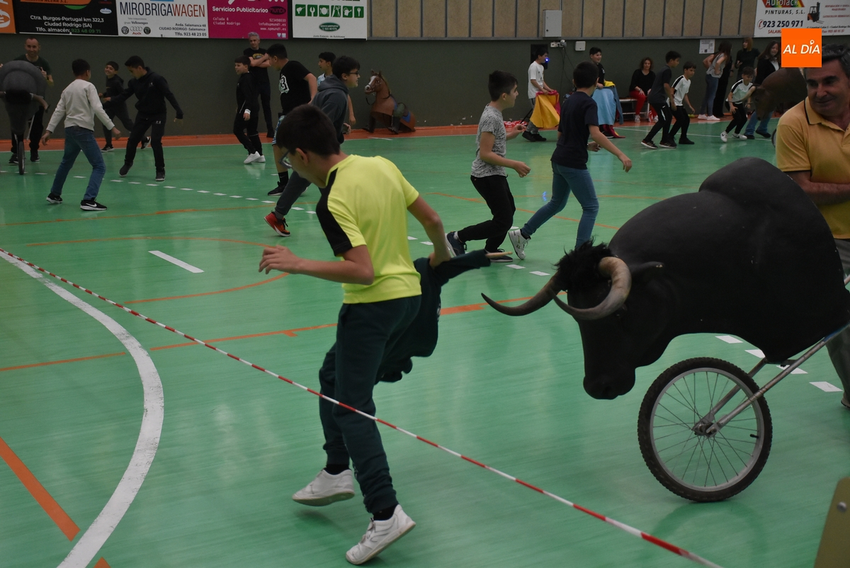 La primera actividad en el Pabellón consistió en un encierro, para lo cual se contó con varios astados procedentes de Fuenteguinaldo, que corrieron delante de todos los que se quisieron medir a ellos, en distintas tandas por niveles educativos (este encierro también contó con ‘caballistas’). Para que no faltase ningún detalle, durante el tiempo de celebración de estas carreras estuvo sonando La Campana Gorda.