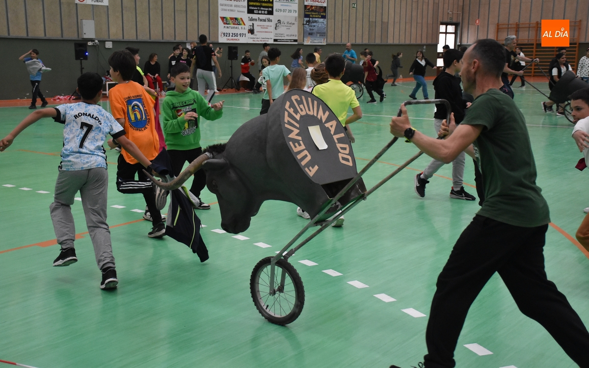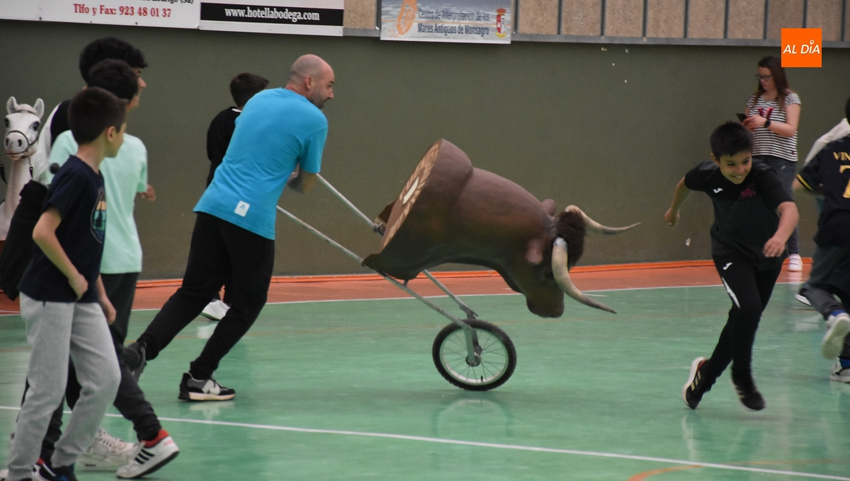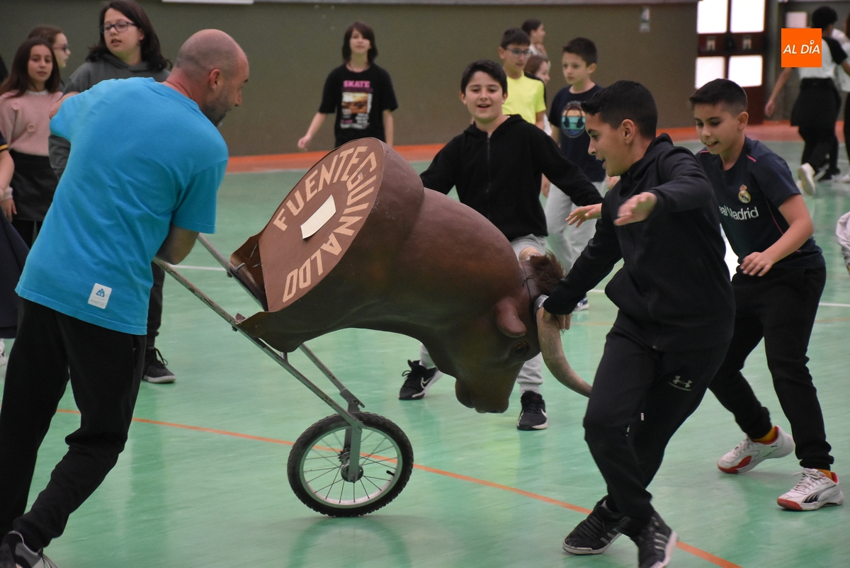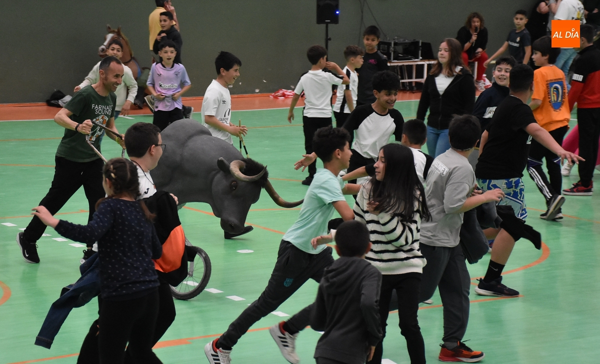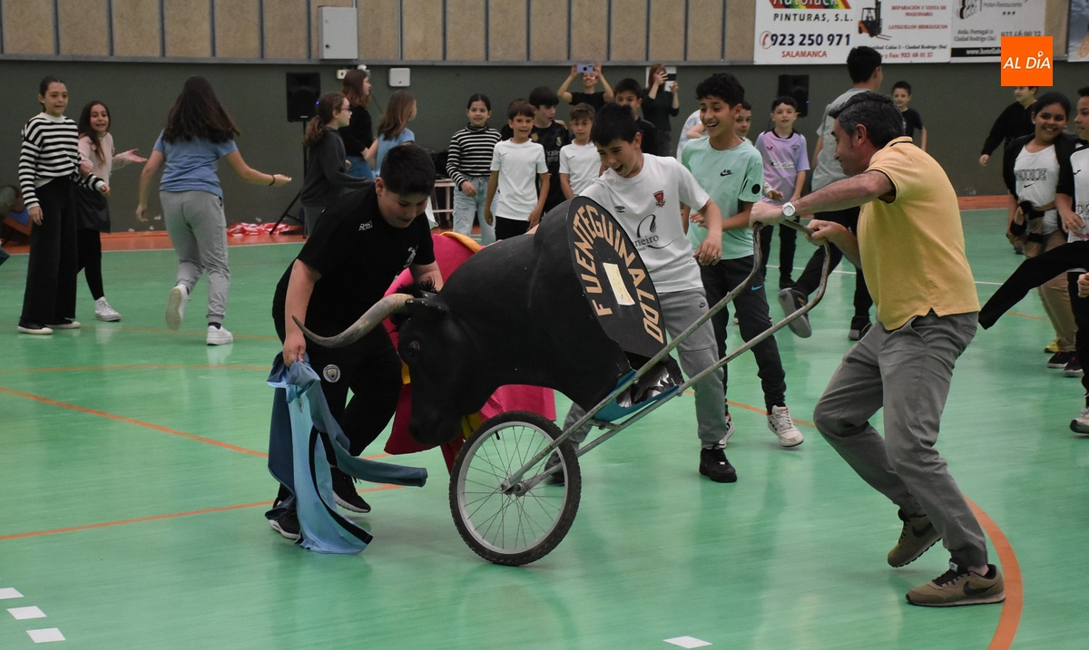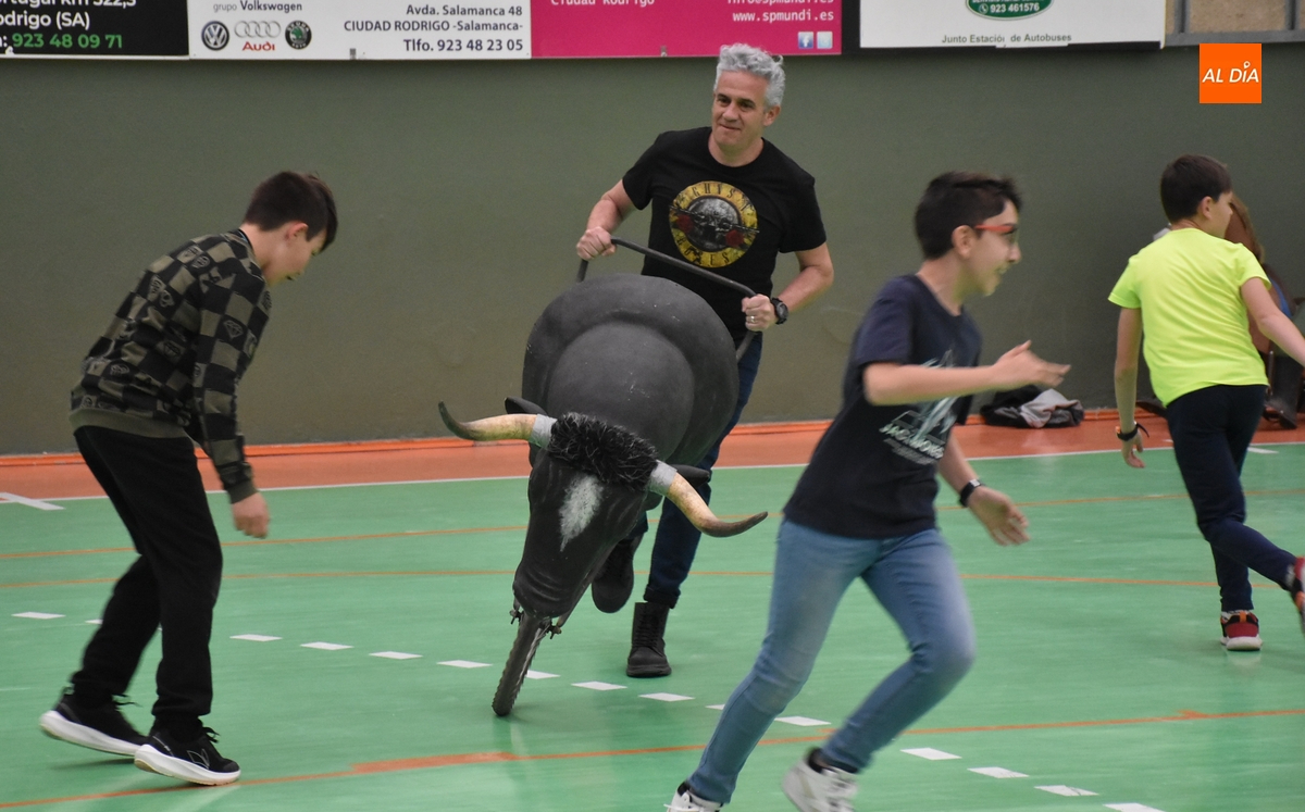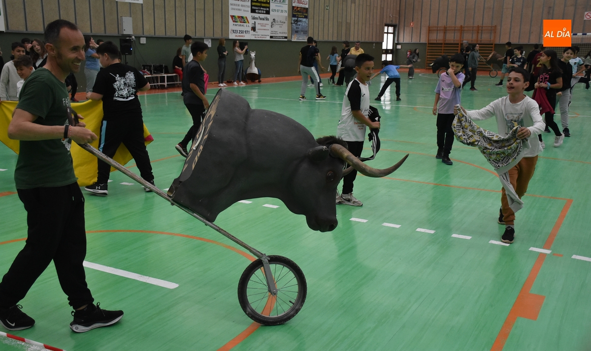 La primera actividad en el Pabellón consistió en un encierro, para lo cual se contó con varios astados procedentes de Fuenteguinaldo, que corrieron delante de todos los que se quisieron medir a ellos, en distintas tandas por niveles educativos (este encierro también contó con ‘caballistas’). Para que no faltase ningún detalle, durante el tiempo de celebración de estas carreras estuvo sonando La Campana Gorda.