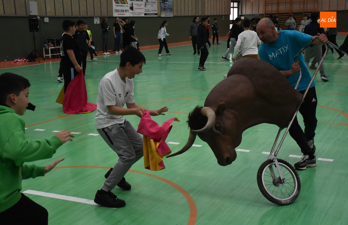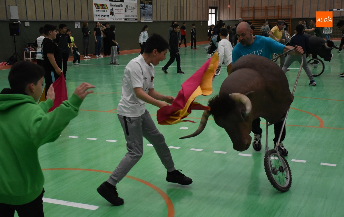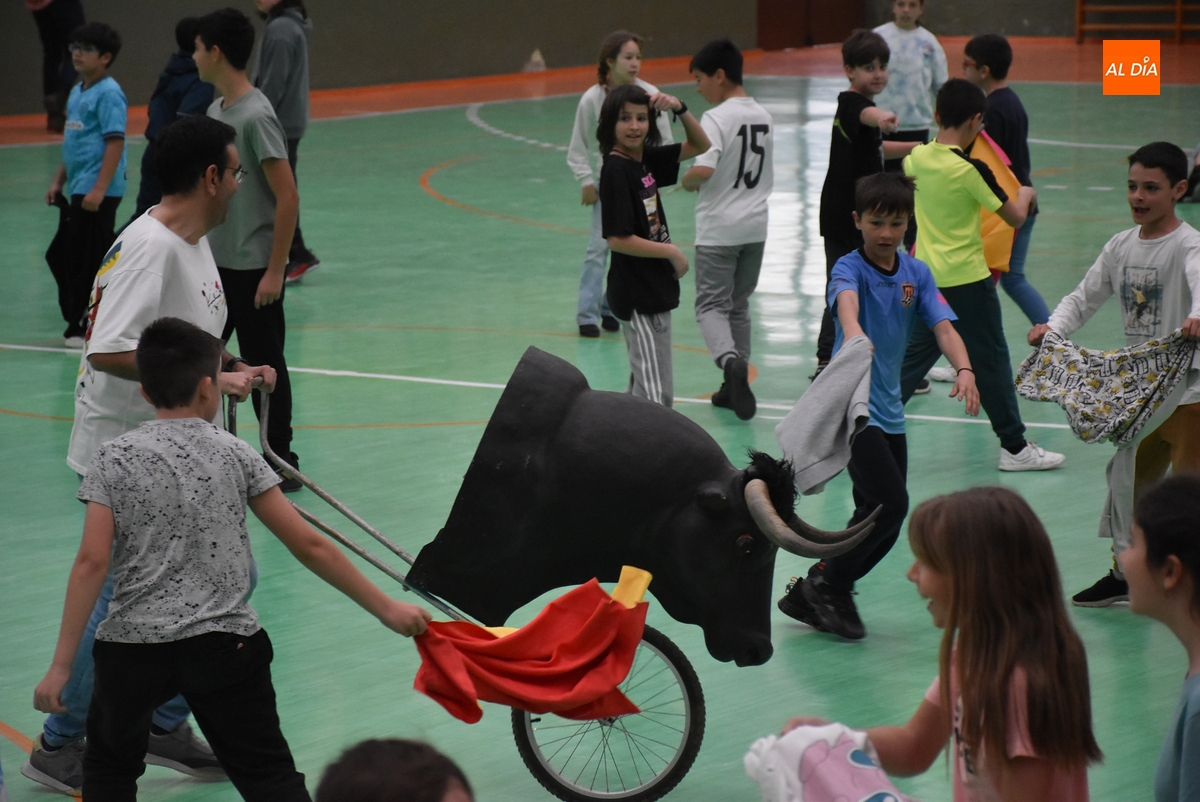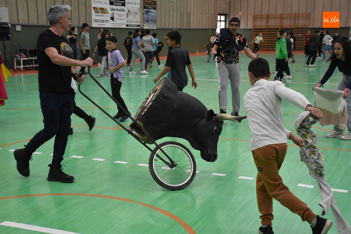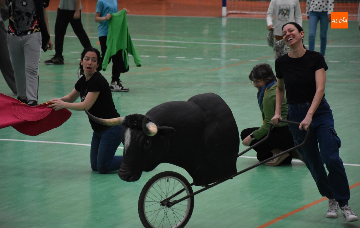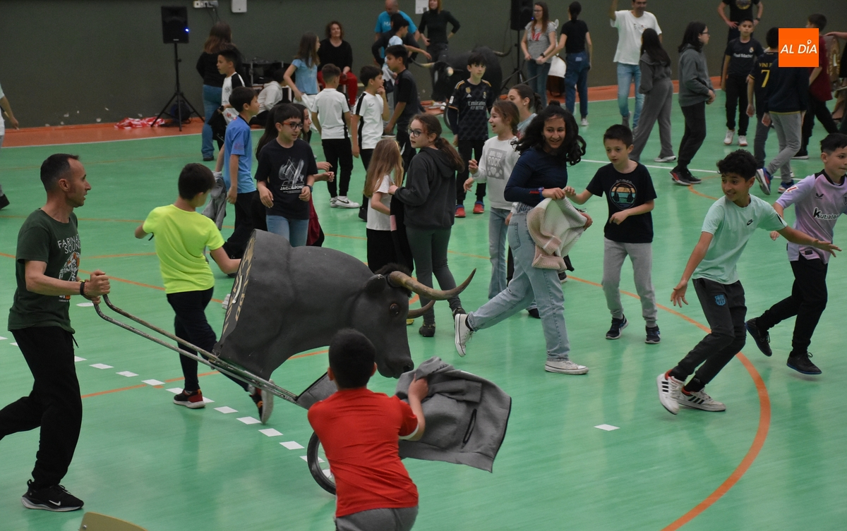 La primera actividad en el Pabellón consistió en un encierro, para lo cual se contó con varios astados procedentes de Fuenteguinaldo, que corrieron delante de todos los que se quisieron medir a ellos, en distintas tandas por niveles educativos (este encierro también contó con ‘caballistas’). Para que no faltase ningún detalle, durante el tiempo de celebración de estas carreras estuvo sonando La Campana Gorda.