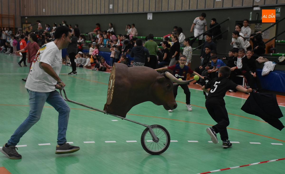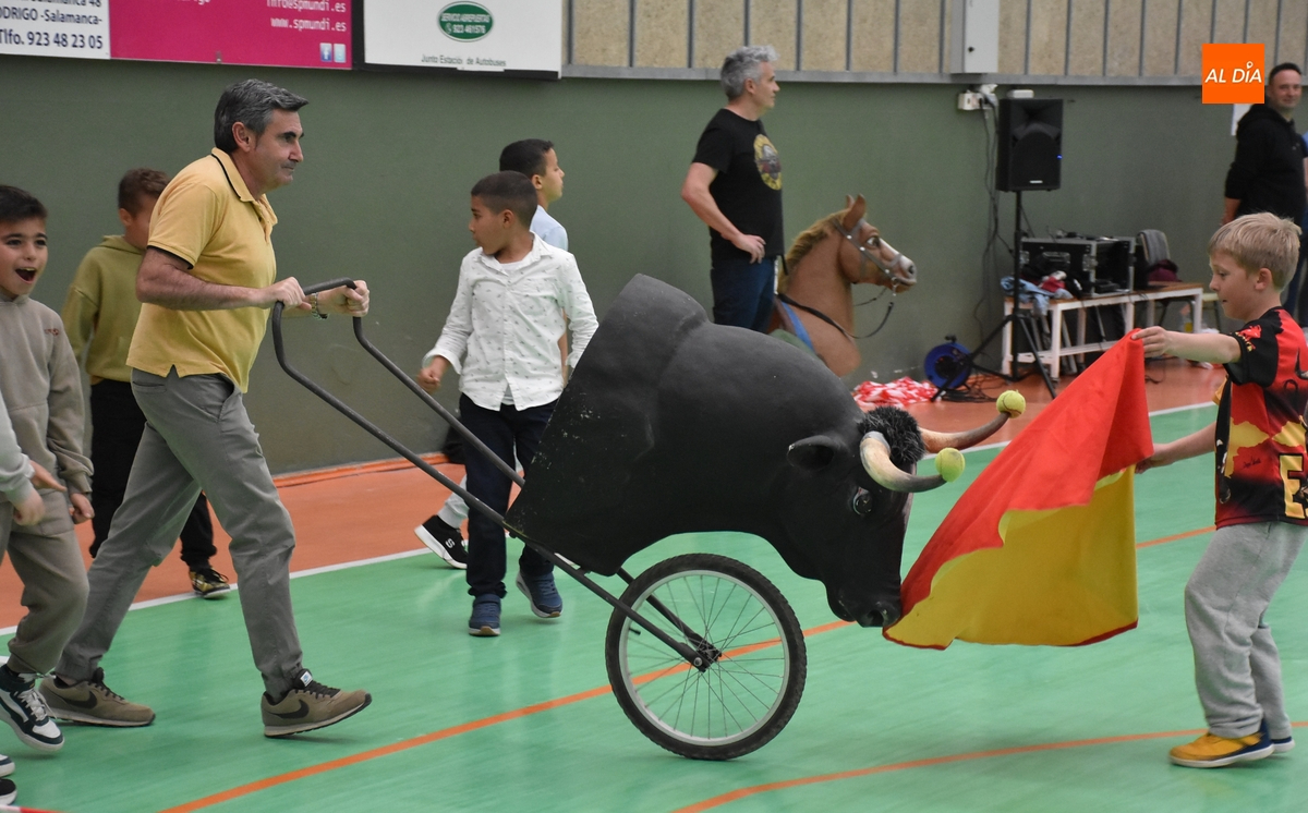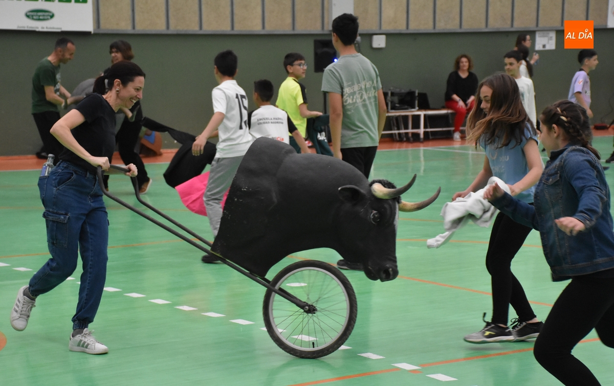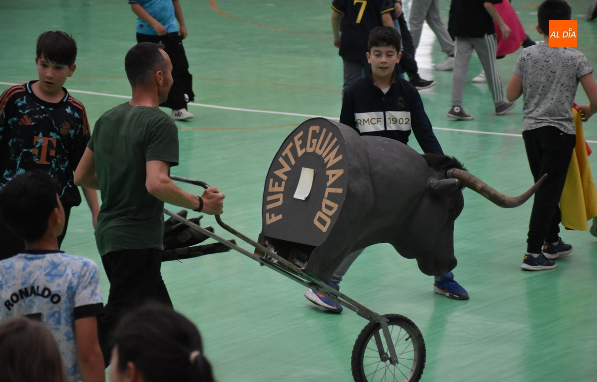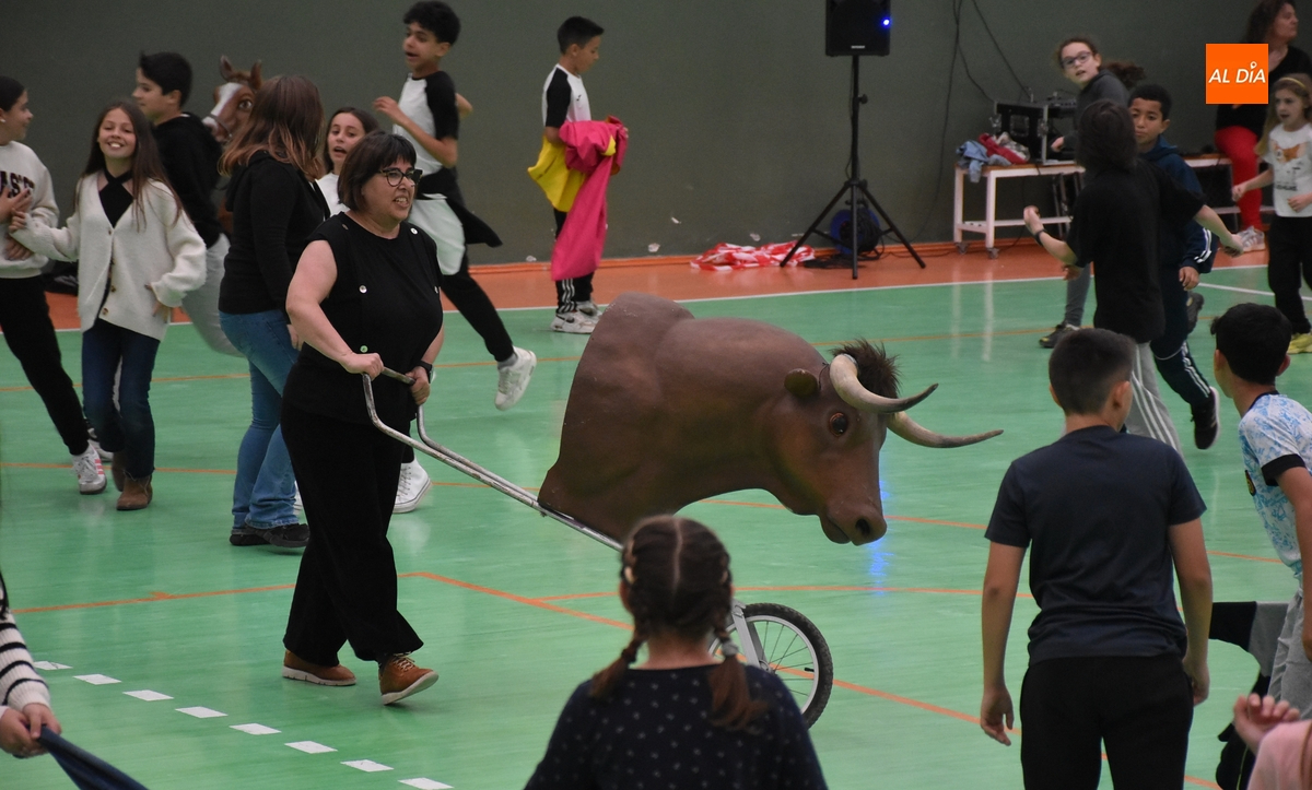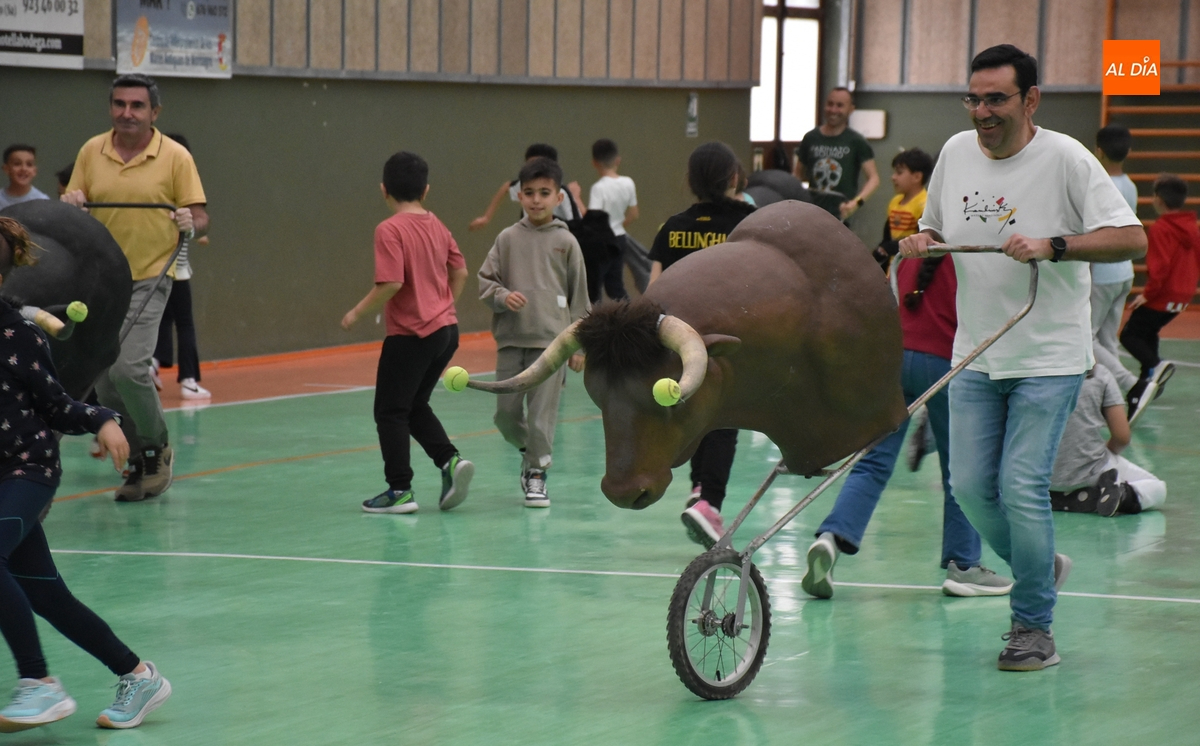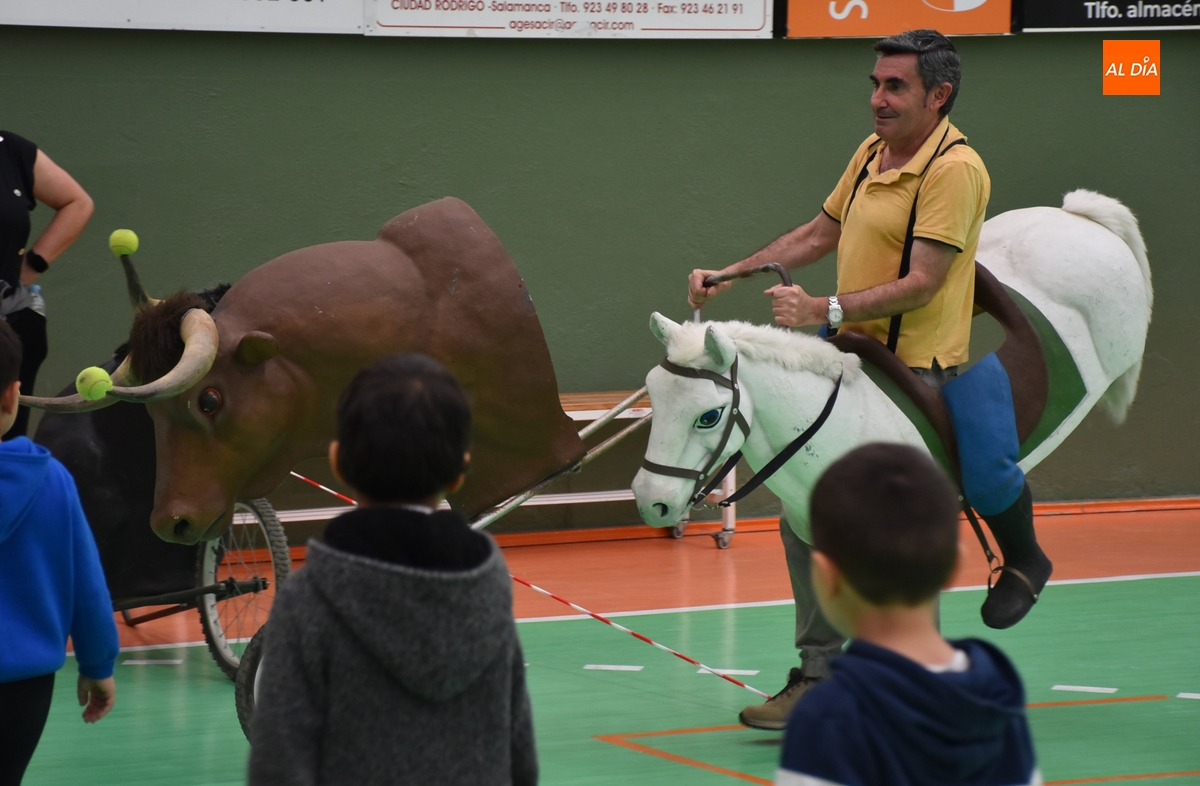 La primera actividad en el Pabellón consistió en un encierro, para lo cual se contó con varios astados procedentes de Fuenteguinaldo, que corrieron delante de todos los que se quisieron medir a ellos, en distintas tandas por niveles educativos (este encierro también contó con ‘caballistas’). Para que no faltase ningún detalle, durante el tiempo de celebración de estas carreras estuvo sonando La Campana Gorda.