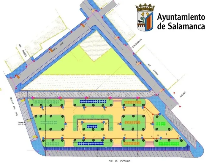 A mayores, junto con plazas de estacionamiento para vehículos, se creará con sus servicios una nueva calle peatonal paralela a la avenida de Salamanca que contará en su zona central de un área de descanso con banco corrido modular en forma de U. Anexa a esta área, se creará una nueva zona ajardinada de 3.361 metros cuadrados con riego automático, donde también se plantarán árboles en alineación y ejemplares arbustivos.