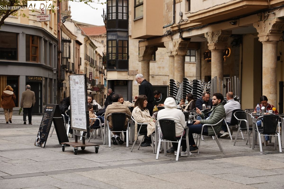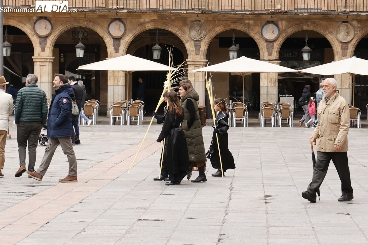 Buen ambiente en el centro de Salamanca este Domingo de Ramos. Desde primeras horas de la mañana y antes del arranque de las procesiones, ya se podía ver a numerosos salmantinos y turistas; por la tarde, se ha vivido un gran ambiente, no solo en los desfiles de Semana Santa, también en la Plaza Mayor y las terrazas.