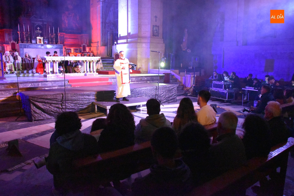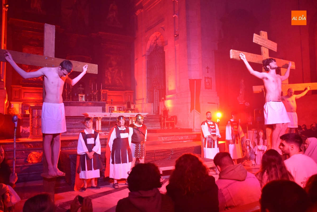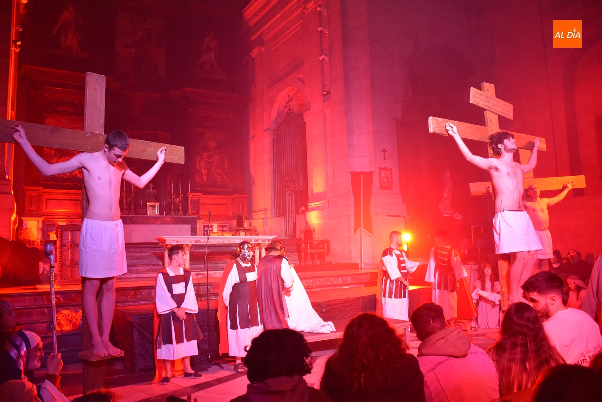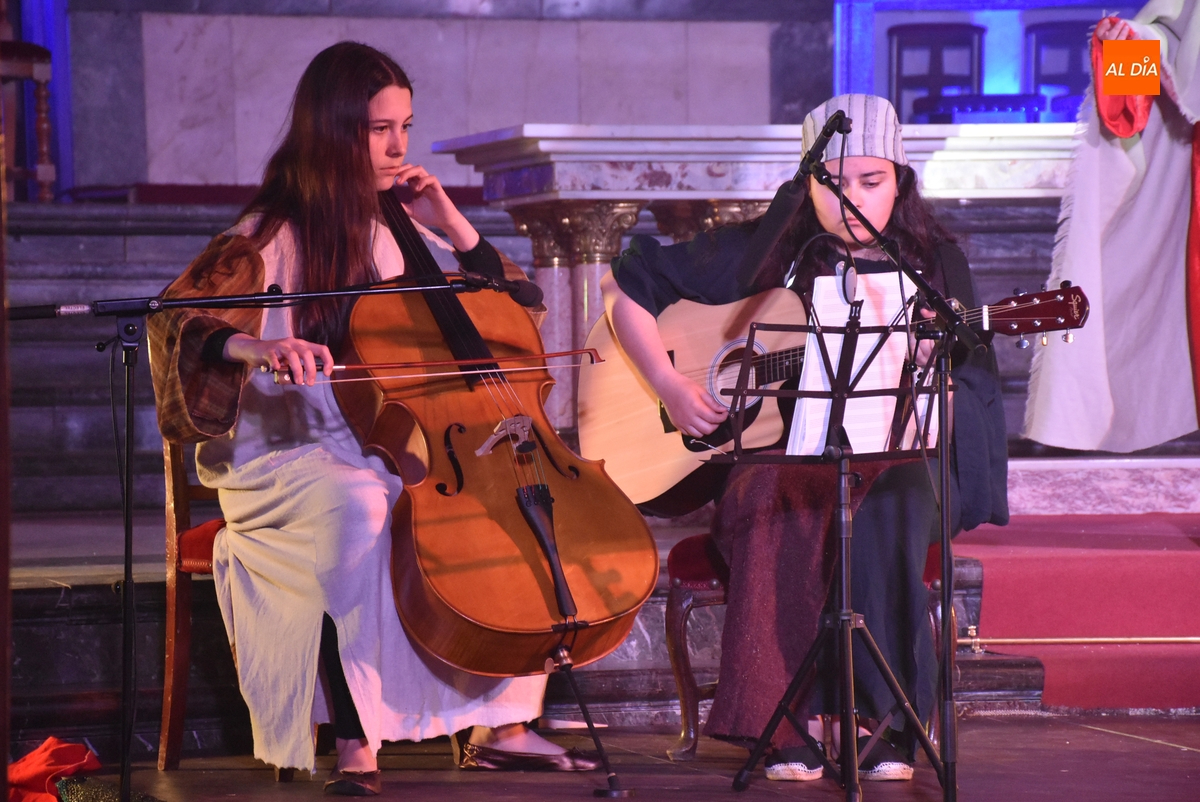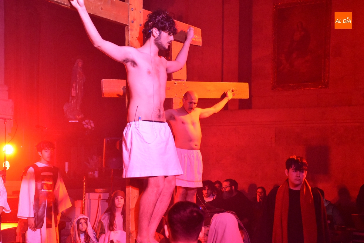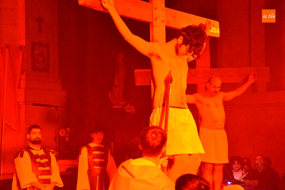 En los instantes finales de la representación también se contó con música en directo, cantando y tocando en el escenario colocado junto a las escaleras del altar de la Iglesia de Cerralbo, por la que se fueron moviendo los actores en las distintas escenas (se utilizaron todos los lugares visibles), con el momento culmen de la crucifixión en el centro de la Iglesia, tras el cual todavía quedó la parte correspondiente a la resurrección.