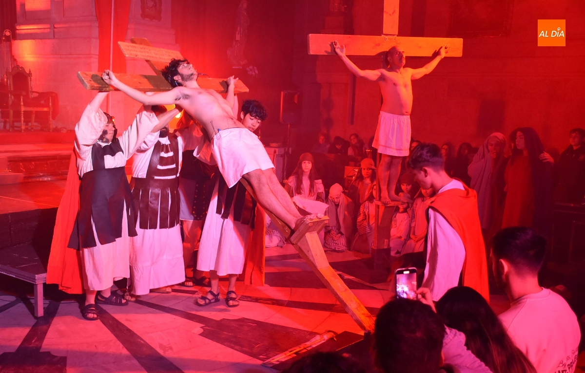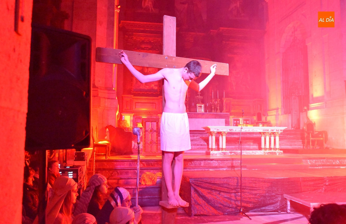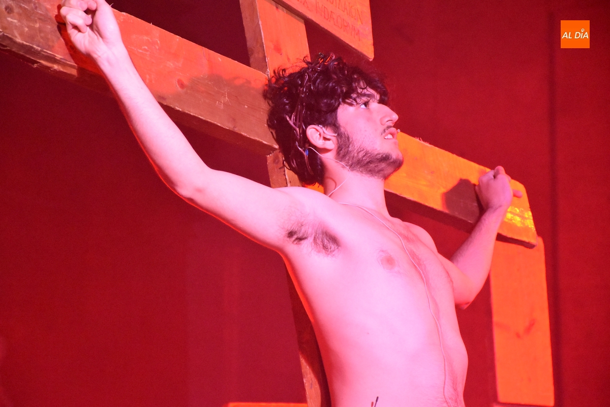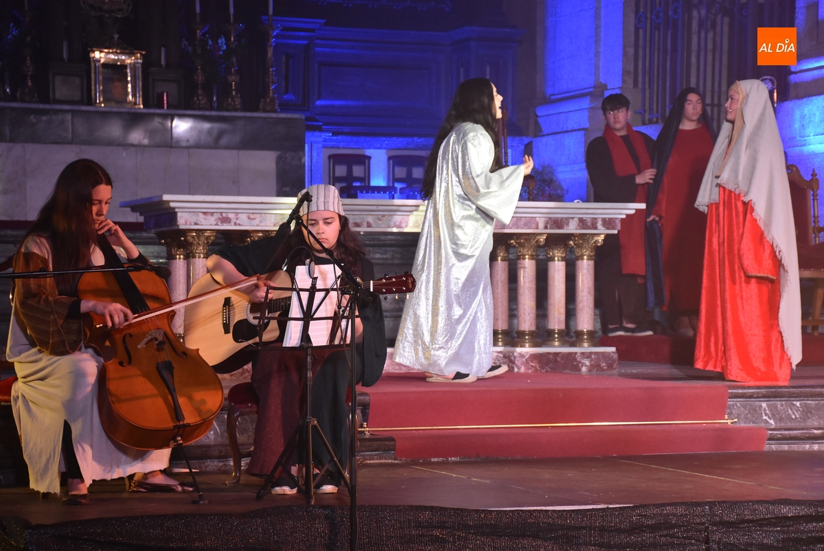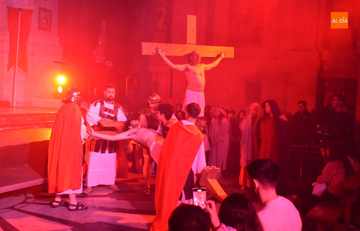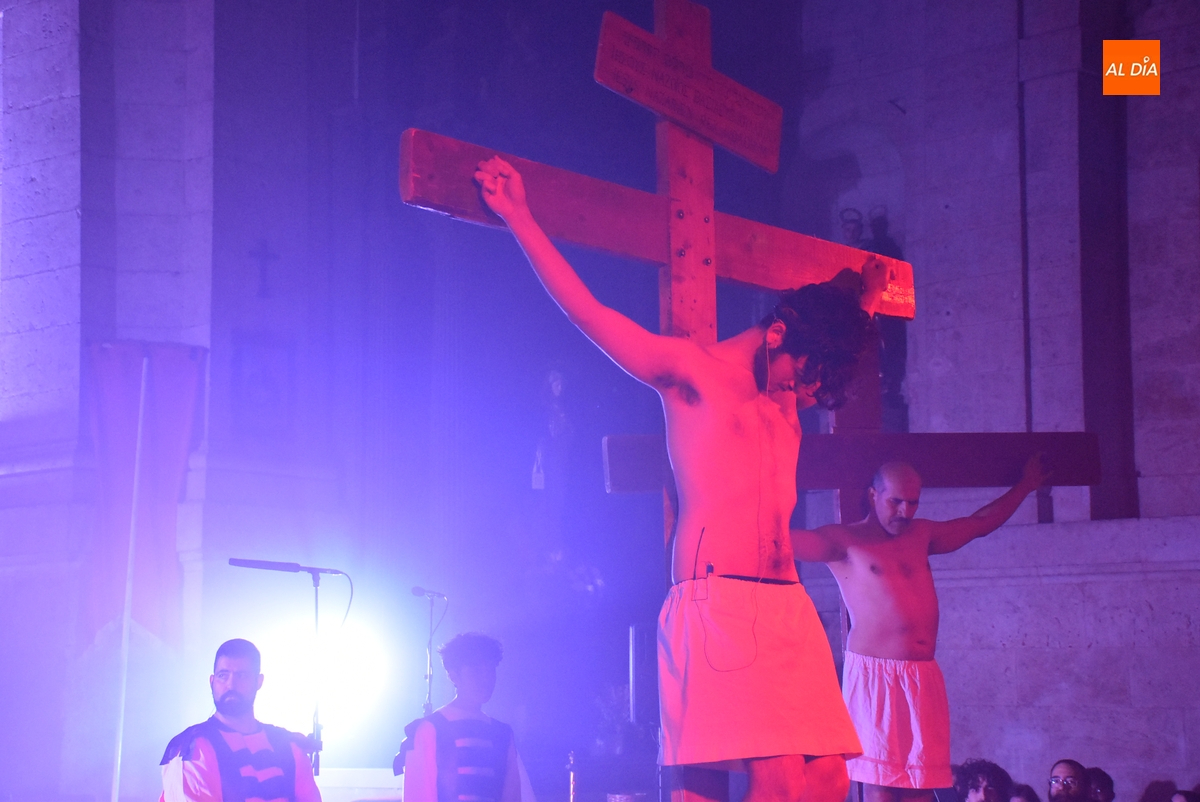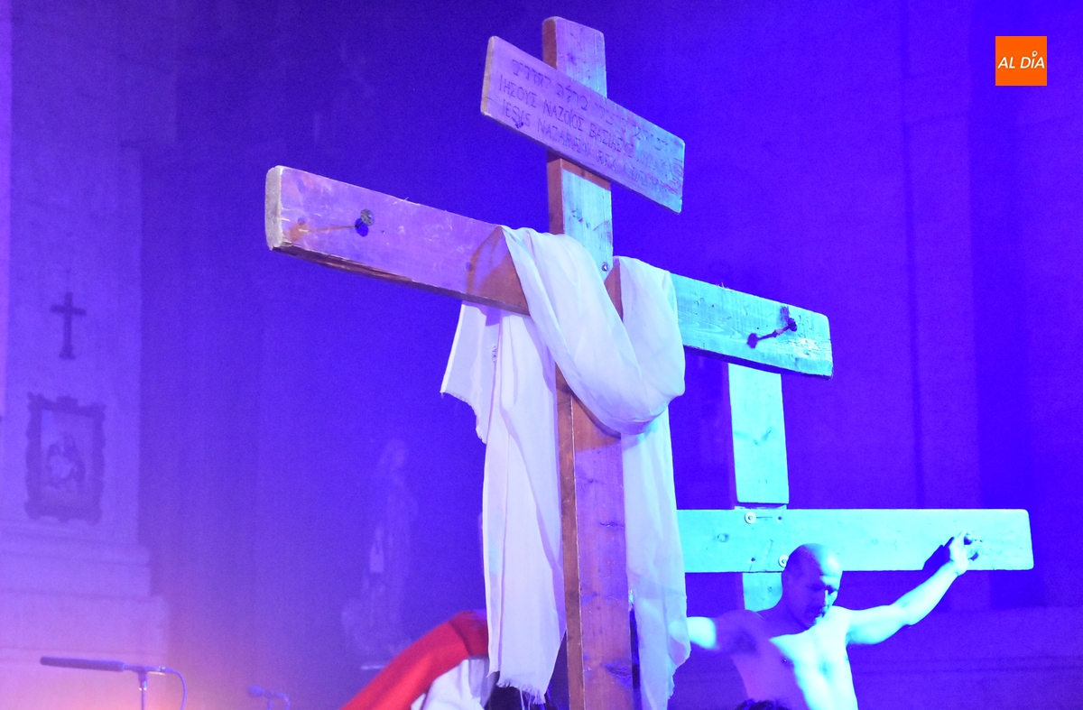 En los instantes finales de la representación también se contó con música en directo, cantando y tocando en el escenario colocado junto a las escaleras del altar de la Iglesia de Cerralbo, por la que se fueron moviendo los actores en las distintas escenas (se utilizaron todos los lugares visibles), con el momento culmen de la crucifixión en el centro de la Iglesia, tras el cual todavía quedó la parte correspondiente a la resurrección.