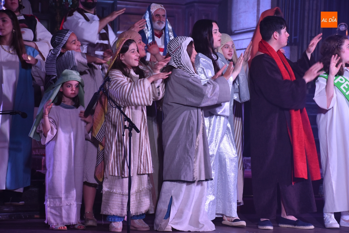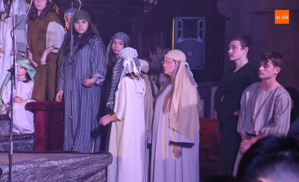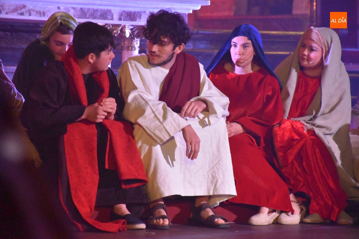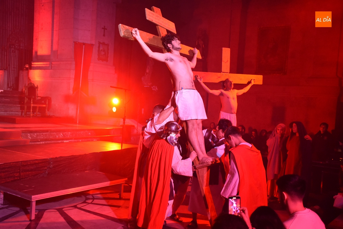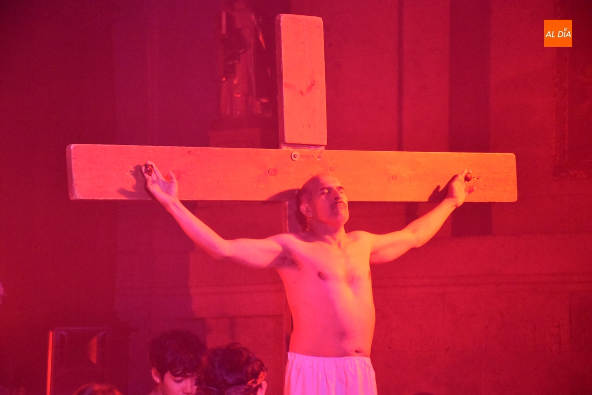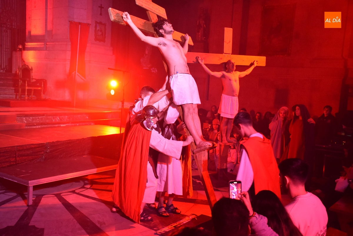 En los instantes finales de la representación también se contó con música en directo, cantando y tocando en el escenario colocado junto a las escaleras del altar de la Iglesia de Cerralbo, por la que se fueron moviendo los actores en las distintas escenas (se utilizaron todos los lugares visibles), con el momento culmen de la crucifixión en el centro de la Iglesia, tras el cual todavía quedó la parte correspondiente a la resurrección.